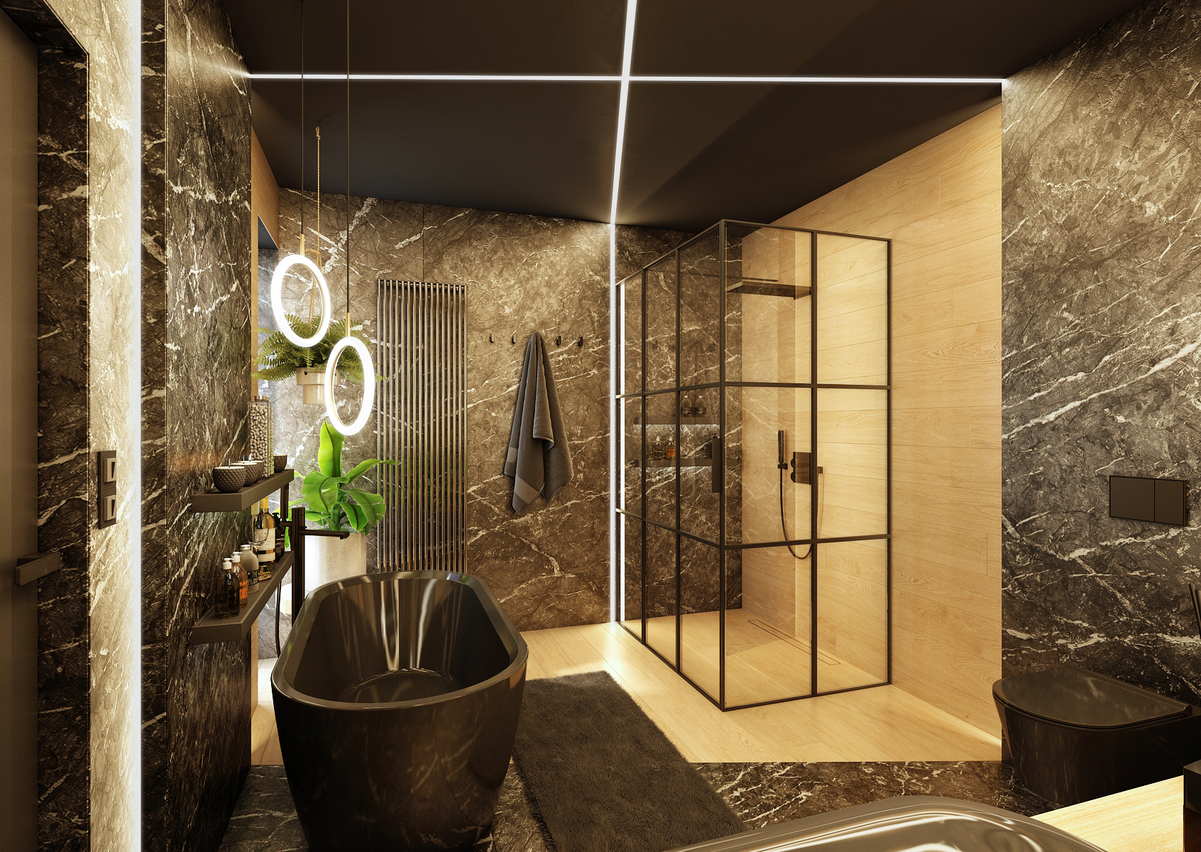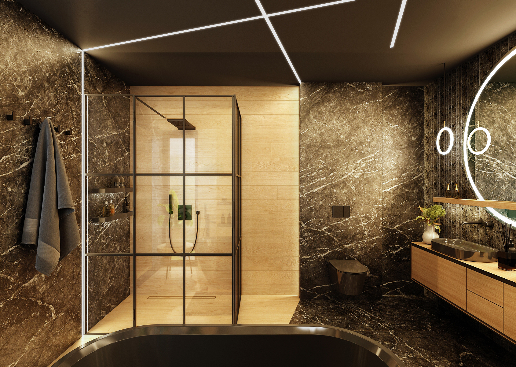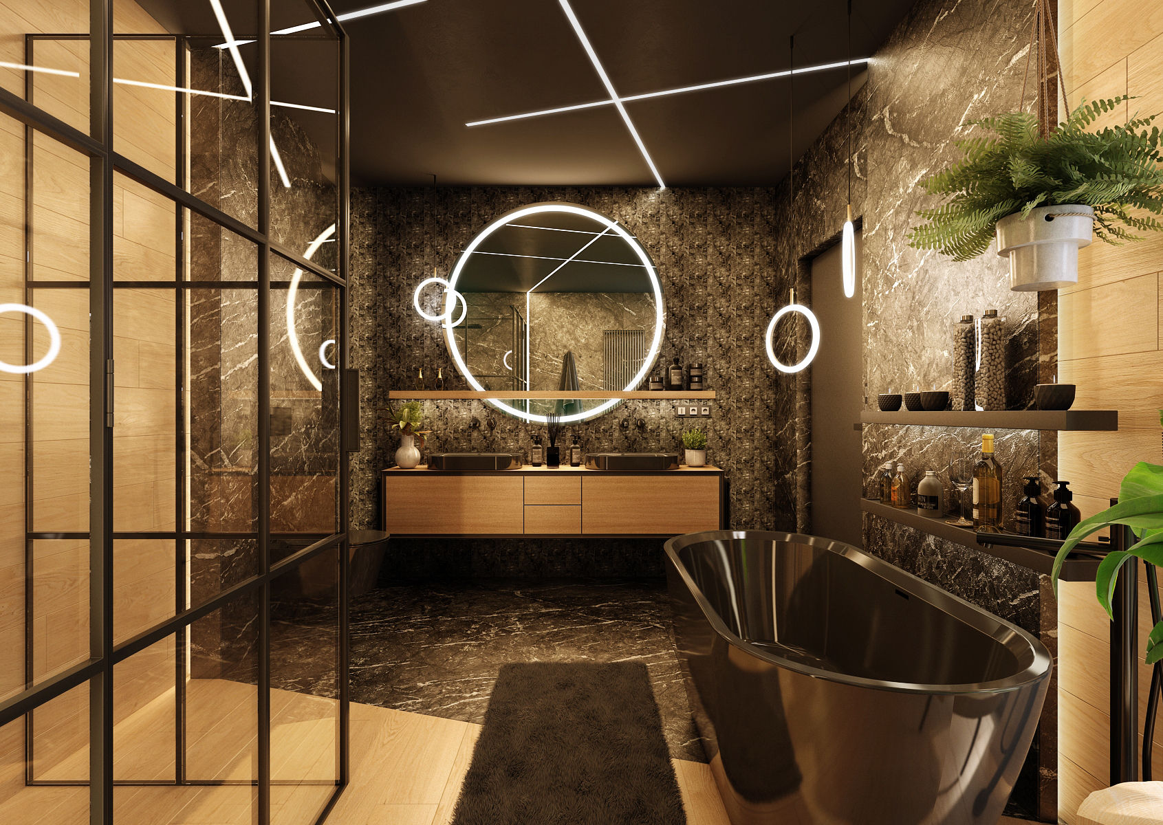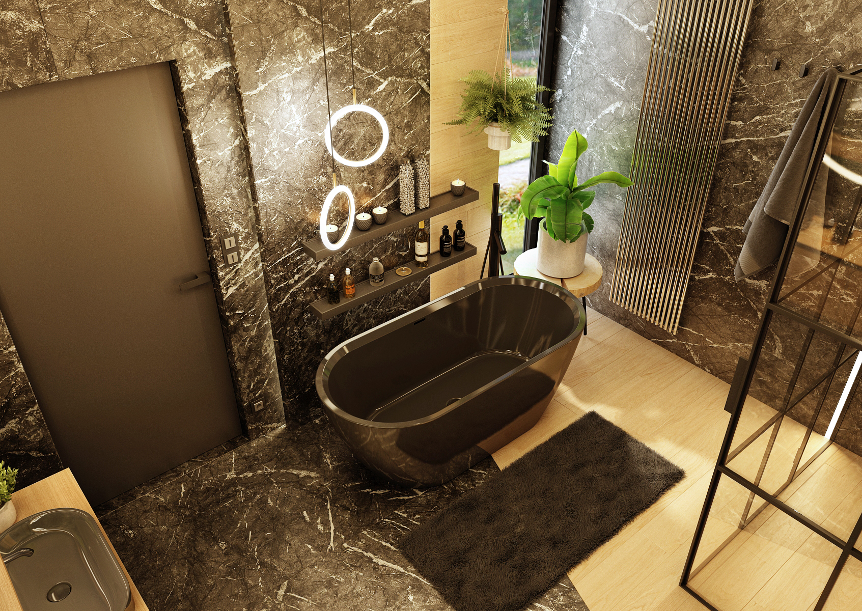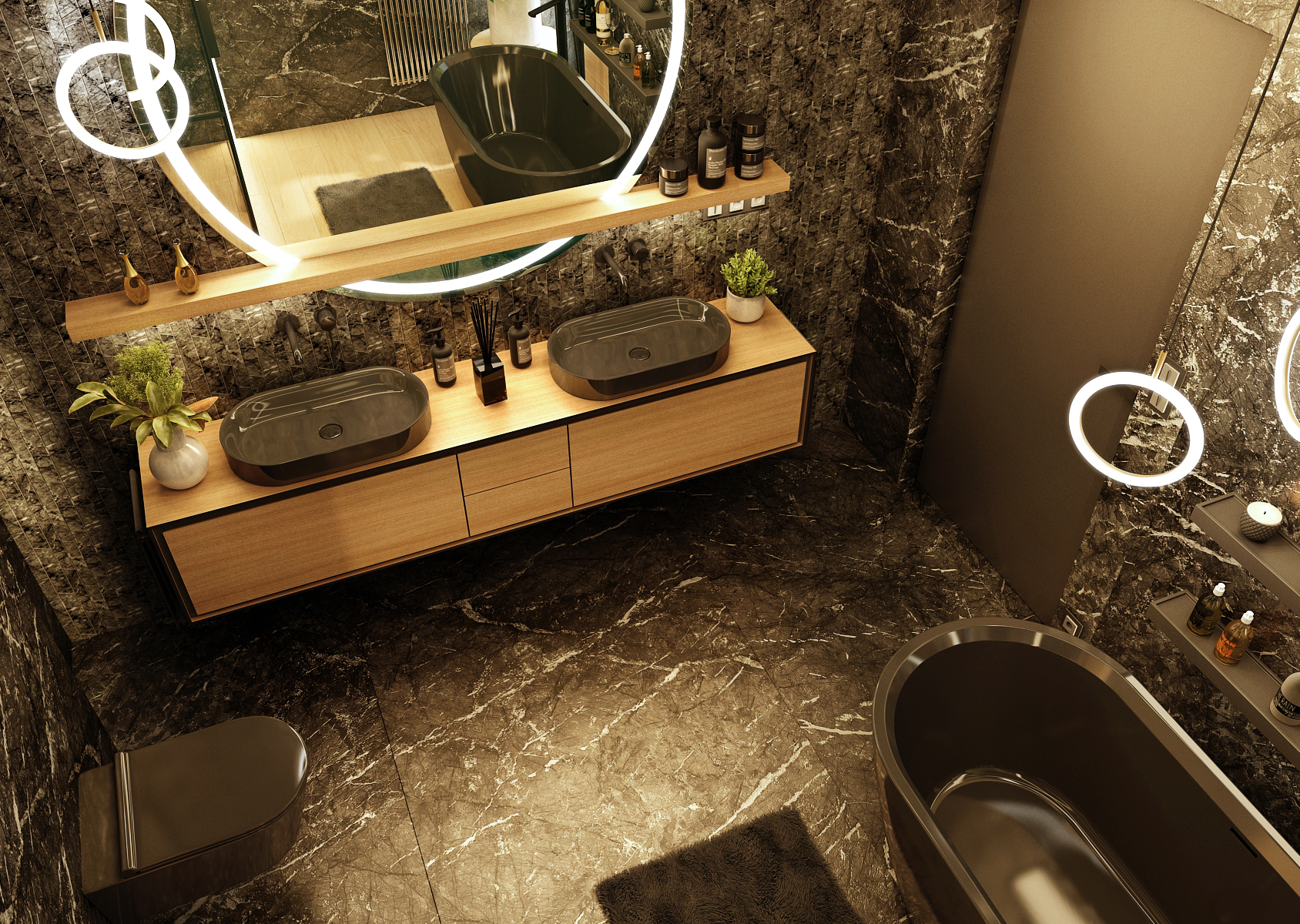Marble in the bathroom is a symbol of elegance and luxury. This impression is multiplied by the use of dark colors in combination with the original lighting of the room.