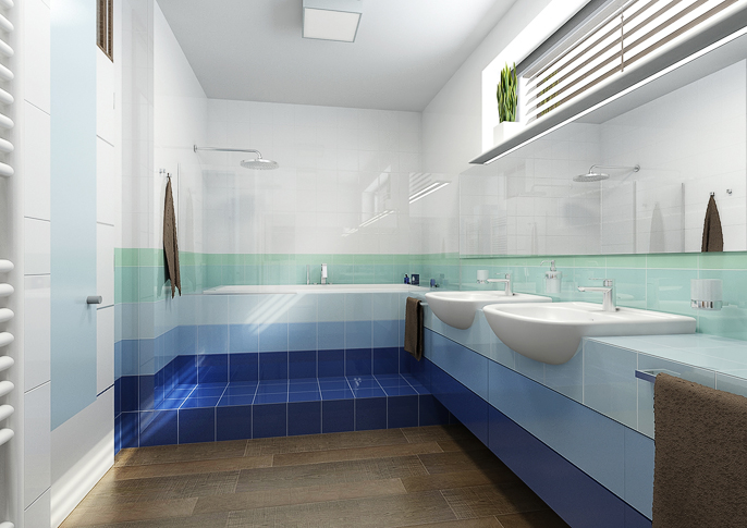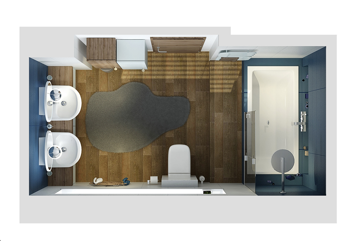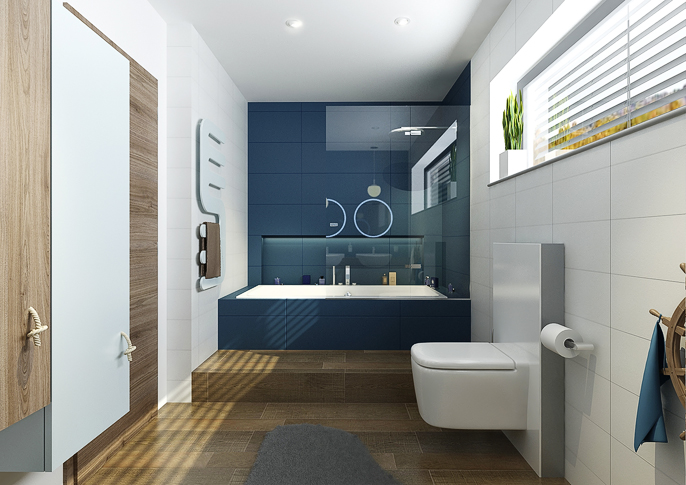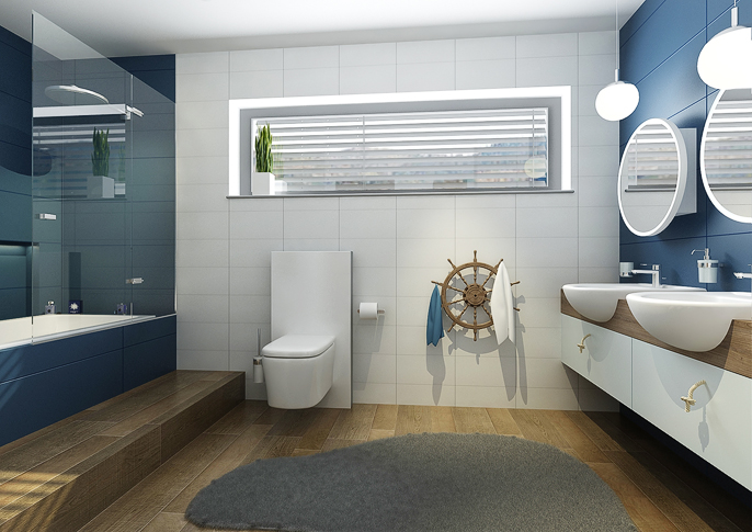 Children's bathroom in navy colors and accessories. Rudder as a towel holder, mirrors a la windows to the cabin and instead of handles are pieces of rope with a knot. The bathroom is a combination of white and navy blue together with wood decor tiles, which resembles a real cabin on a ship.