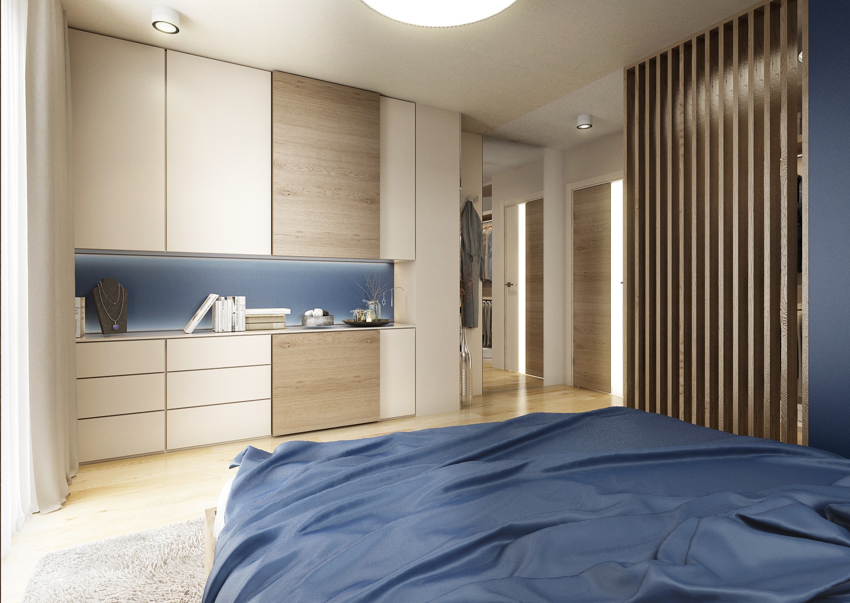 with a simple dressing room is designed in cream colors, with a decor of natural Kendal oak and contrasting royal blue. The dressing room is partially separated from the bedroom by a plasterboard partition and an oak slatted partition. The frame with vertical chips decorates the room interestingly.