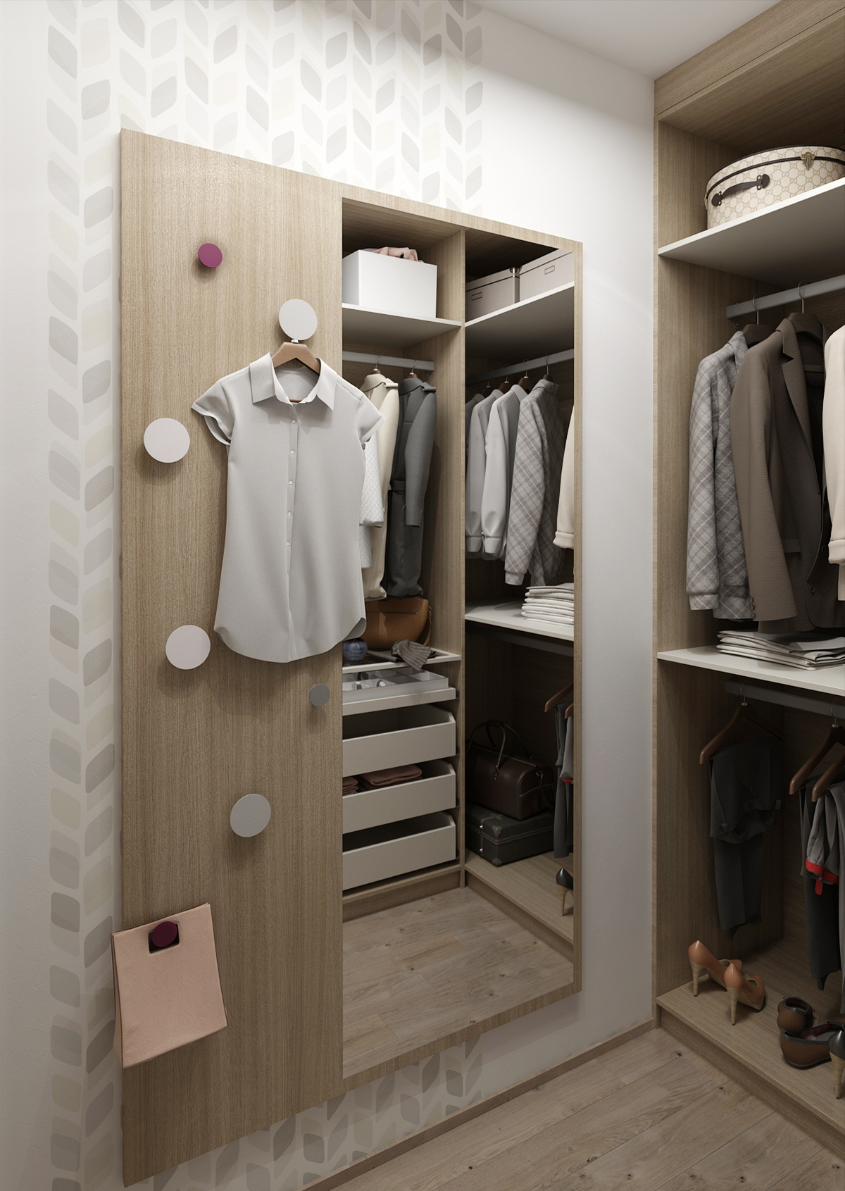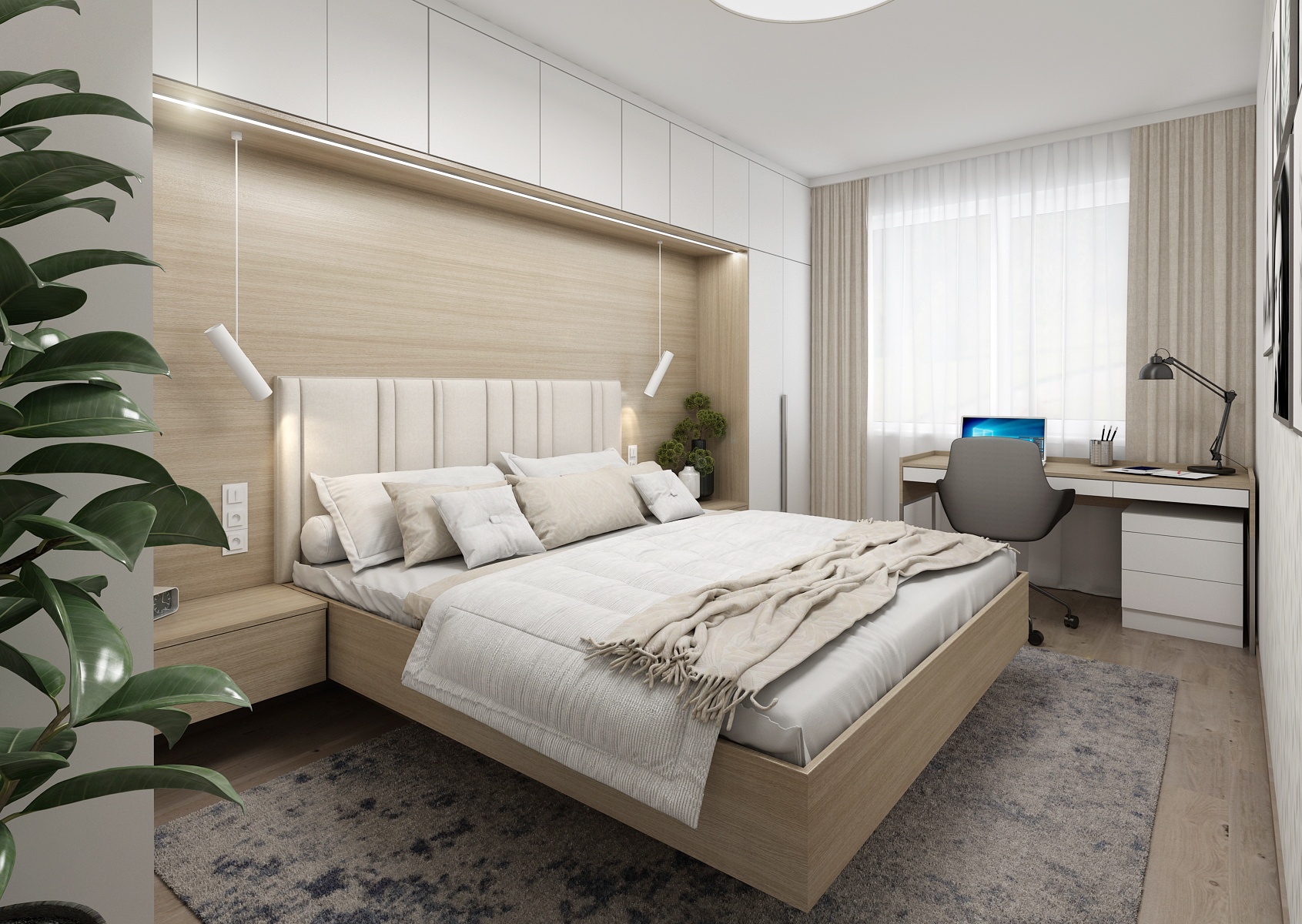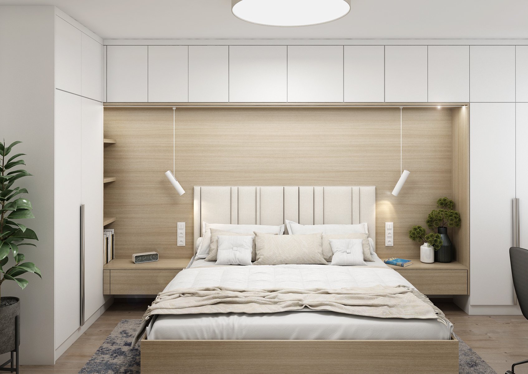The spacious bedroom is designed in light colors in combination with light wood, which significantly separates the part with the bed from the rest of the bedroom.