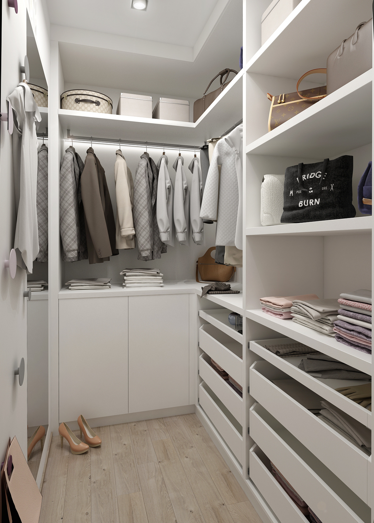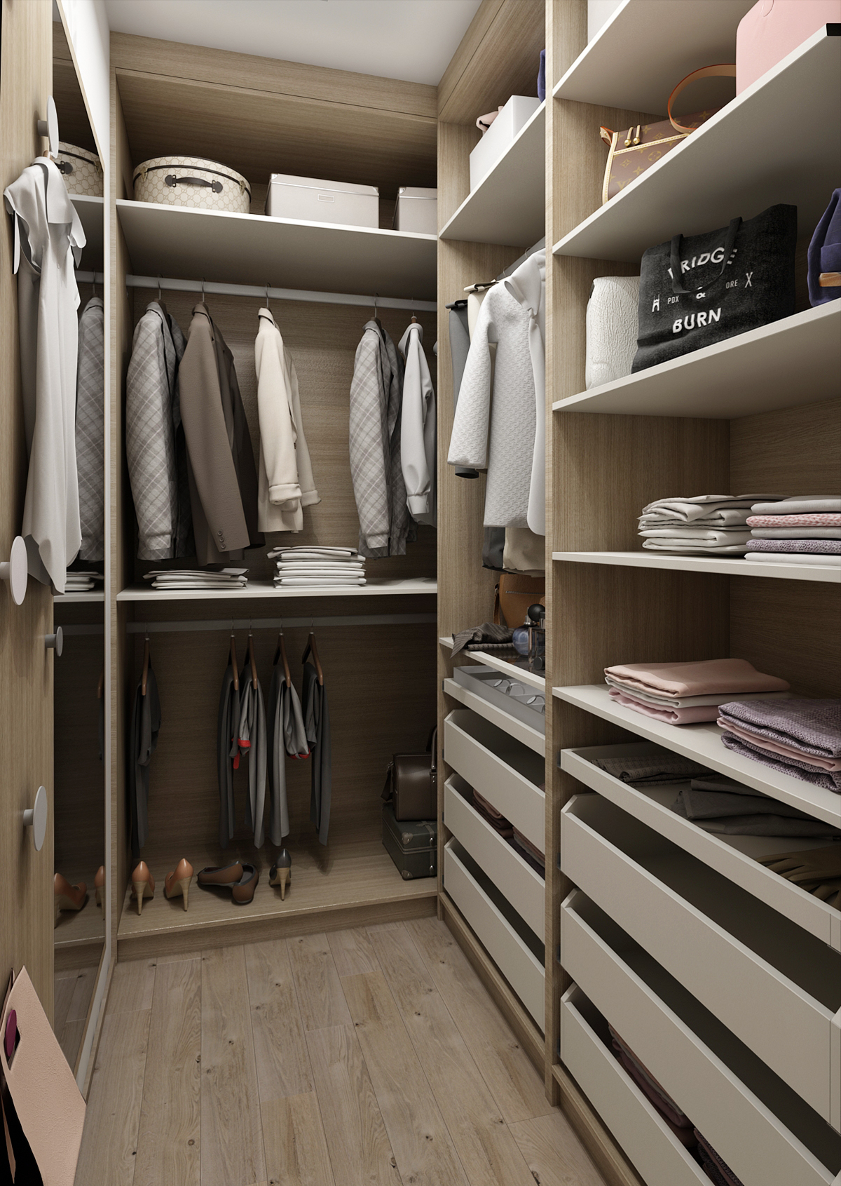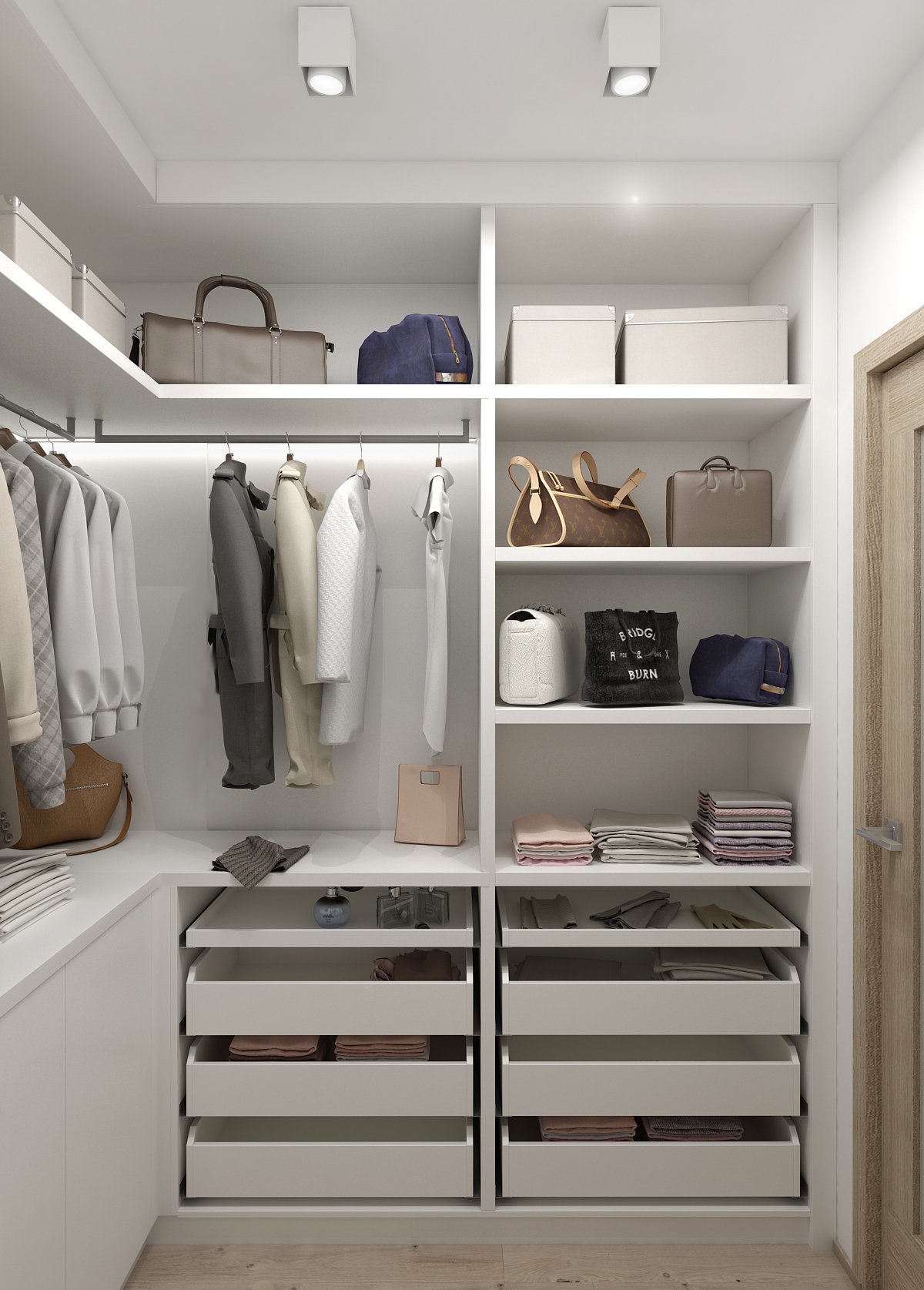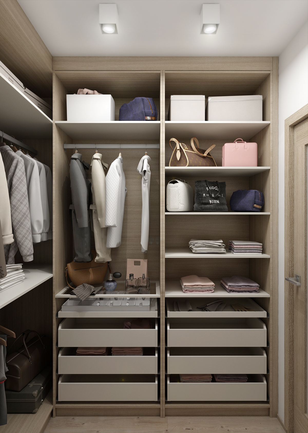 The spacious bedroom is designed in light colors in combination with light wood, which significantly separates the part with the bed from the rest of the bedroom.
