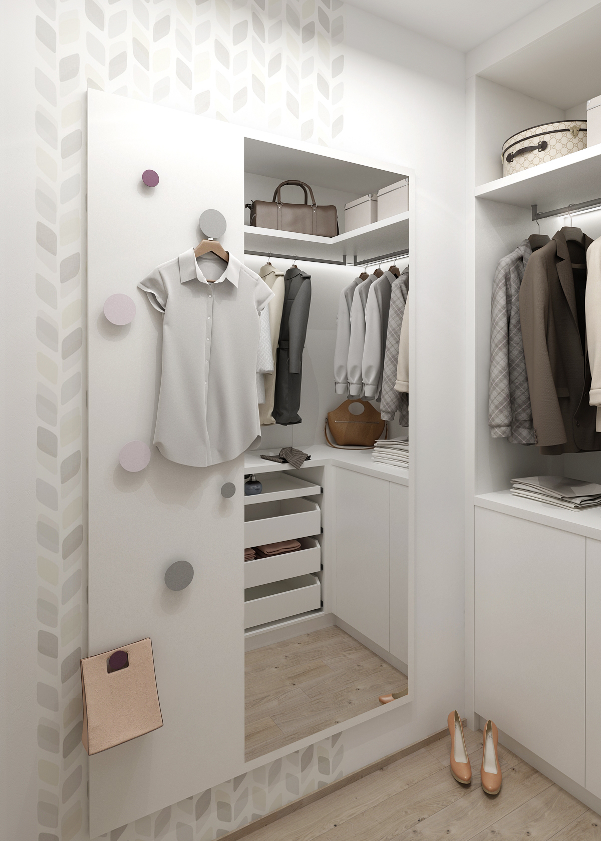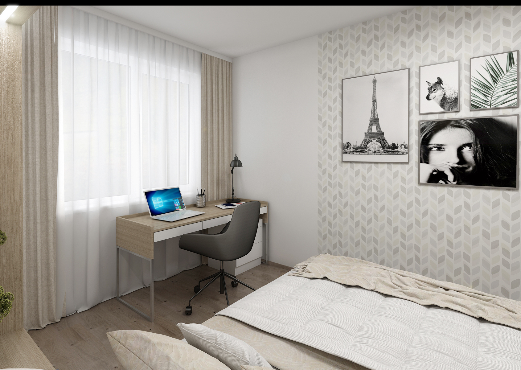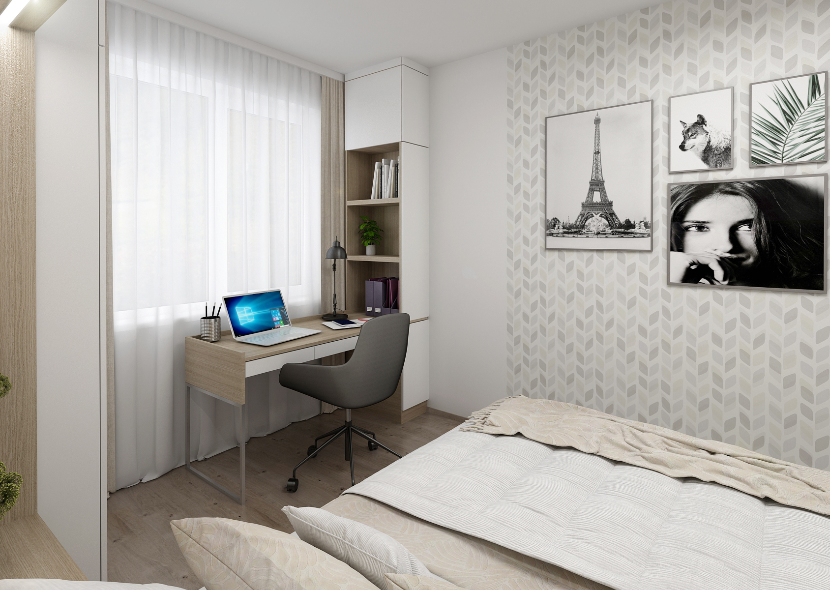 The wall opposite the bed is decorated with patterned wallpaper, which rather complements the interior and emphasizes the simplicity of the design. There is also a work corner by the window, with or without a bookcase. As for the wardrobe, it offers space for hanging clothes, but also drawers, either covered or with a glass section for jewelry. There is also a mirror with hangers.