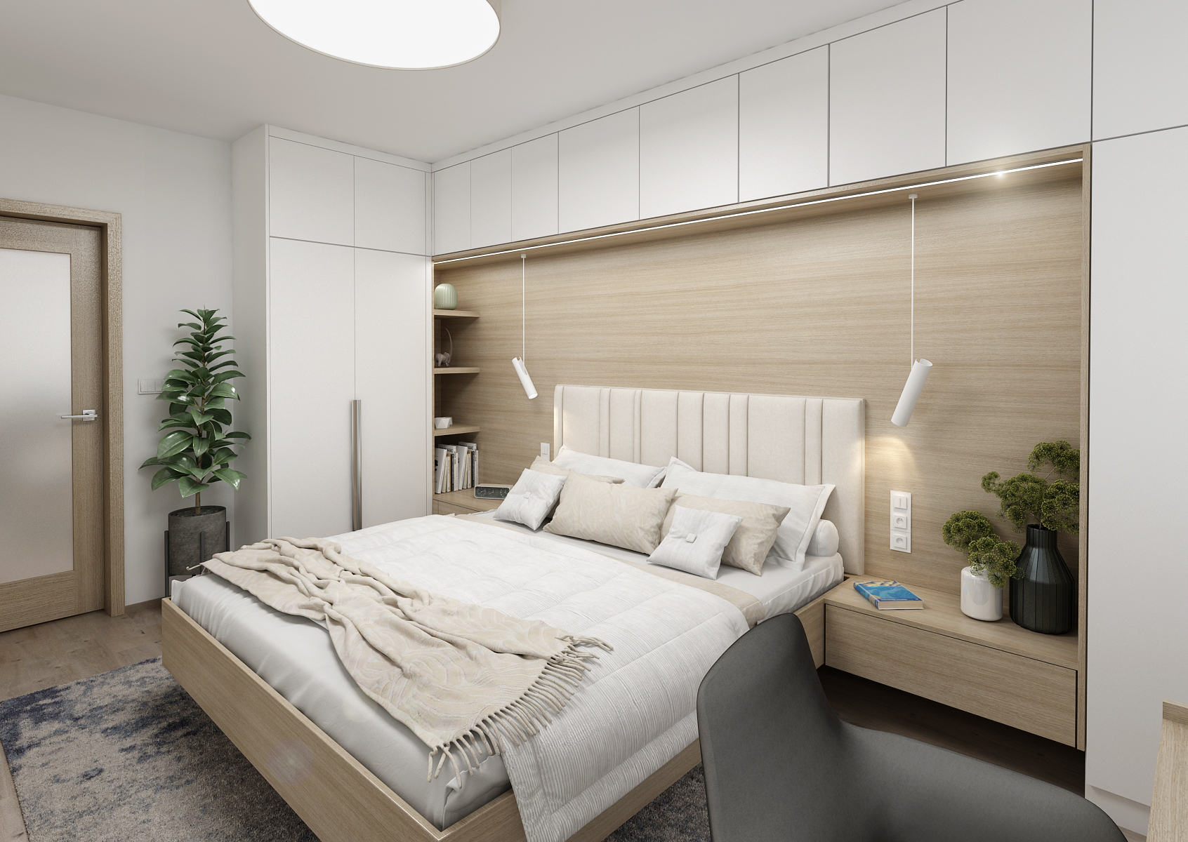 The bed structure, headboard and bedside tables are designed in warm tones of natural ash wood, which is lined with white cabinets. In addition to the bedside tables, shelves for storing books are placed next to them, and the entire space under the upper cabinets is then illuminated by an LED strip built into the lower part of the cabinets. The handle-free door underlines the clean and minimalist design.