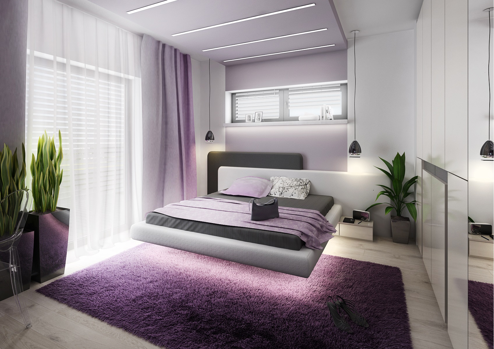Asymetric bedroom in purple lilac shades. Behind the upholstered "levitating" bed is the originally offset headboard. Classic table lamps are replaced by Lampetta pendant lamps. The rest of the room is illuminated by recessed LED strips in the ceiling.