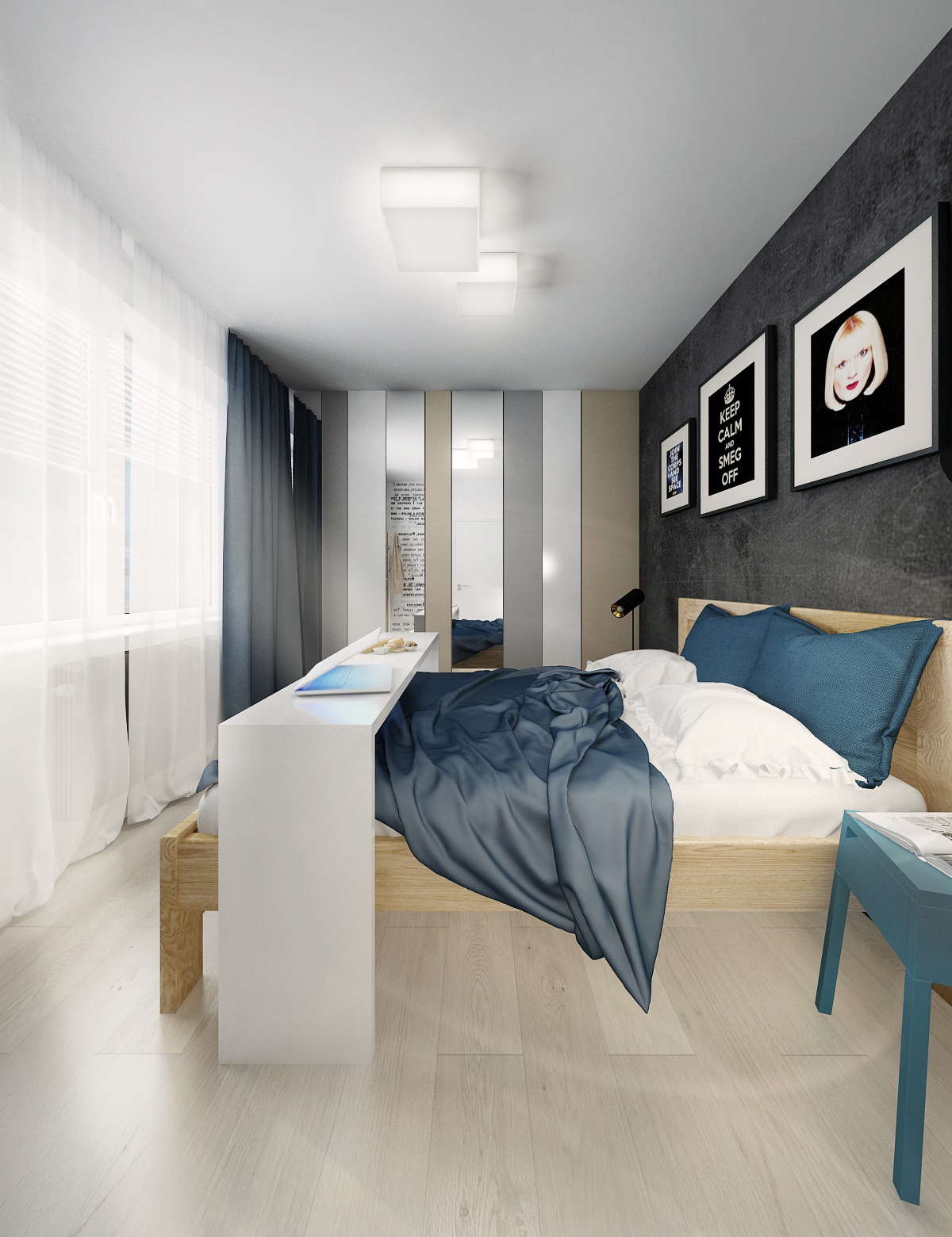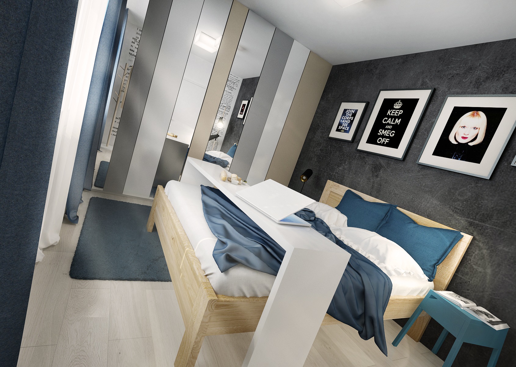 bedroom for a young man. Solid bed, anthracite wall trowel, Ikea tables and carpets, BoConcept-Cone decorative lamp. The built-in cabinet made to measure is divided into several parts with doors of different widths and materials, thus achieving an optical reduction of the total area of the cabinet. The white wall at the bedroom door is treated with a "smart paint", on which you can repeatedly write notes or otherwise create.