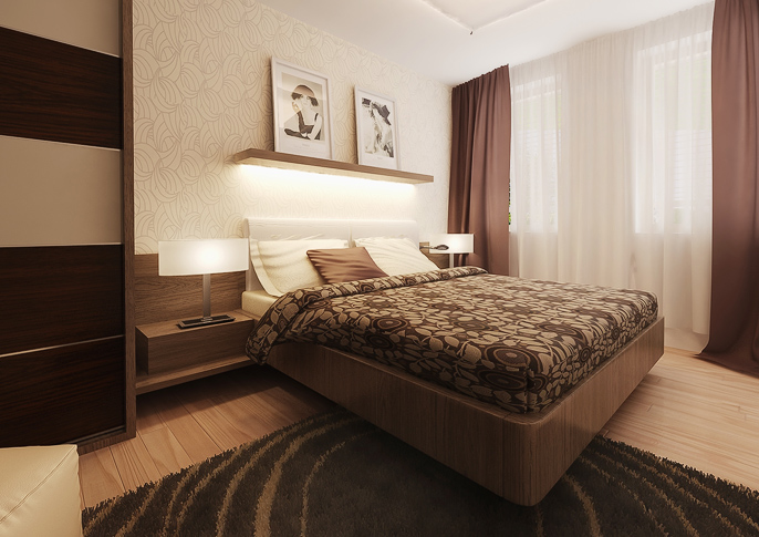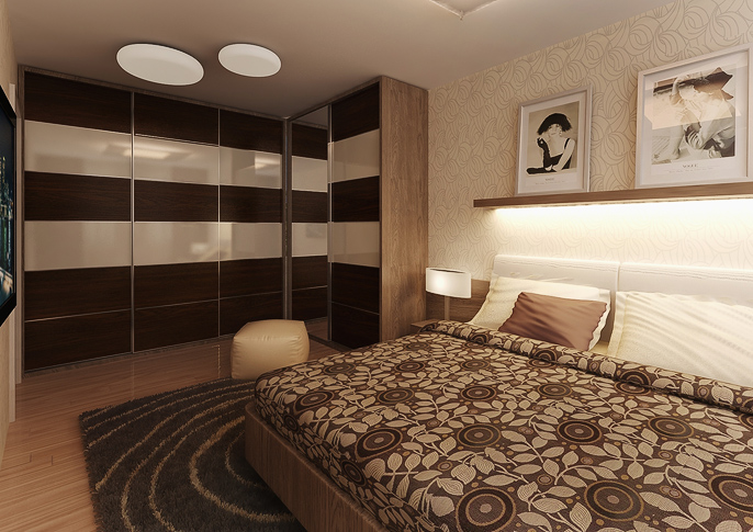 The design of the bedroom is carried in a shade of earthy colors and a pleasant retro style. Storage spaces are solved by built-in cabinets with sliding doors. Thanks to the combination of white, the space looks spacious, cozy and comfortably. The room is sufficiently illuminated by large windows which can be closed with a curtain in a brown shade.