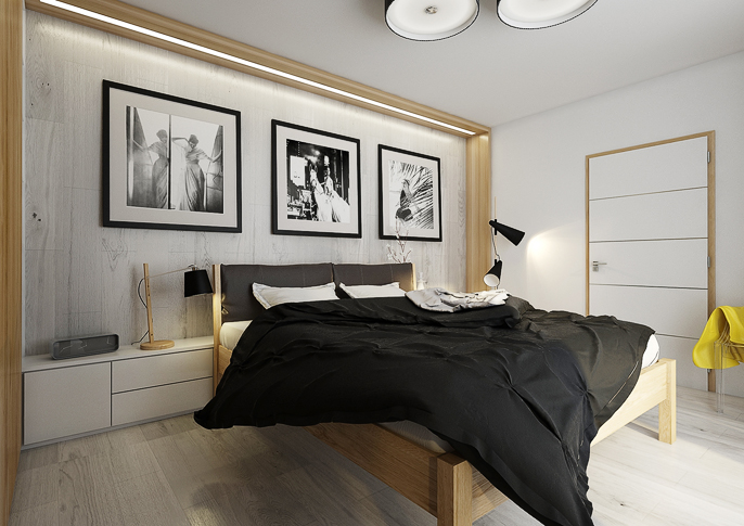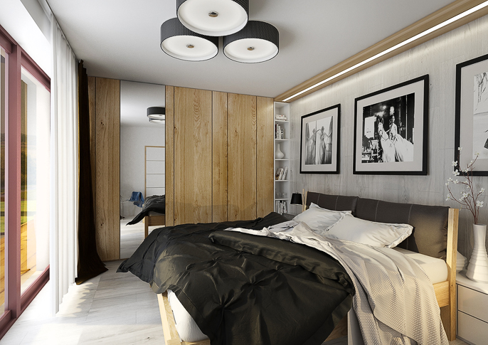 A simple bedroom interior with natural oak wood decor
