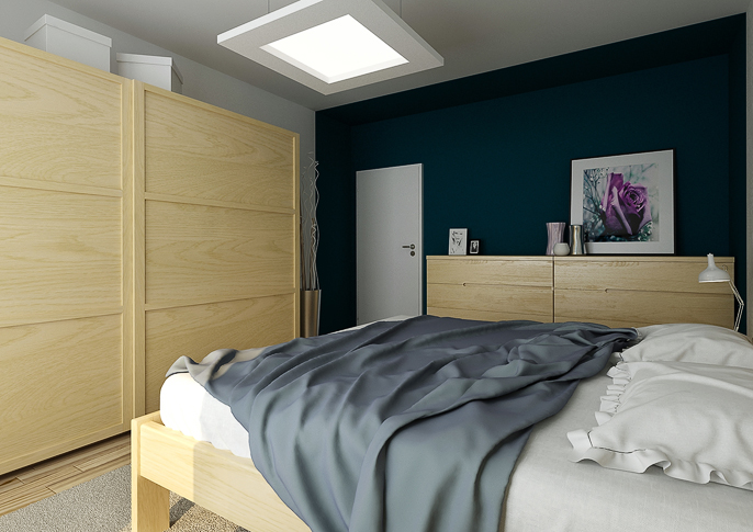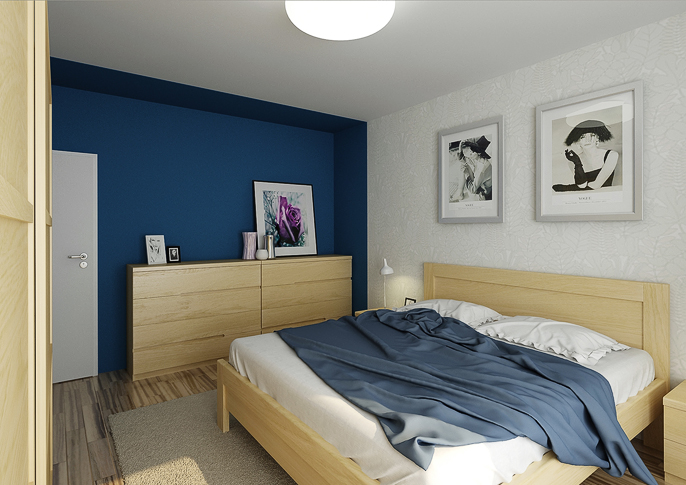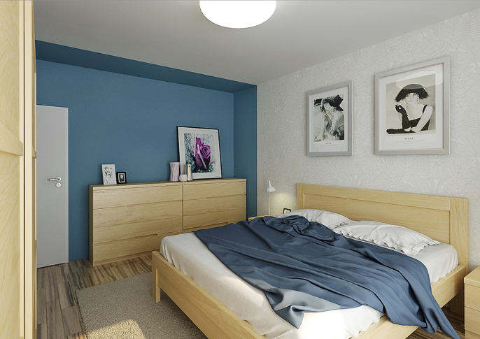 Blue and white bedroom interior in solid oak design