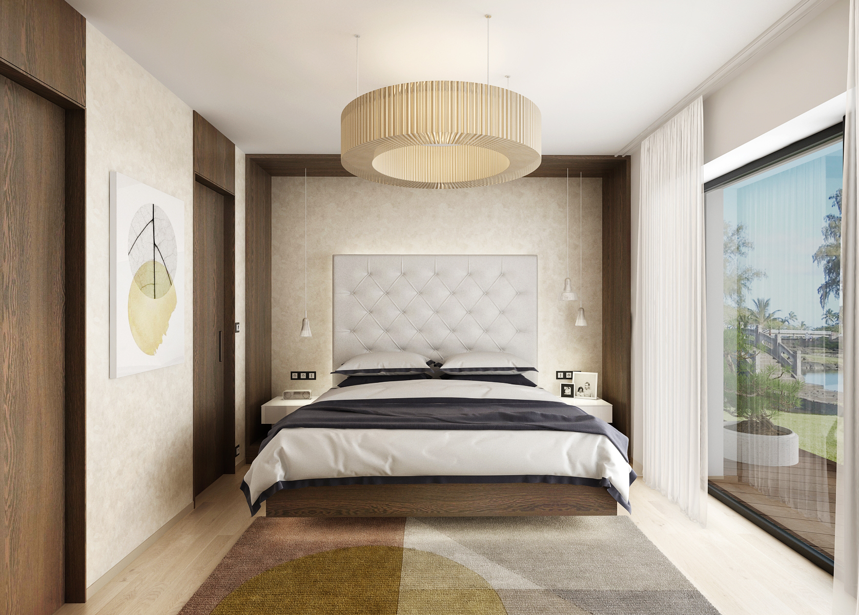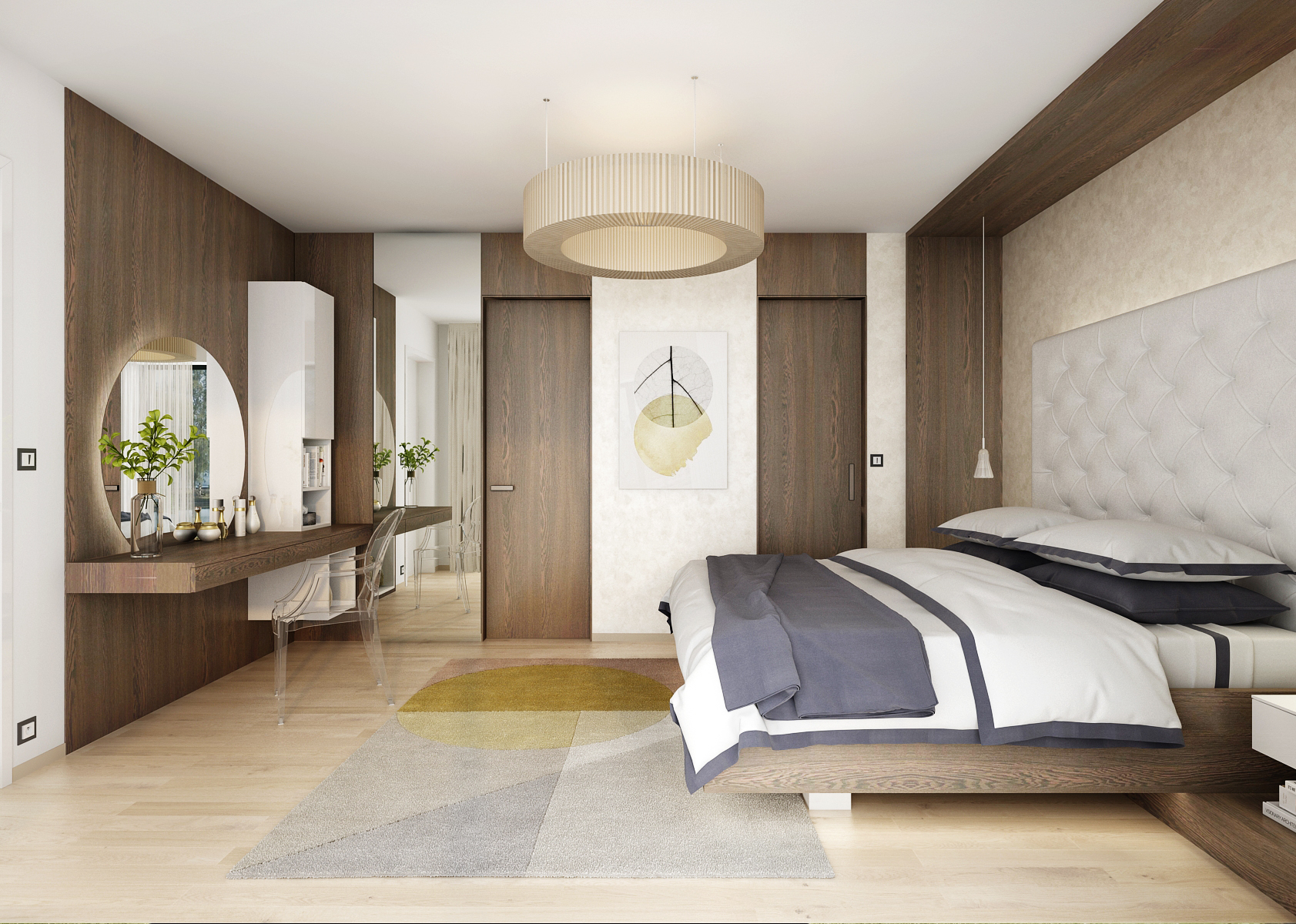 In the first version of the design, dark walnut veneer is used as cladding, which is also incorporated into the door. At the same time, the walnut veneer creates a cozy corner at the head of the bed, where it is used not only on the walls but also on the ceiling. In addition to the walnut veneer, the space is also varied with the help of a concrete trowel.