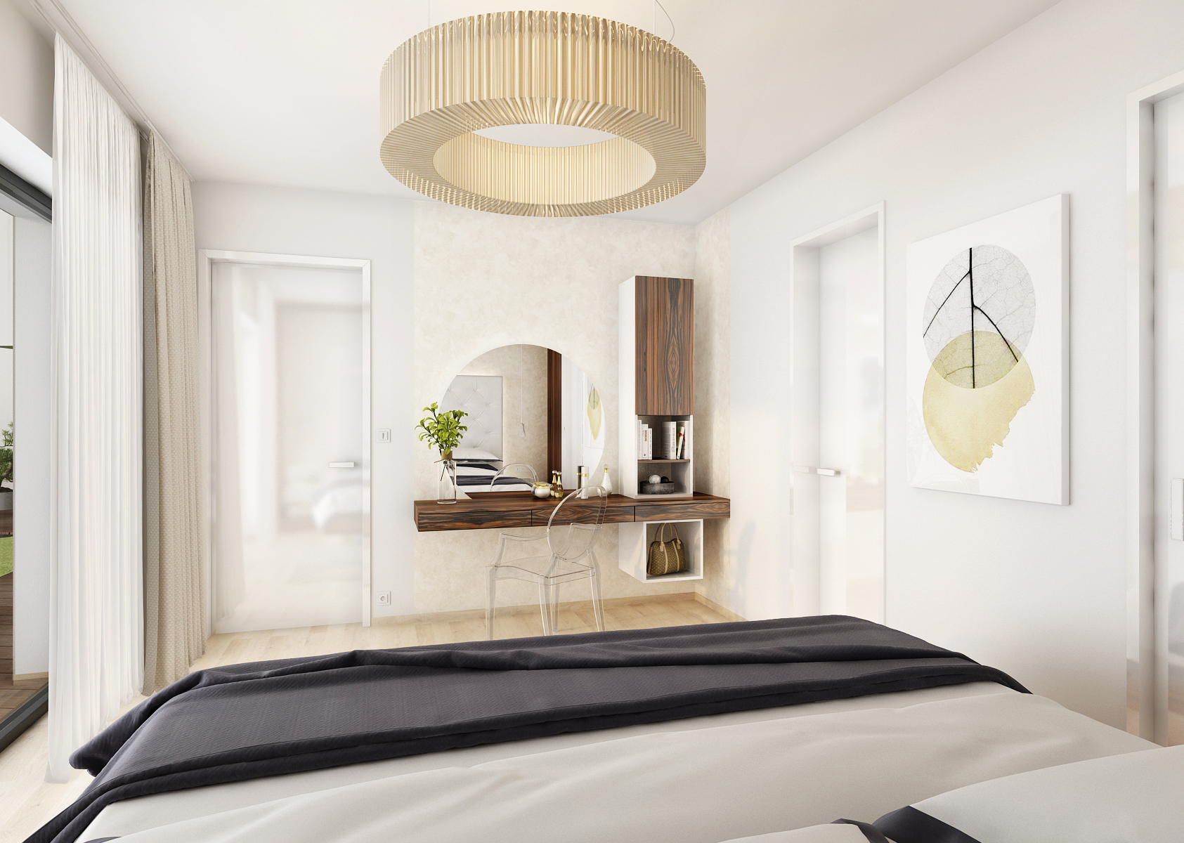 The second variant of the bedroom is interesting mainly due to the use of annealed wood on furniture elements, such as a bed or a dressing table. As with the previous variant, the annealed veneer is also used as a lining around the bed.