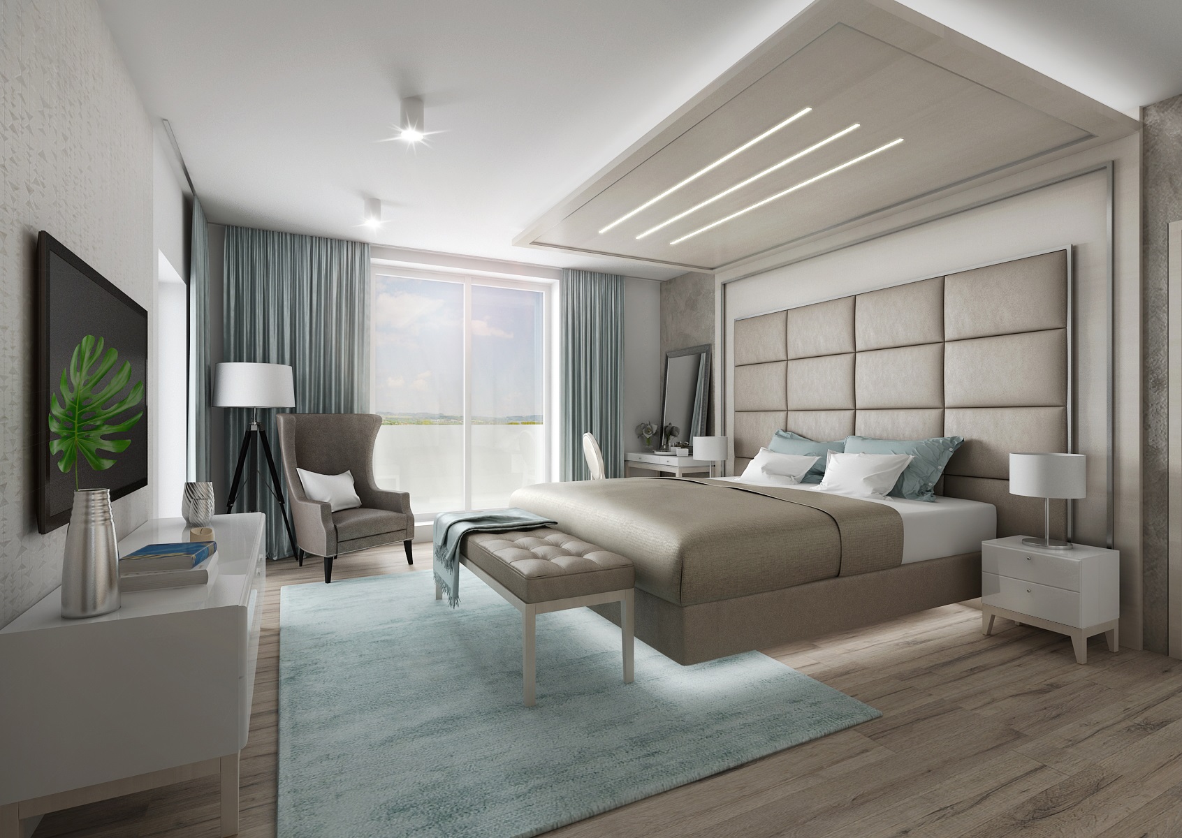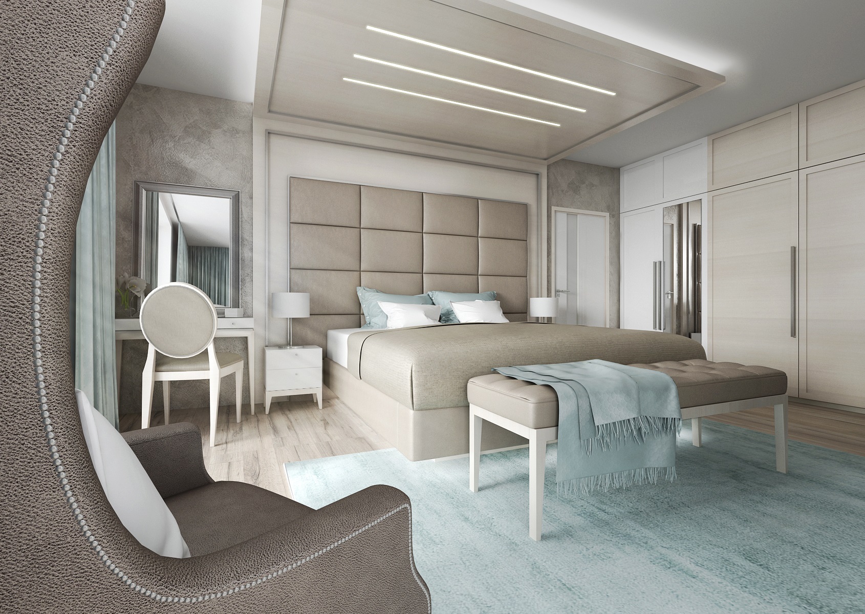 in the design of a bedroom with an adjoining dressing room. The central element of the space is a double bed with a high mattress. Thanks to the backlit frame with a glass leg, the bed "levitates" in space. The luxurious impression is enhanced by a distinctive upholstered front with coffered wall paneling and