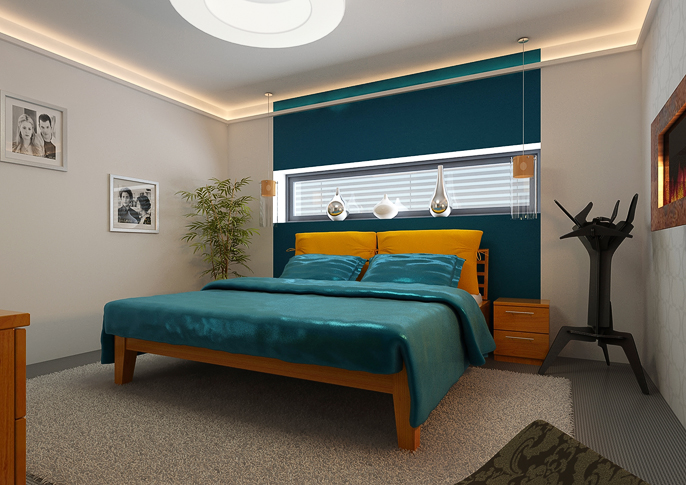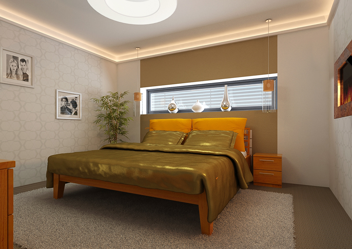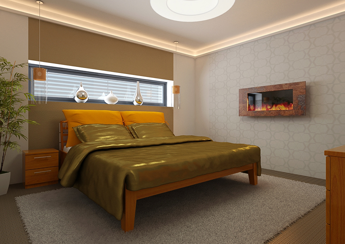 Interior design of the bedroom with wall-mounted electric fireplace