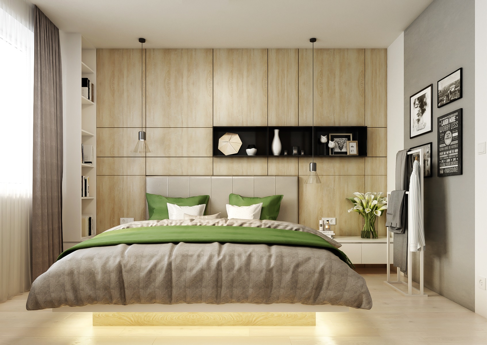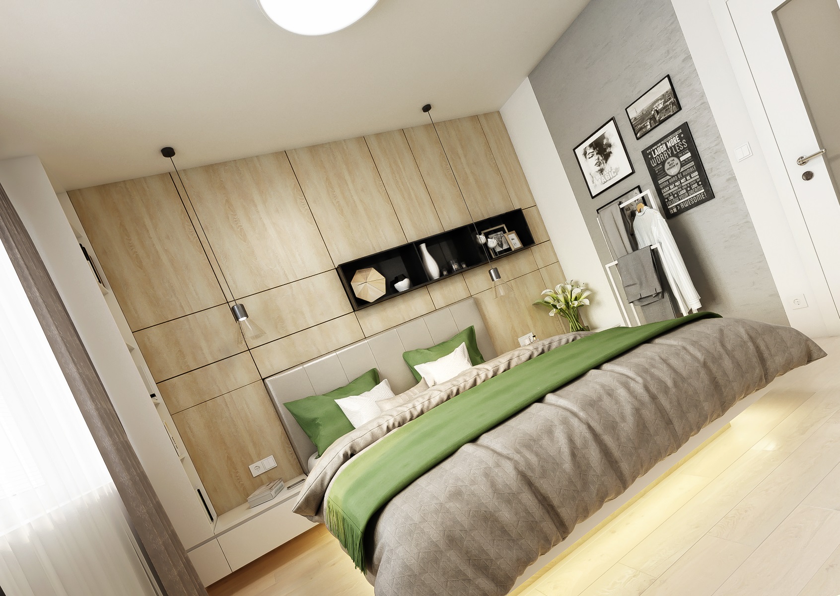 The double bed is lightened by jumping on its base and together with the LED backlight, creates the impression of levitation. Adjacent bedside tables extend along the rest of the wall, passing on one side into a tall library. The wall is lined over the entire surface with various LTD formats