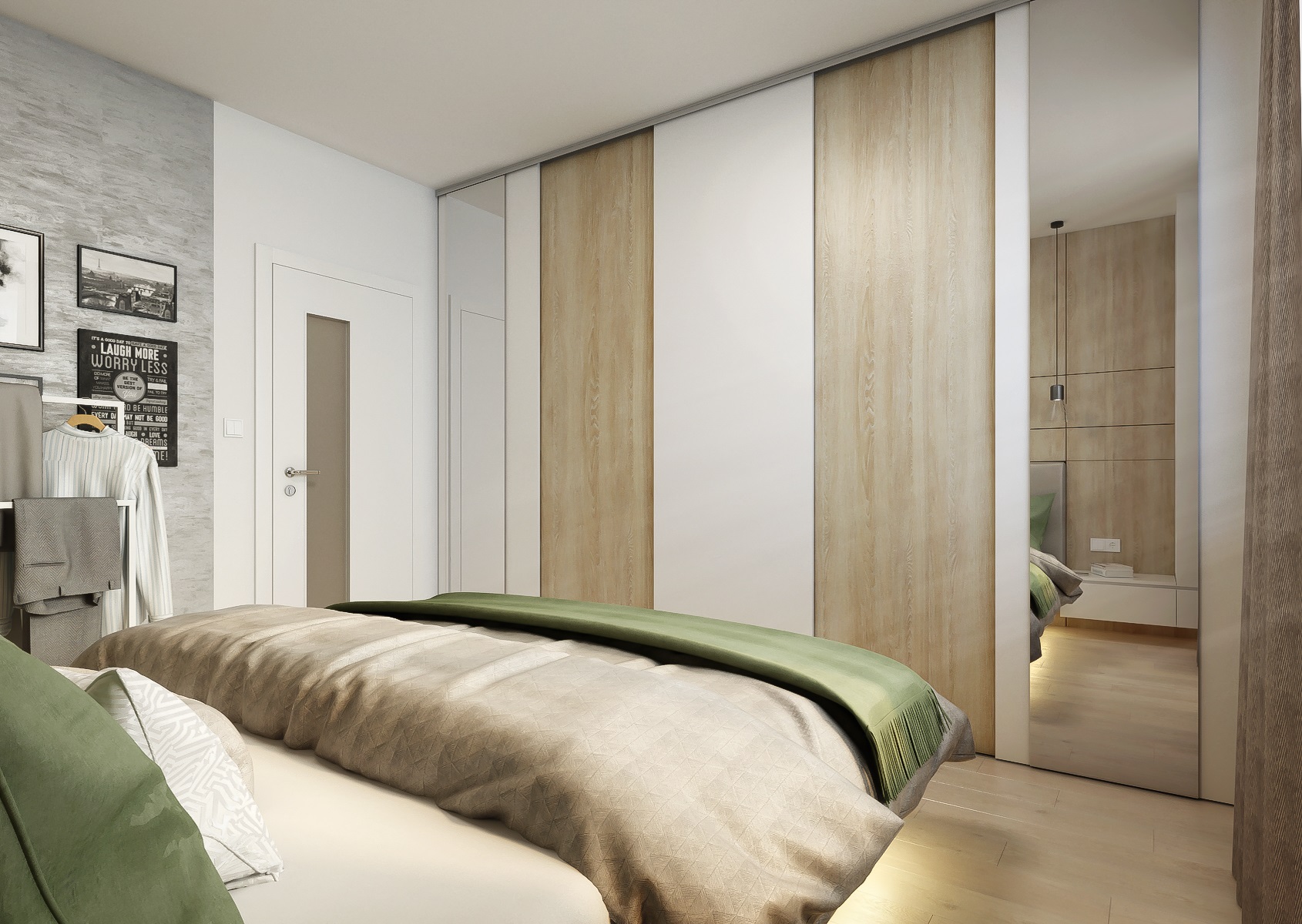 in natural oak decor. The upholstery includes an upholstered headboard and an inserted shelf, deliberately chosen in a distinctive black design. The combination of surfaces (white, oak and mirrors) optically breaks up a large area of the built-in wardrobe occupying the opposite side of the room.