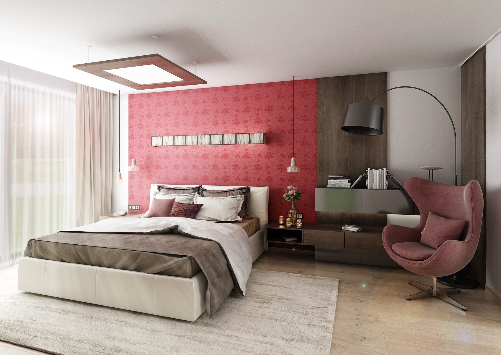 When entering the bedroom, at first glance you see a distinctive red wallpaper - Exception Fleur Rouge. The furniture and wall paneling are made of dark tobacco oak in combination with a black gloss. In contrast, a light oak floor, a cream upholstered bed and a beige mottled carpet were chosen.