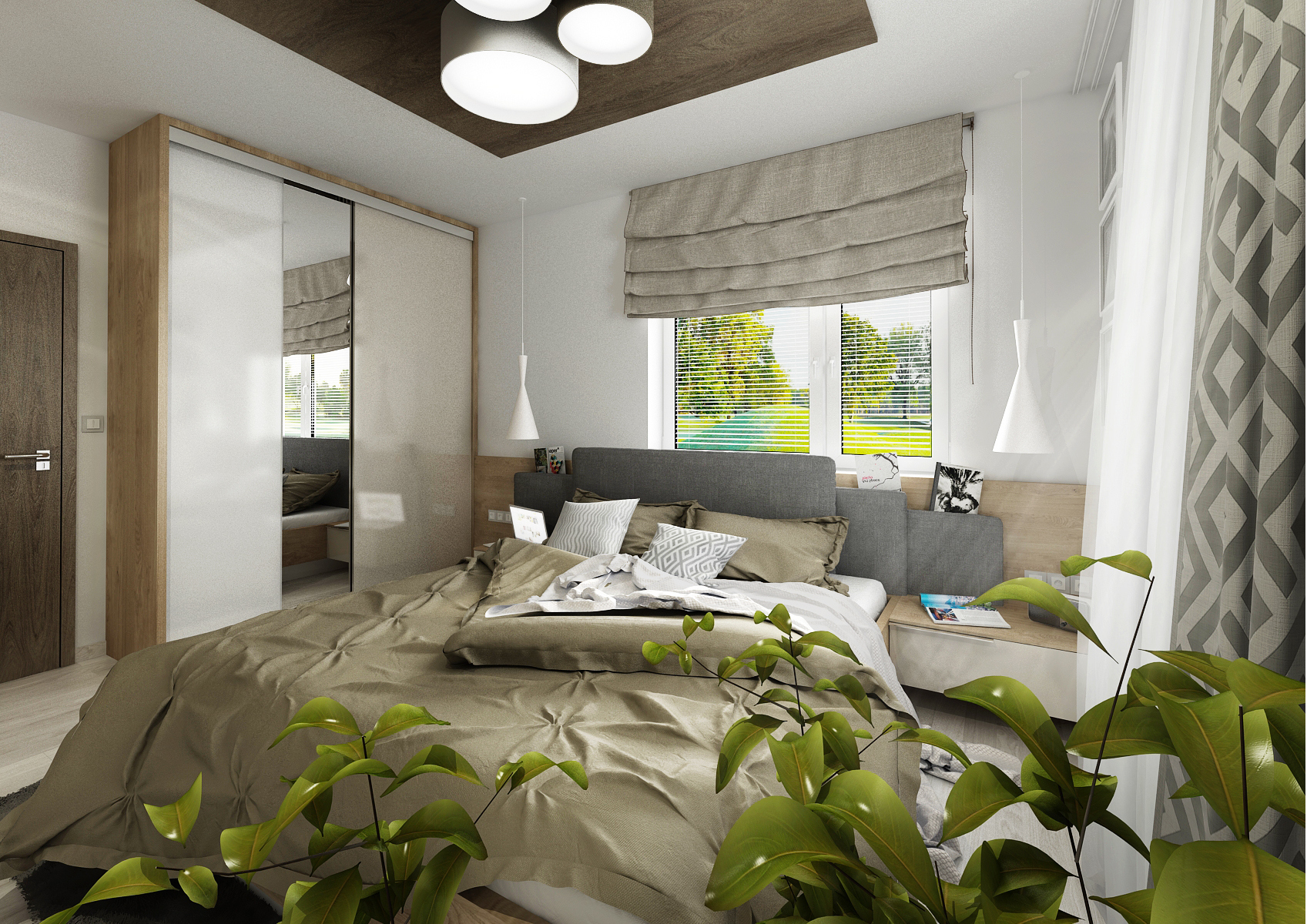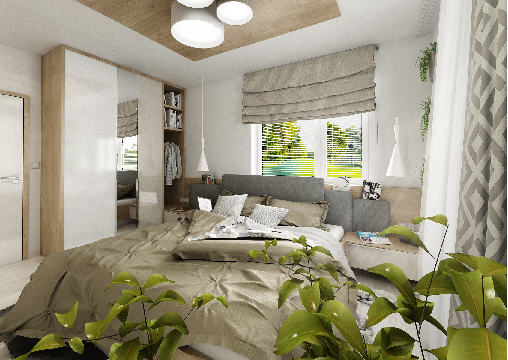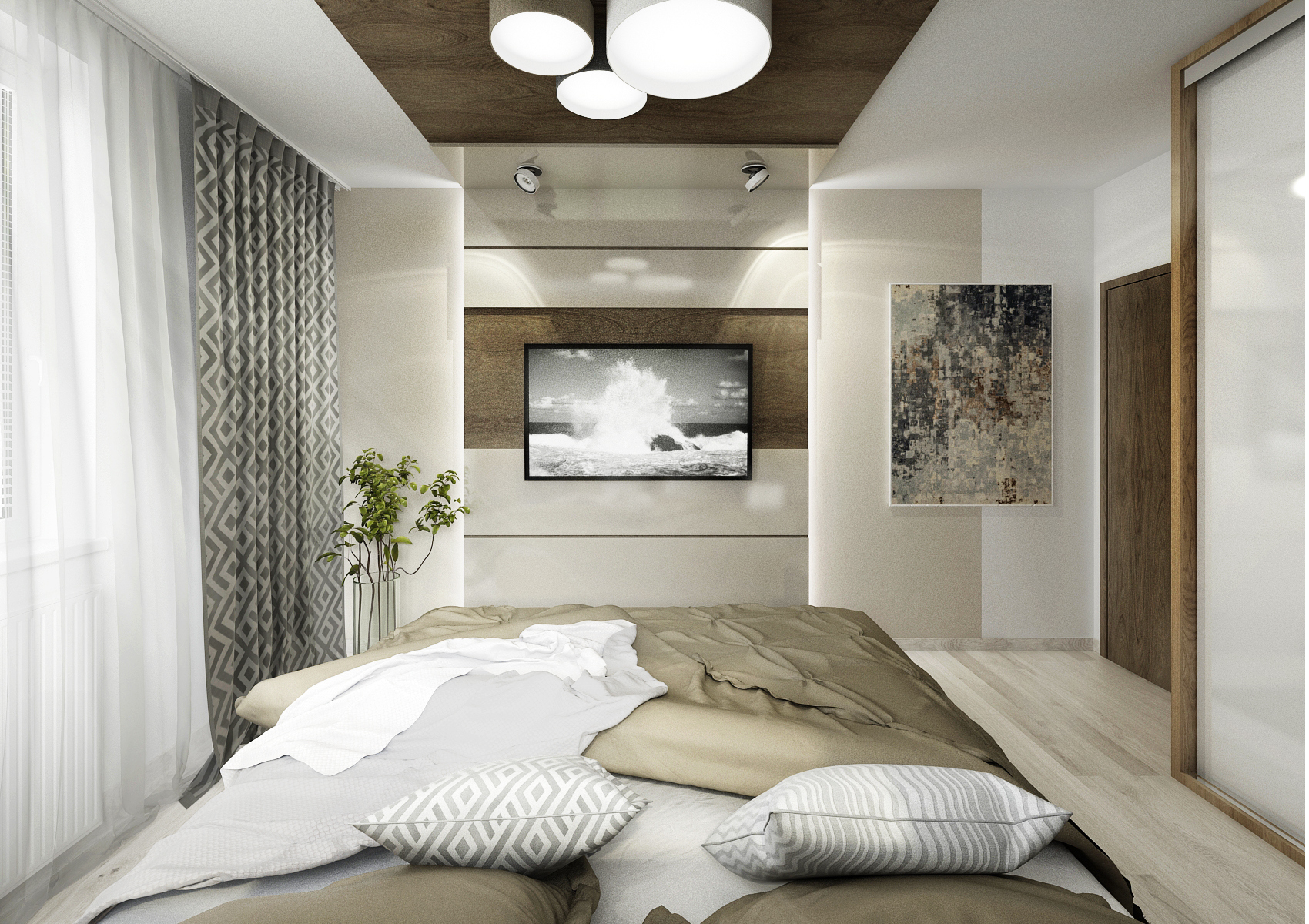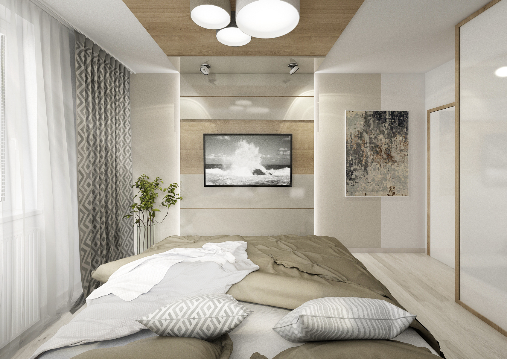 custom bult-in wardrobes in the design. In one variant, the headboard with bedside tables seamlessly transitions into a wardrobe, divided into four parts, with a hinged door with handles. In the next, a sliding door without a handle was chosen, to save space. In both versions, the cabinet door for the effect was divided in different width ratios. The headboard is formed by a combination of a board in wood decor with upholstered formats. The bounced upholstered fronts hide narrow shelves for storing, for example, unread books. The materials used are LDT boards in Kansas oak decor, combined with alpine white and cashmere gray in high gloss and bleached oak on the vinyl floor.