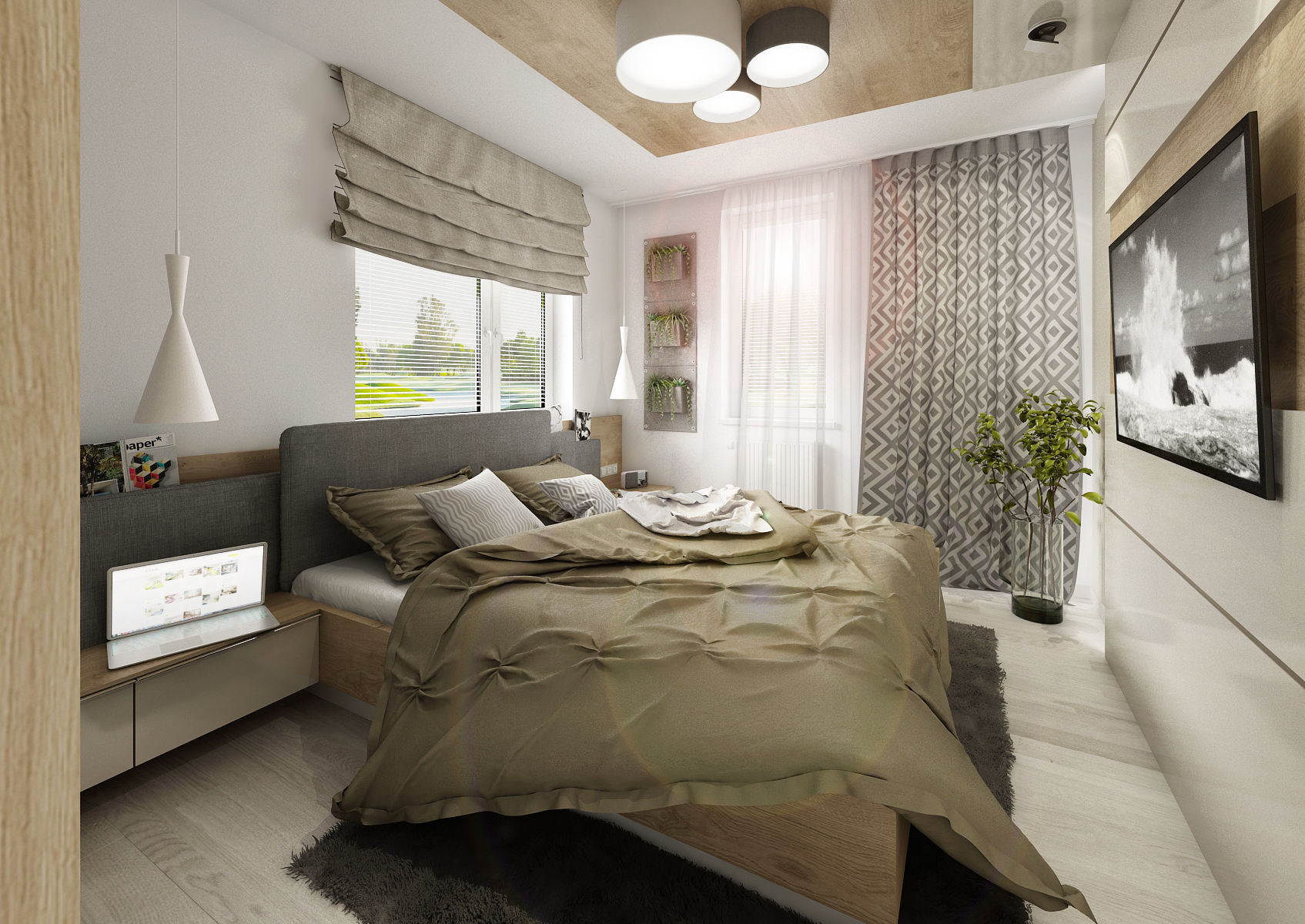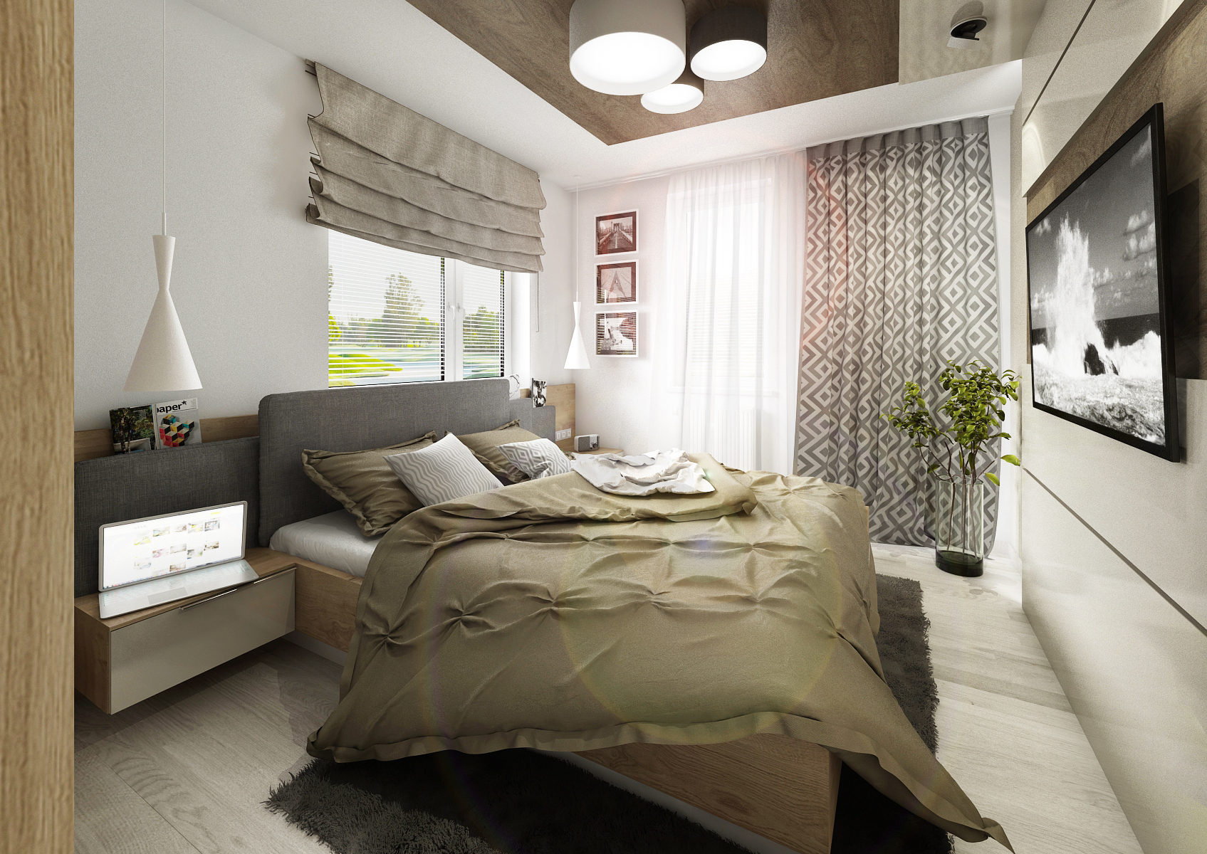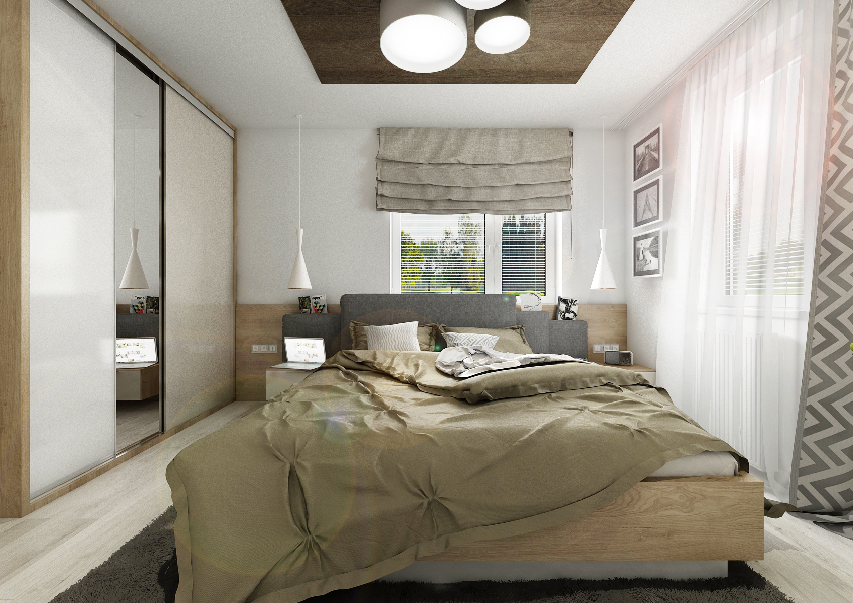 Corner room with an area of 3x4 meters, the size of just a double bed and one wardrobe. There are two variants of