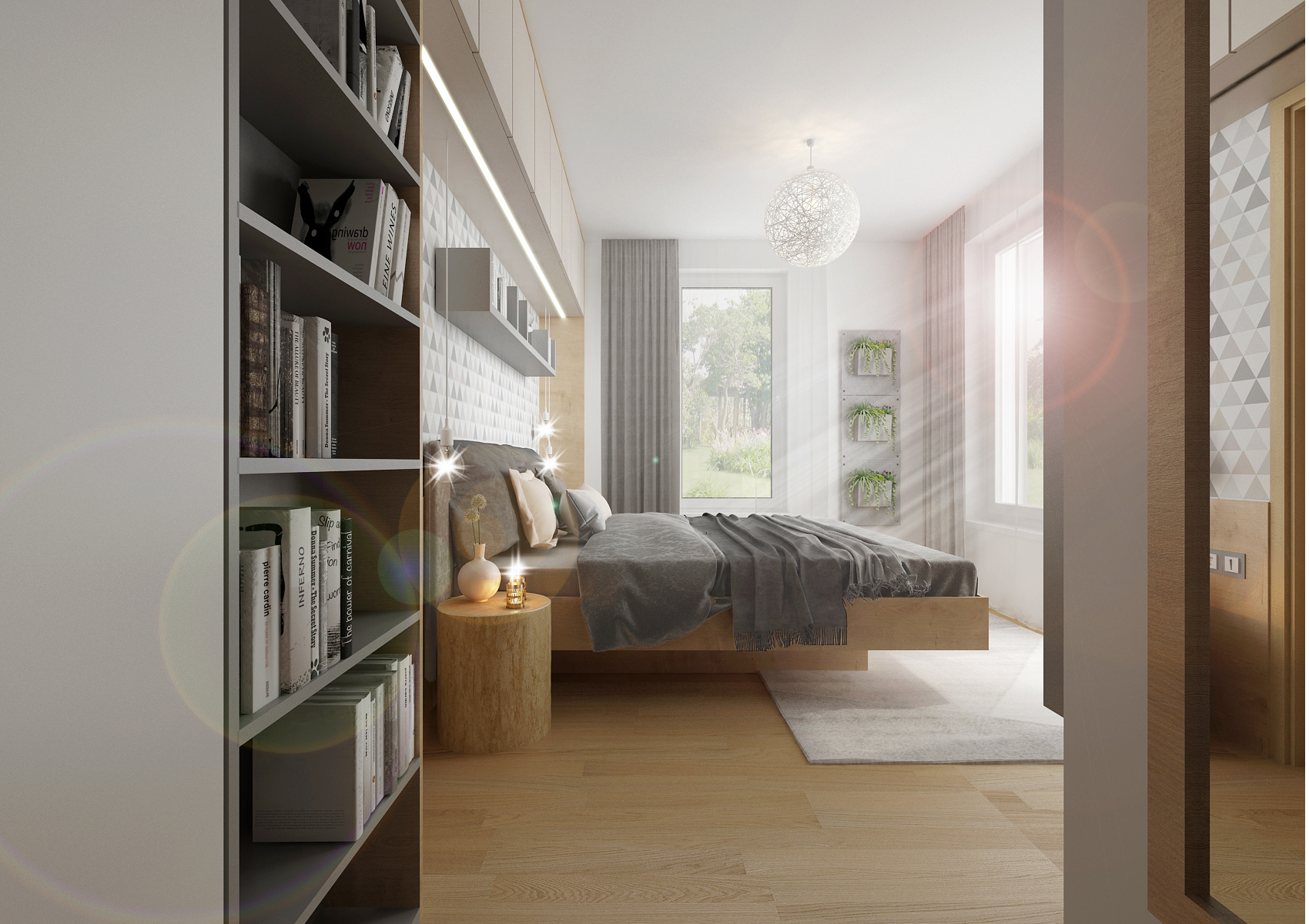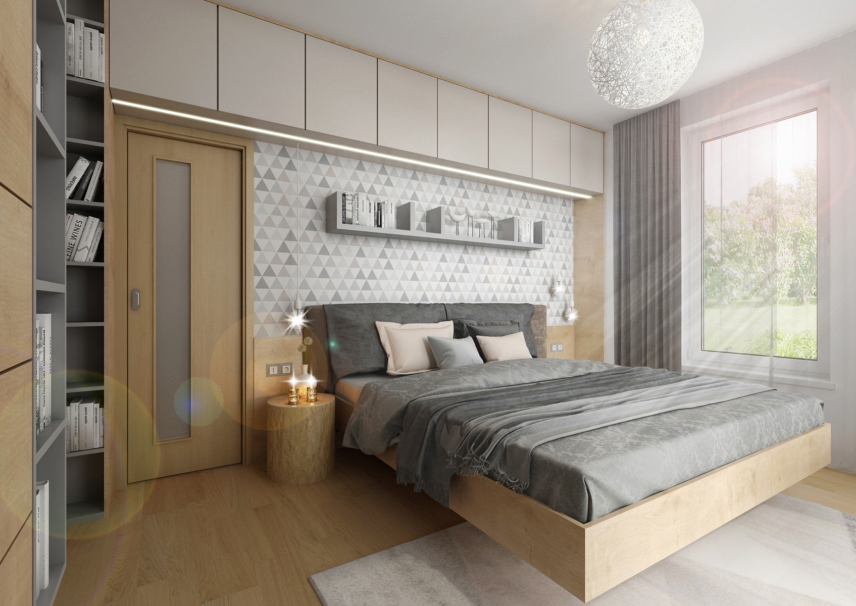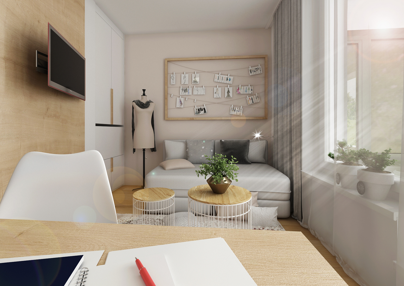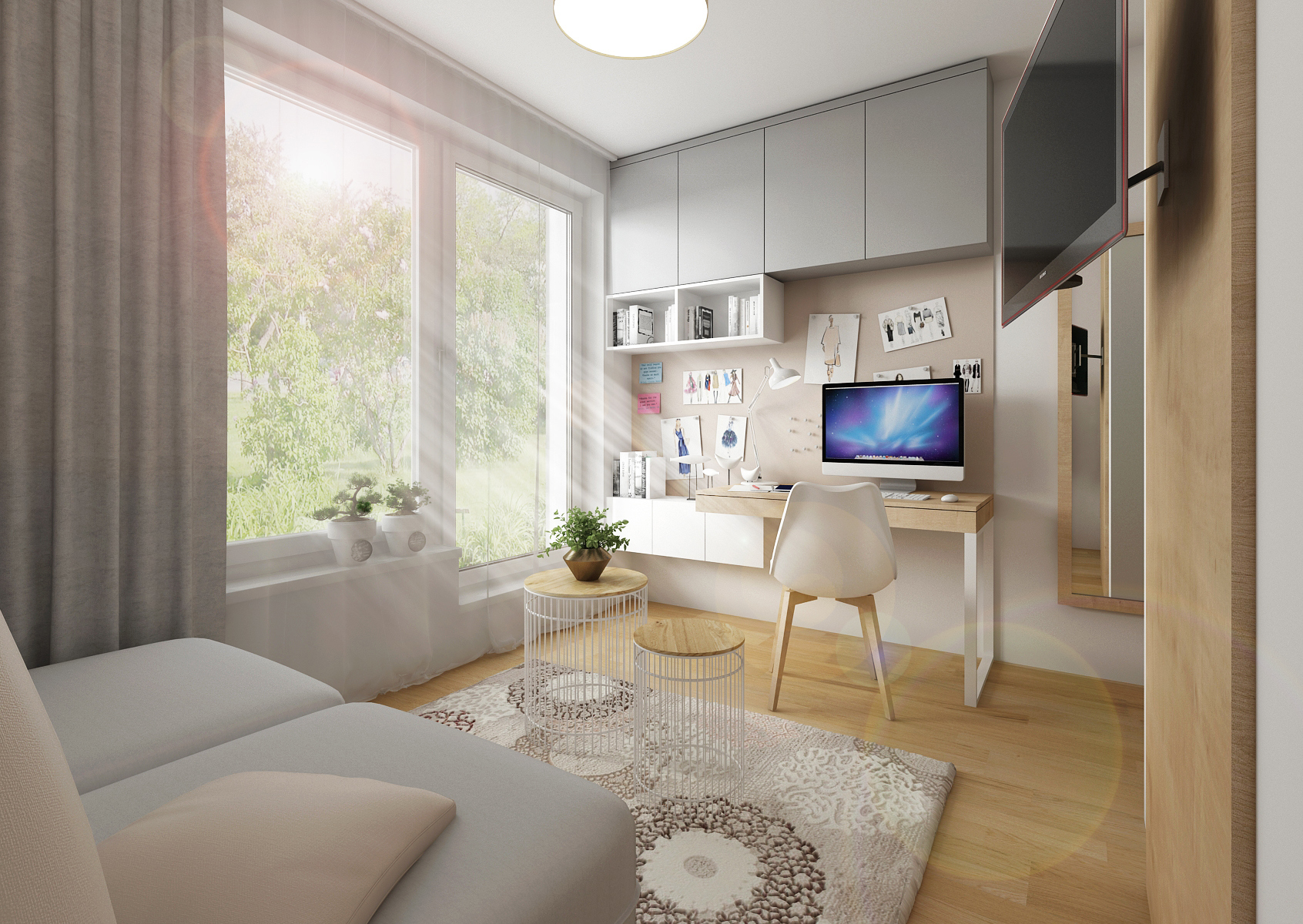 The generous space of the original bedroom, where there was also a desk, was artificially partitioned with a plasterboard partition, creating a separate dressing room. It didn't t harm the room in any way, on the contrary, the owner got a spacious storage. In the adjoining smaller room, a home study was furnished, also in a fine feminine style. The custom-made furniture was made of matt white and light gray laminate board in combination with the wood decor of the very popular natural oak.