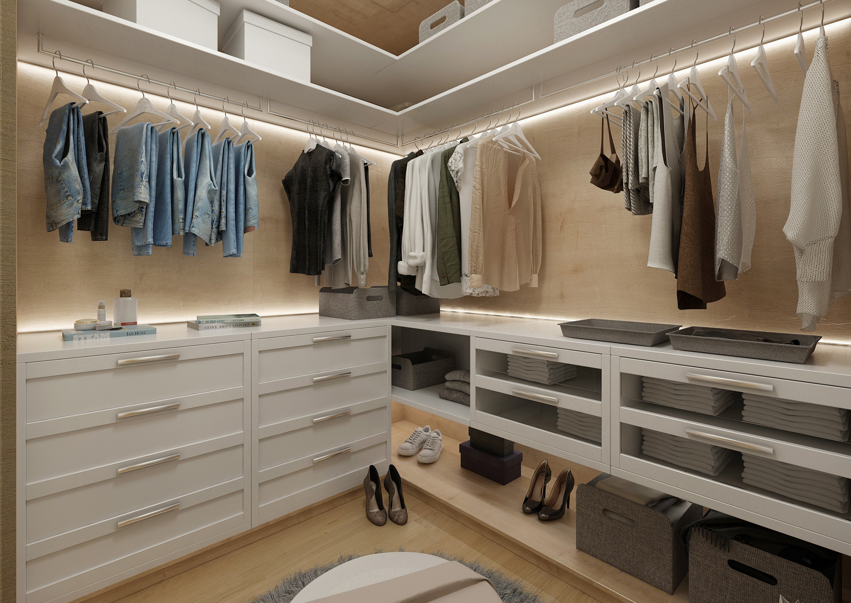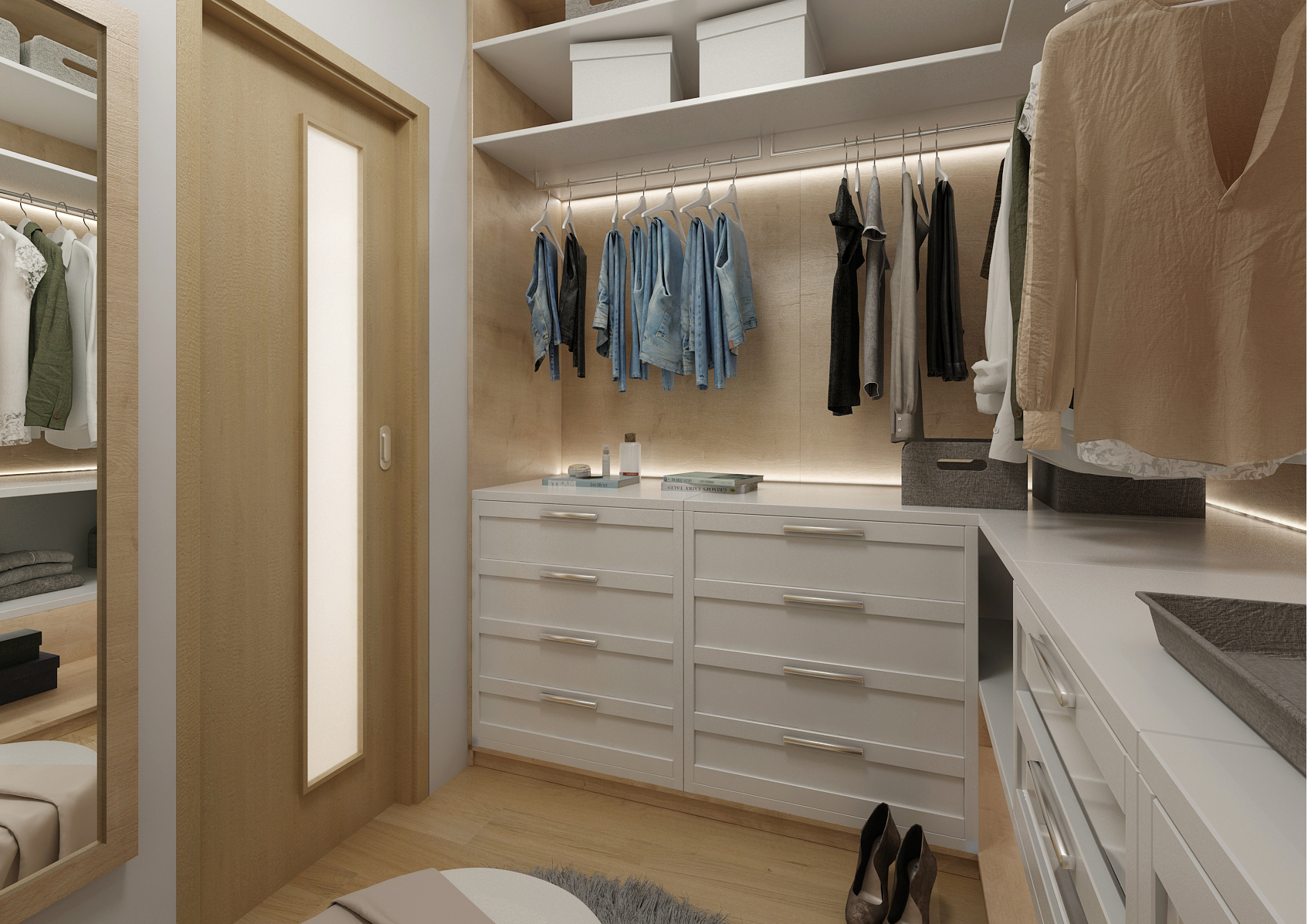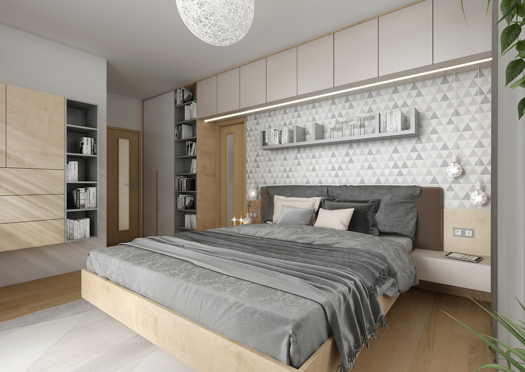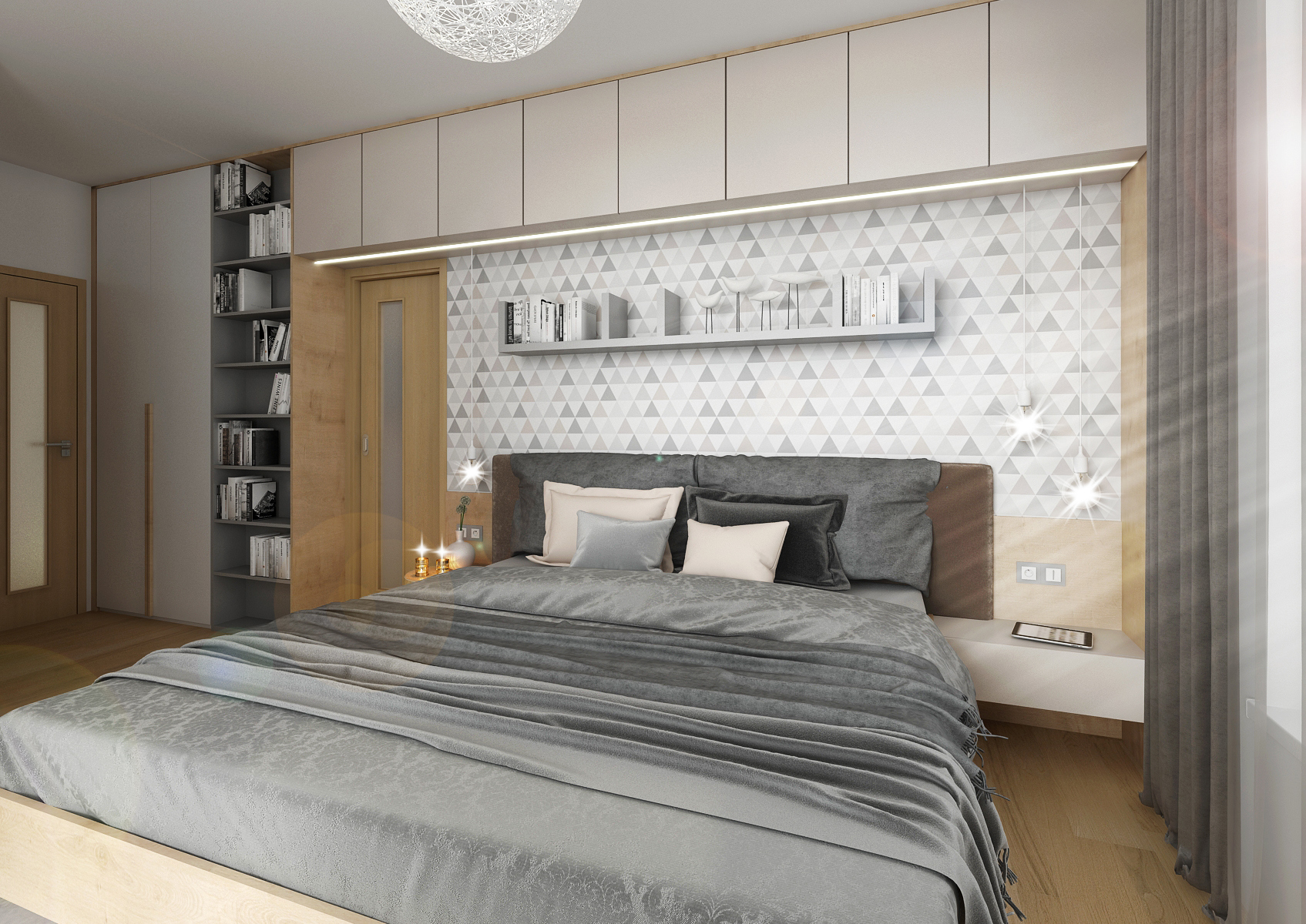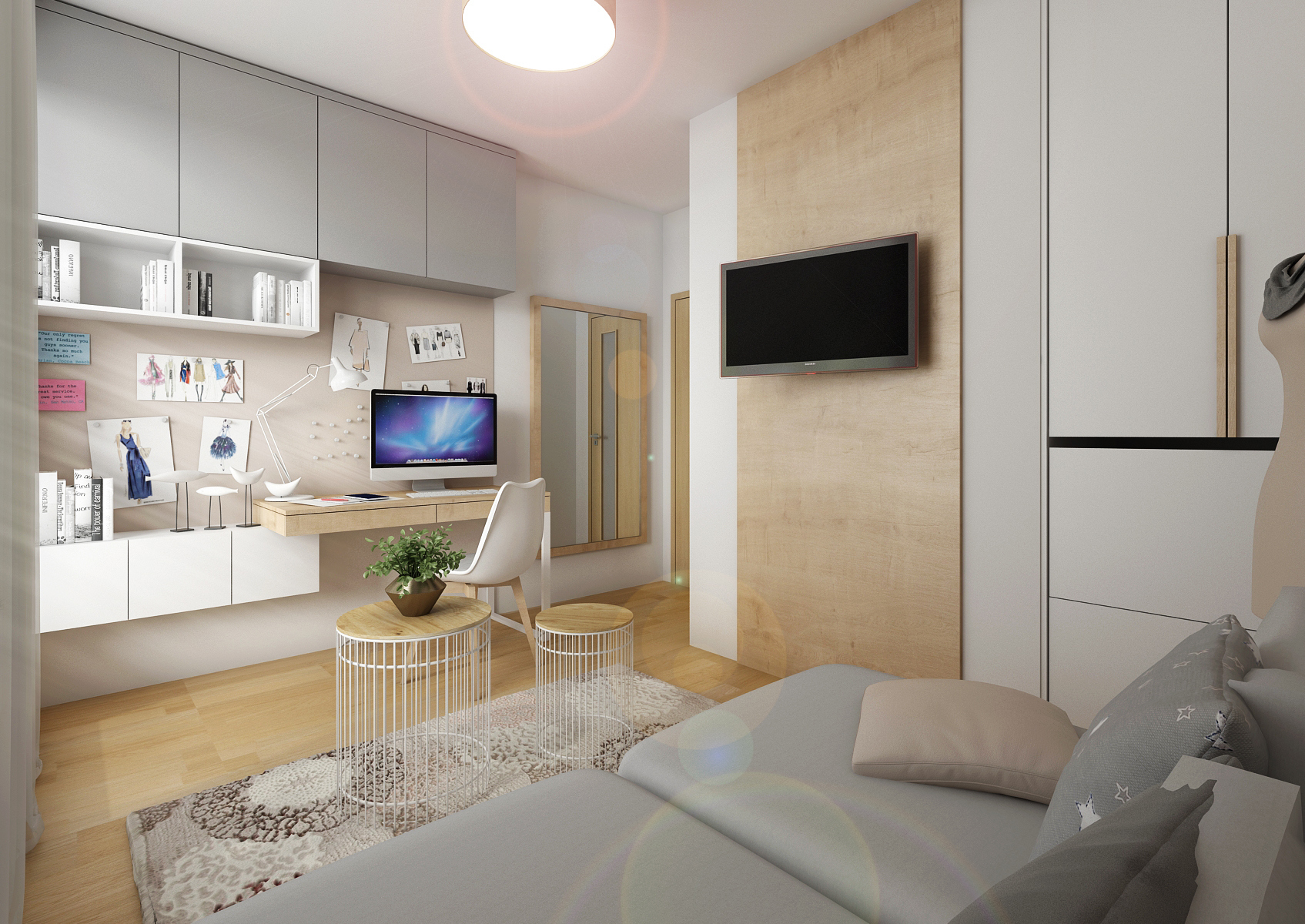The generous space of the original bedroom, where there was also a desk, was artificially partitioned with a plasterboard partition, creating a separate dressing room. It didn't t harm the room in any way, on the contrary, the owner got a spacious storage. In the adjoining smaller room, a home study was furnished, also in a fine feminine style. The custom-made furniture was made of matt white and light gray laminate board in combination with the wood decor of the very popular natural oak.