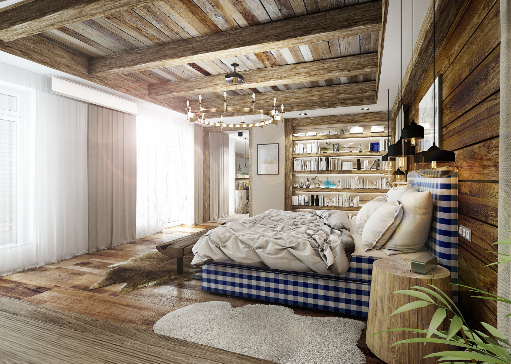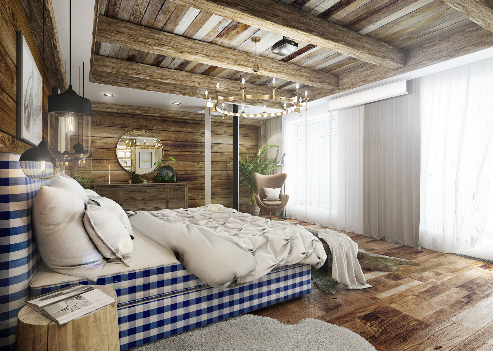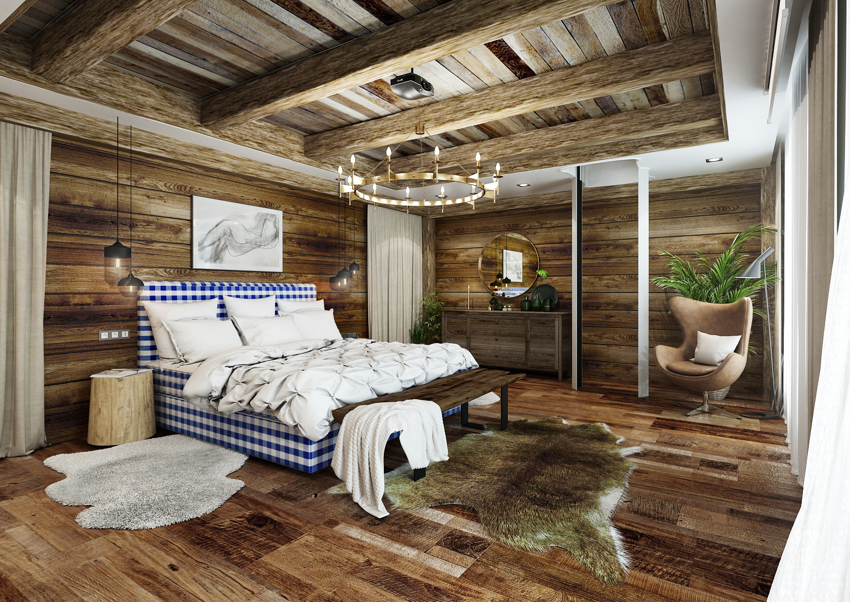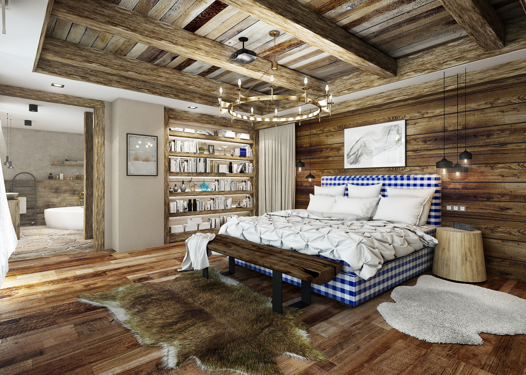 The main space with an upholstered bed and a brass circular chandelier situated in the center of the wall opposite the windows which give the room plenty of natural light. A wooden bench is attached to the shorter side of the bed, and wooden logs are used instead of bedside tables.