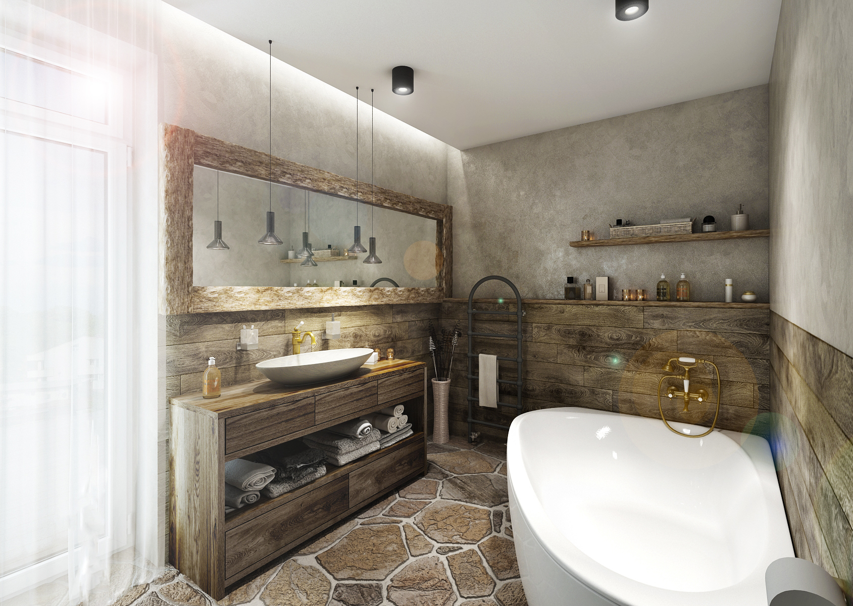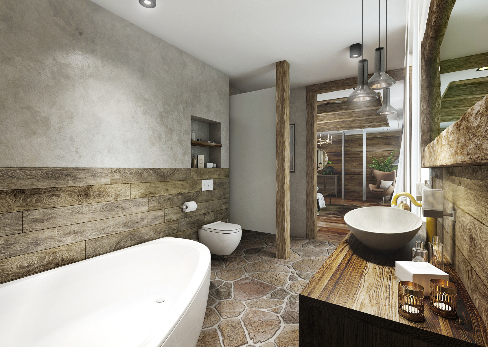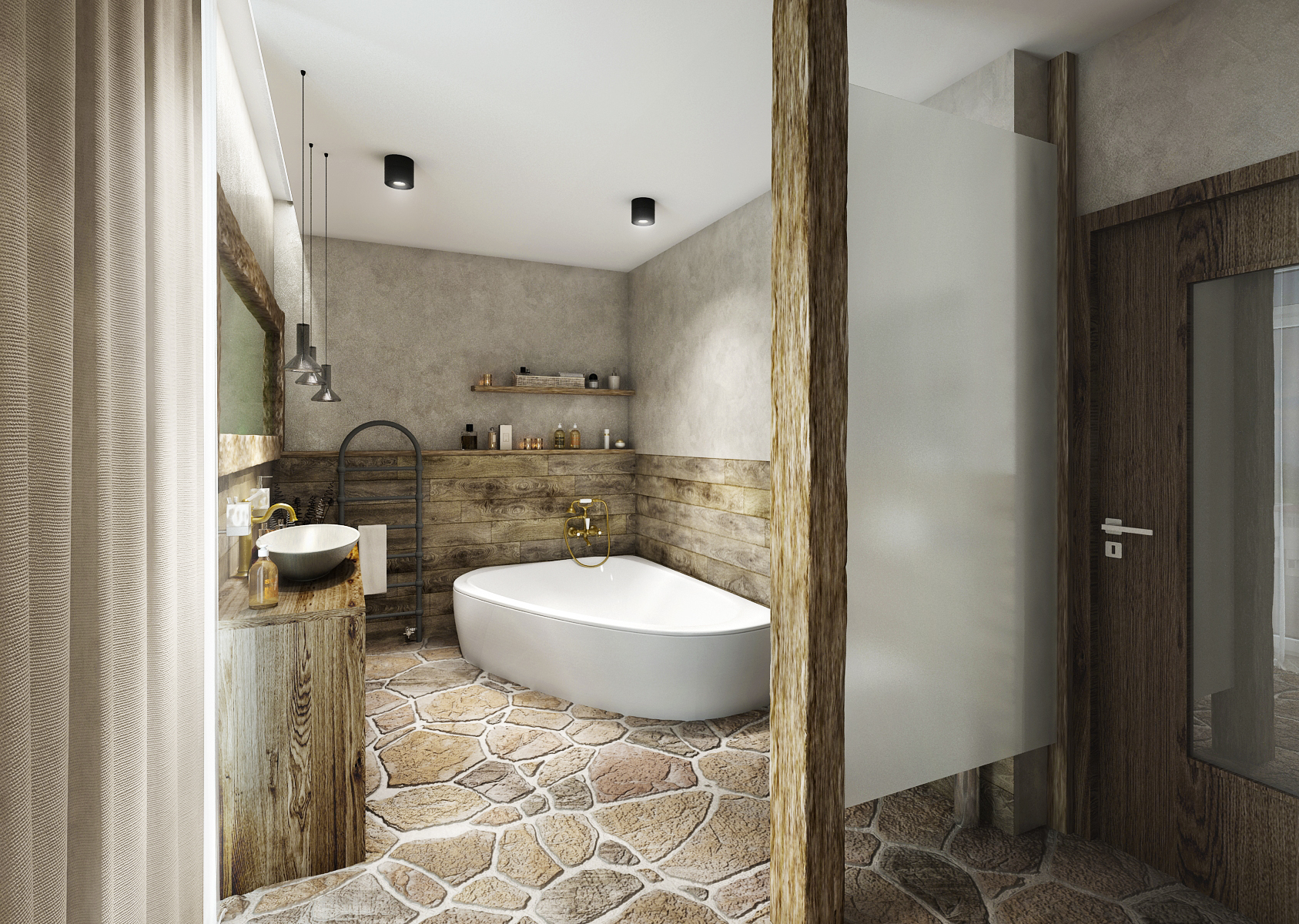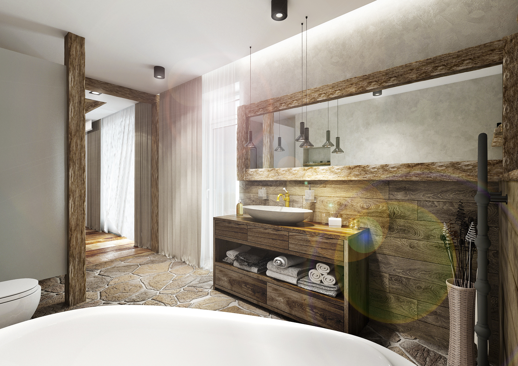 The open bathroom, which is connected to the bedroom only by a passage, is furnished again using solid wood, which is also used as a mirror frame. Paving made of irregular stone surfaces only emphasizes the natural atmosphere of the interior.