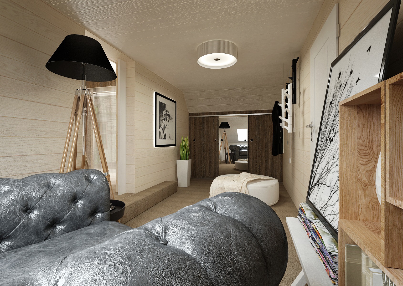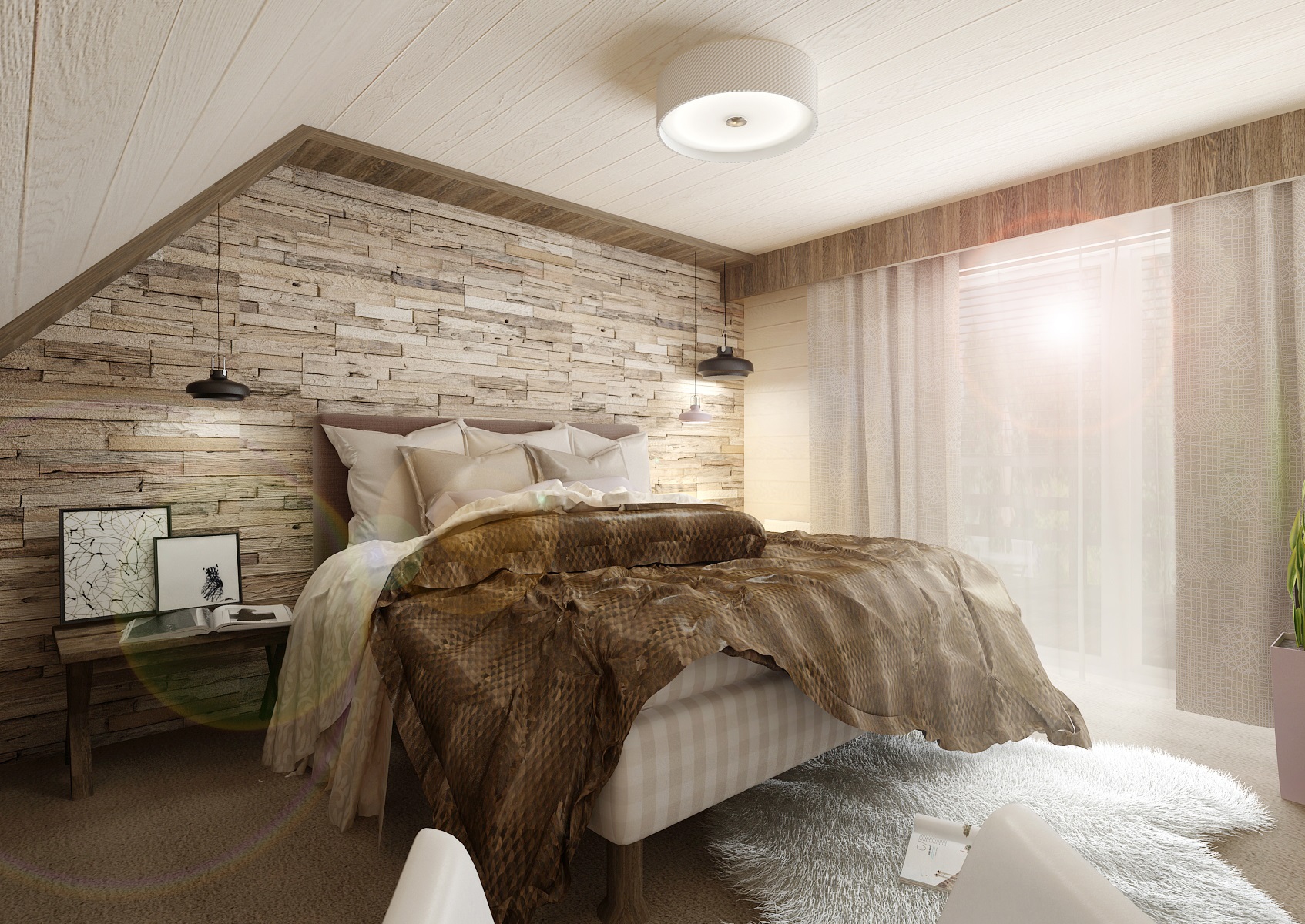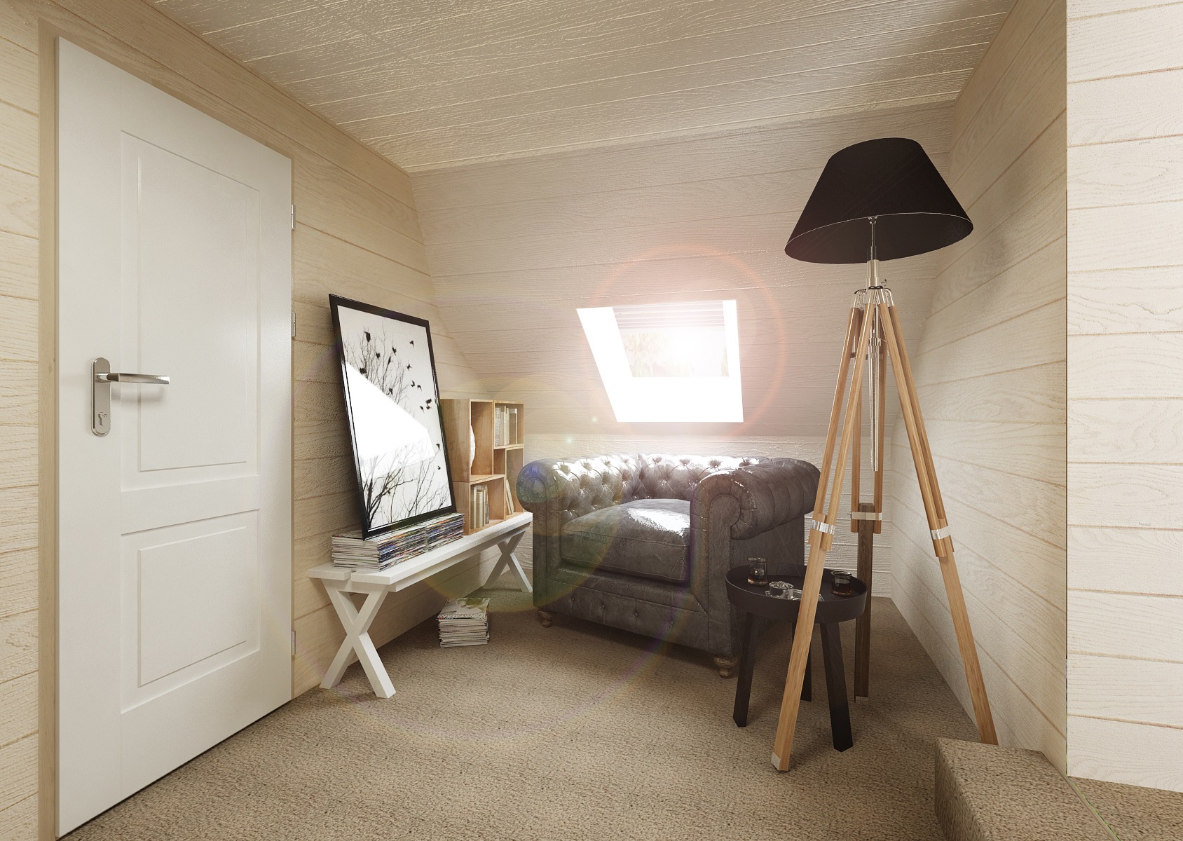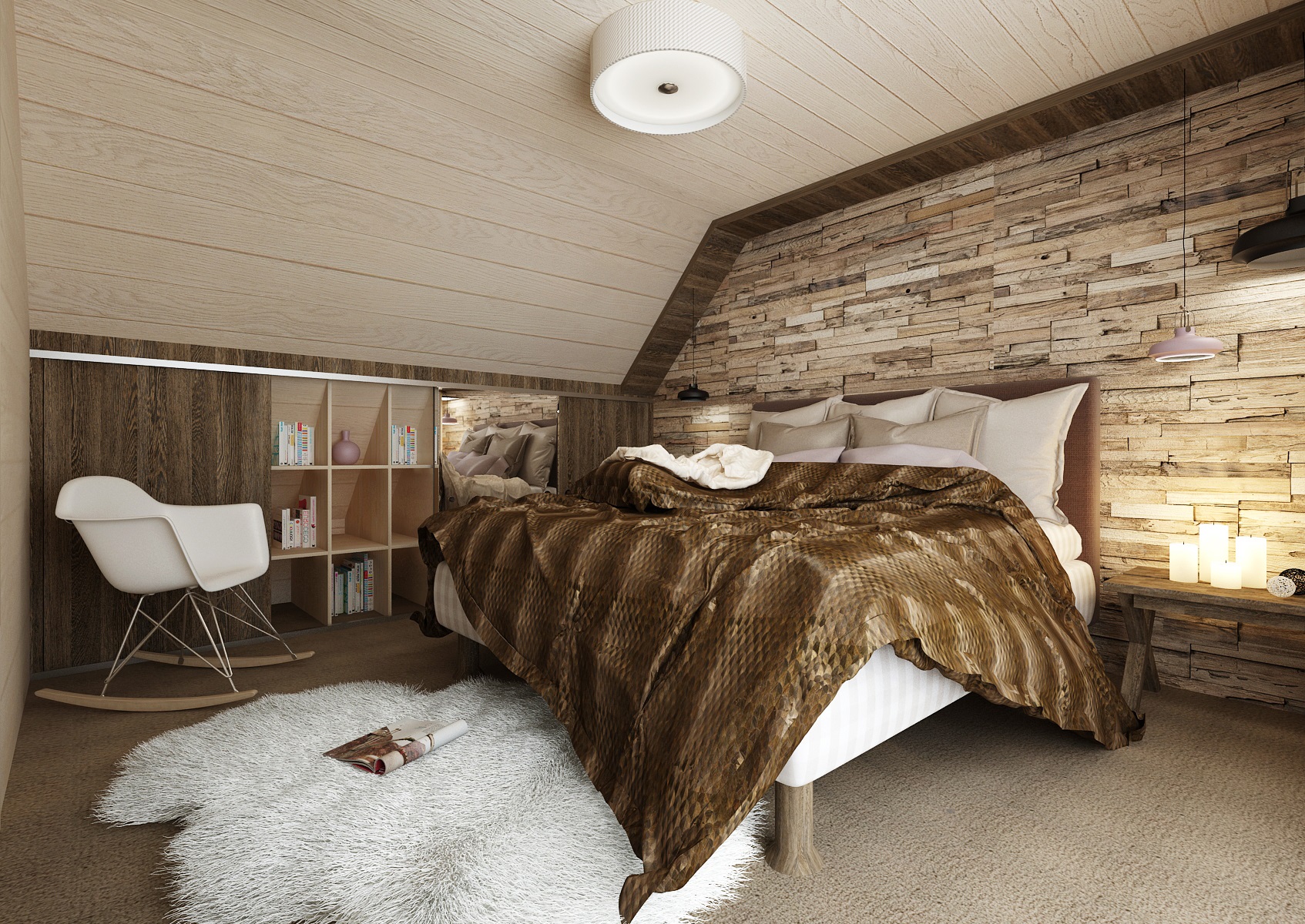 The bedroom in the attic of the weekend cottage is definitely not missing anything. The Hästens bed guarantees perfect comfort. The room is lined with spruce wood, with the exception of the wall behind the headboard, where a combination of different wood paneling decors was used for the effect. The furniture is made of dark mud oak in contrast. also a cozy reading corner.