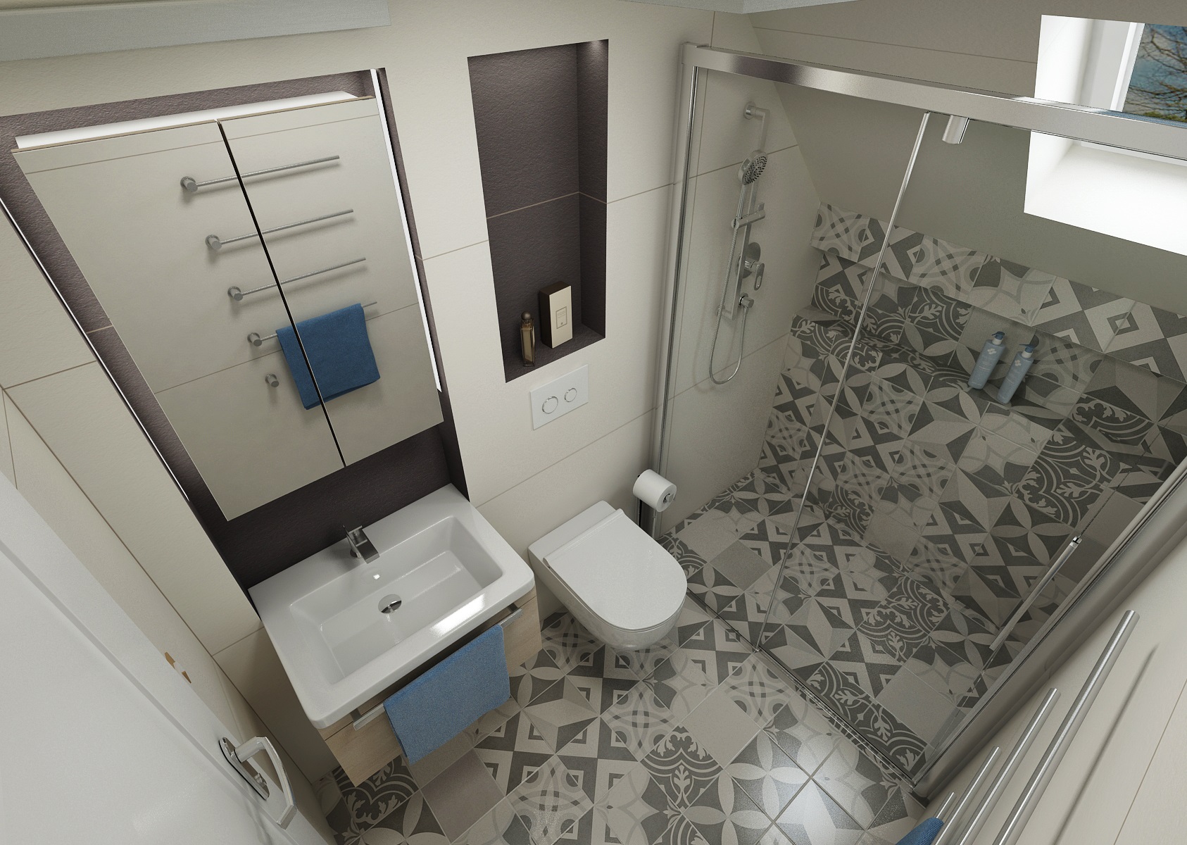 In the adjoining mini bathroom, a patterned retro tile Recer-Twenties. is used to enliven it.