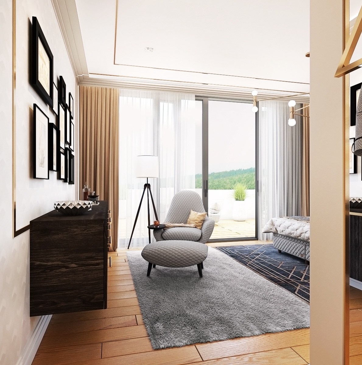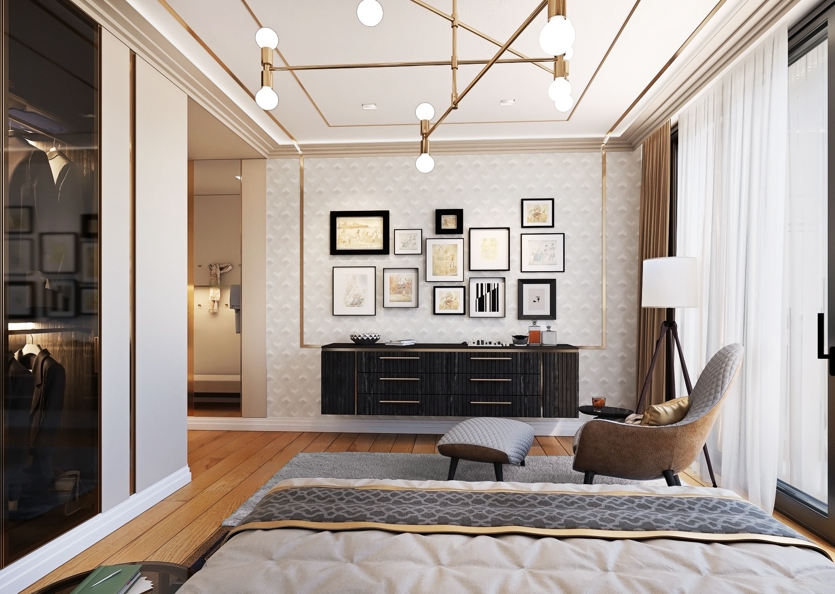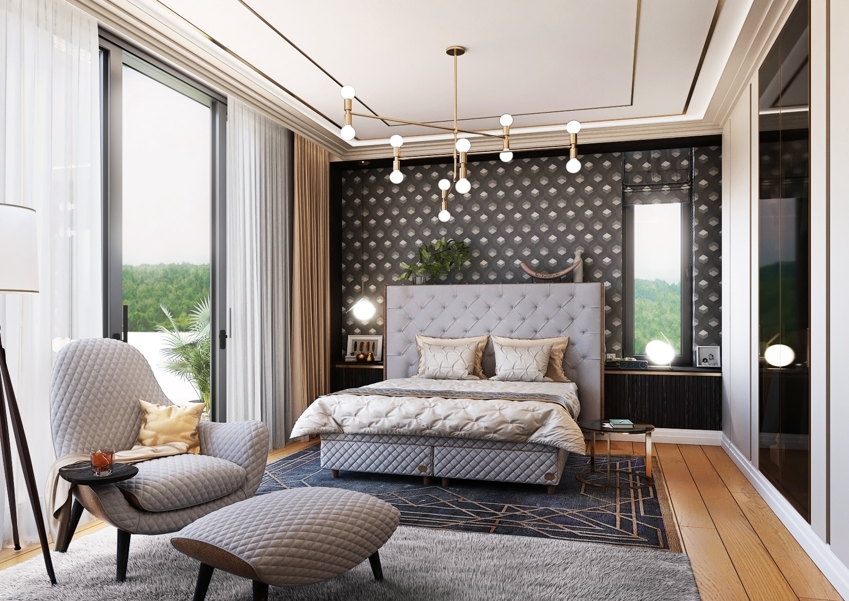 The ceiling is decorated with a geometric golden lamp that shines above the bed and completes the luxurious atmosphere of the bedroom. The contrast between dark elements and golden accents gives the room dynamism and modern elegance. A large window lets in plenty of natural light and provides views of the surrounding landscape, while silver curtains offer privacy and light control as needed.