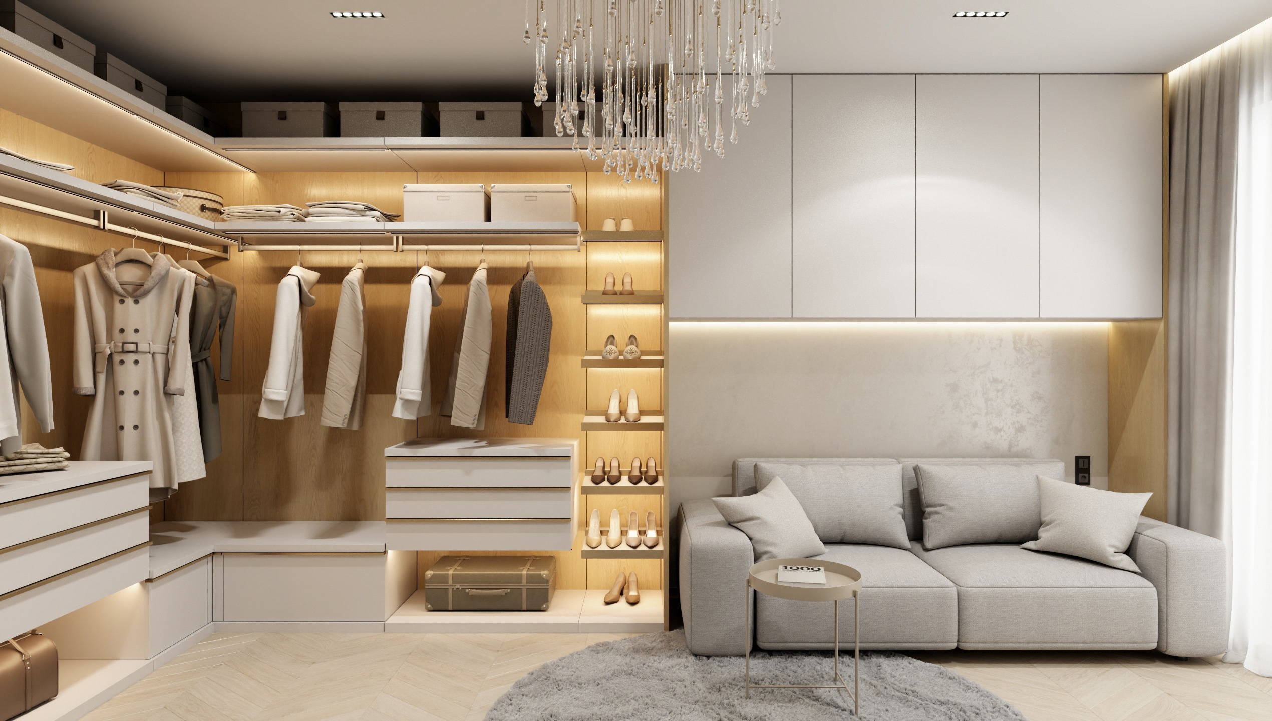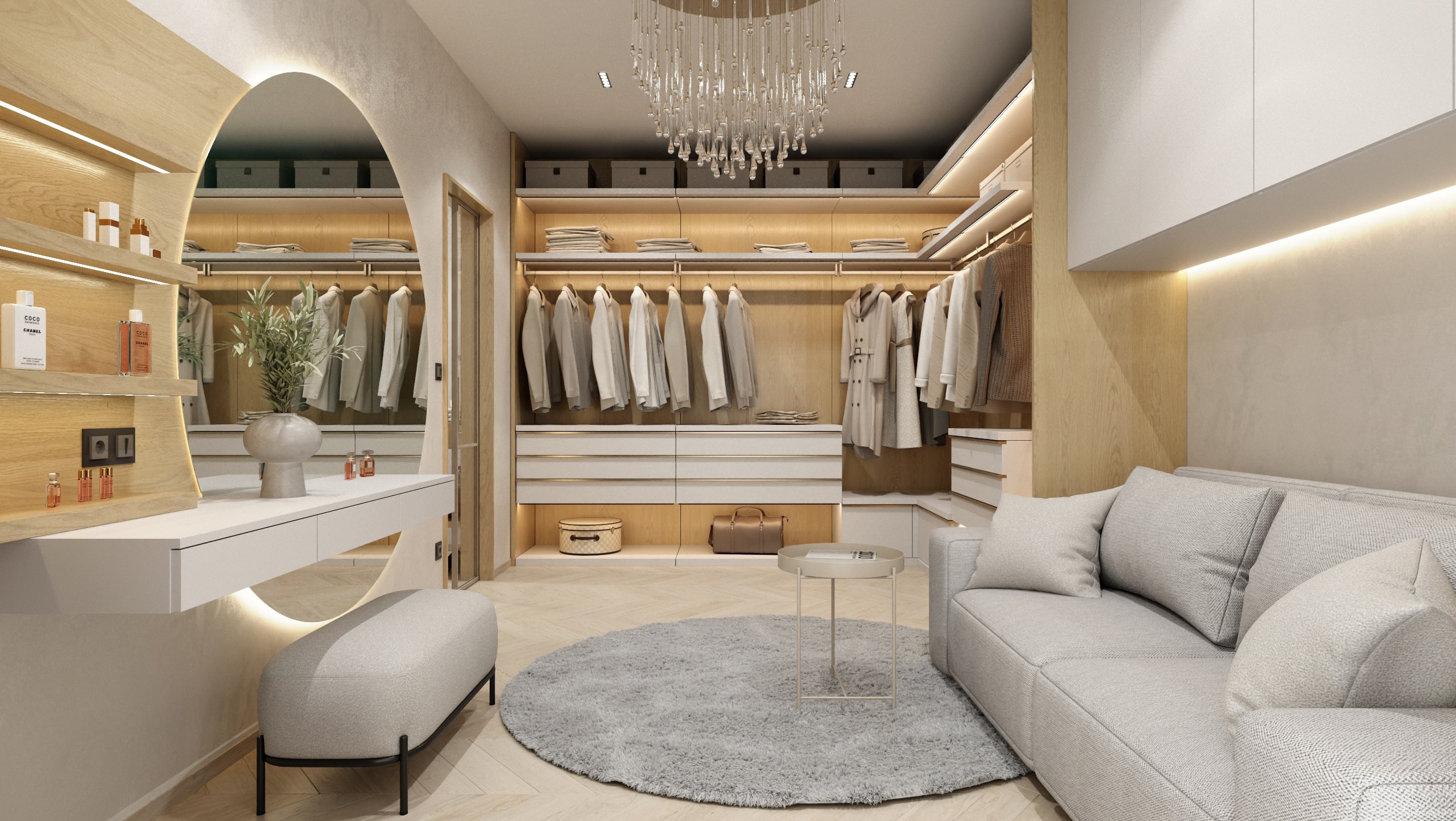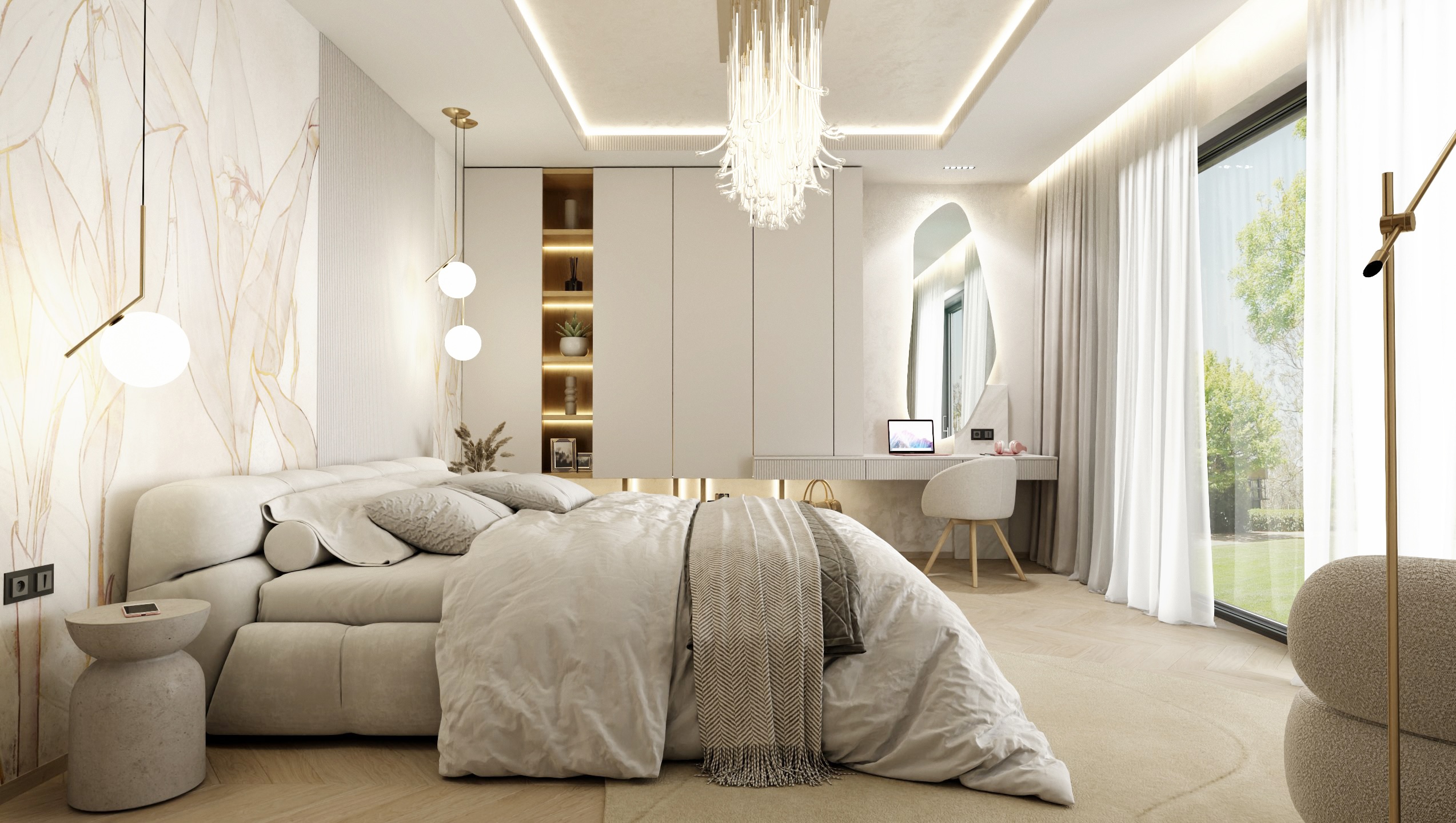 The bedroom feels airy and cozy thanks to light-toned furniture, soft textiles and carefully selected lighting. The dominant upholstered bed in combination with a soft blanket and pillows invites you to relax, while modern pendant lights and a ceiling chandelier add a touch of luxury to the space.