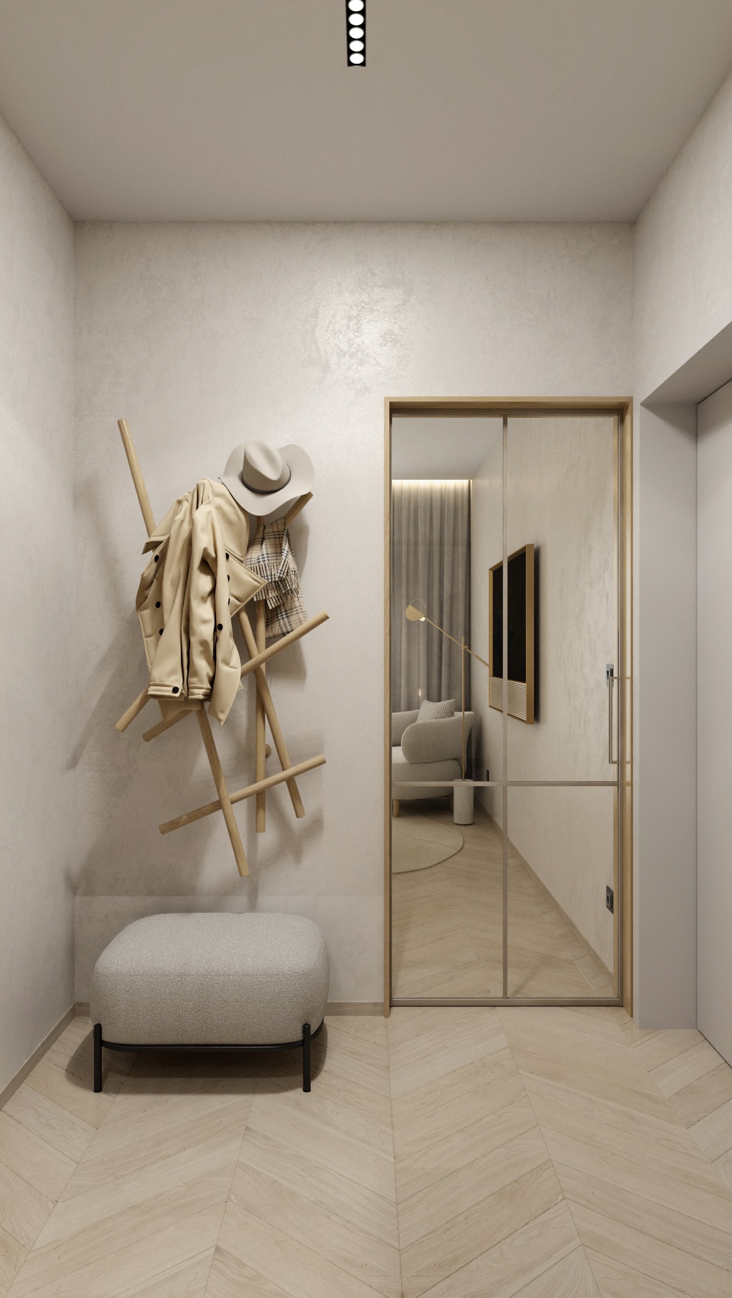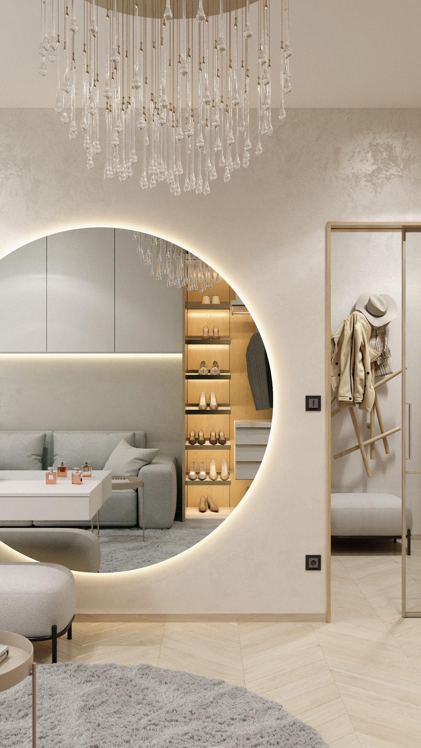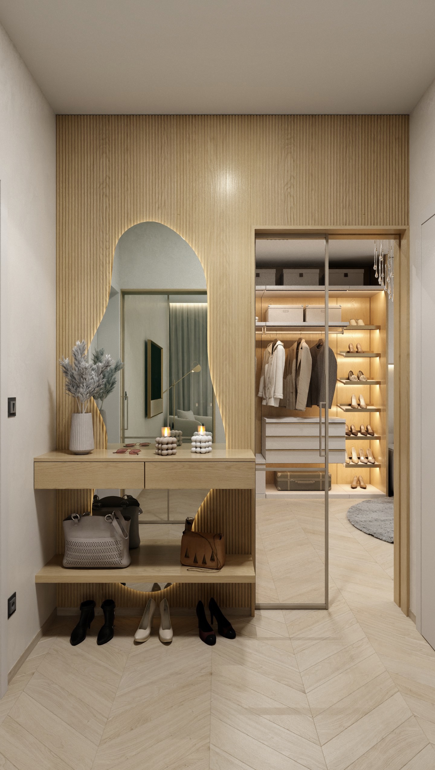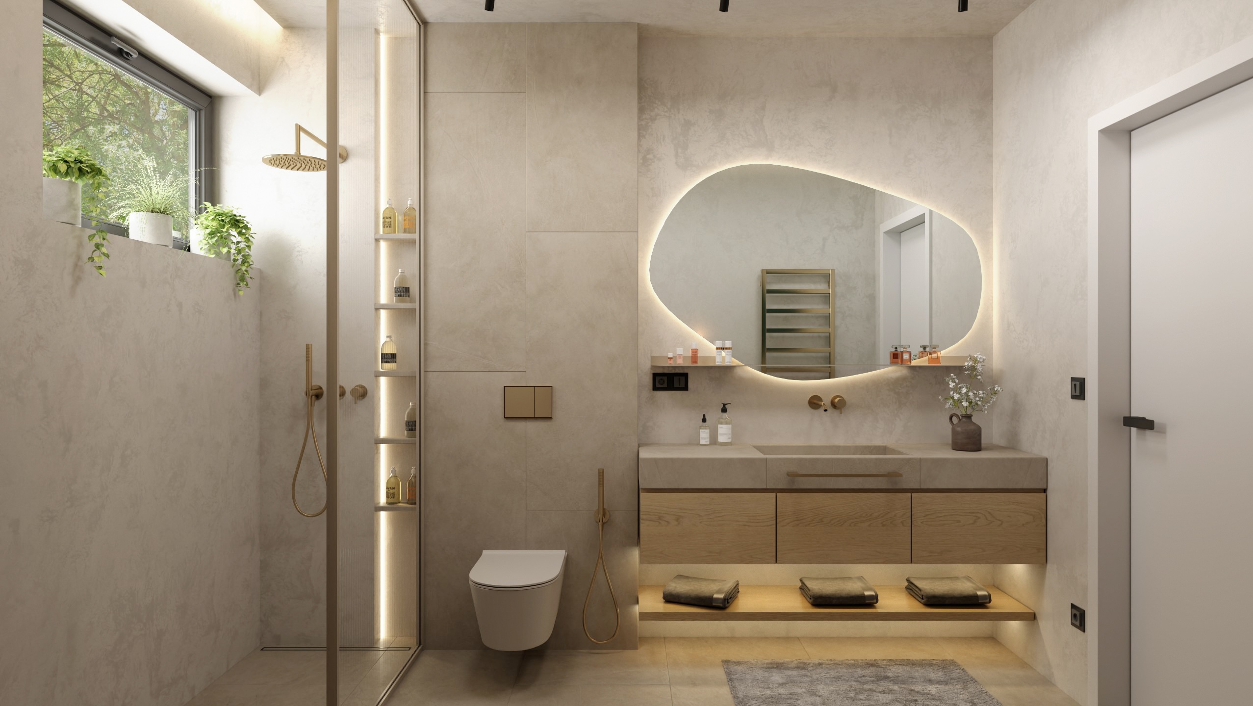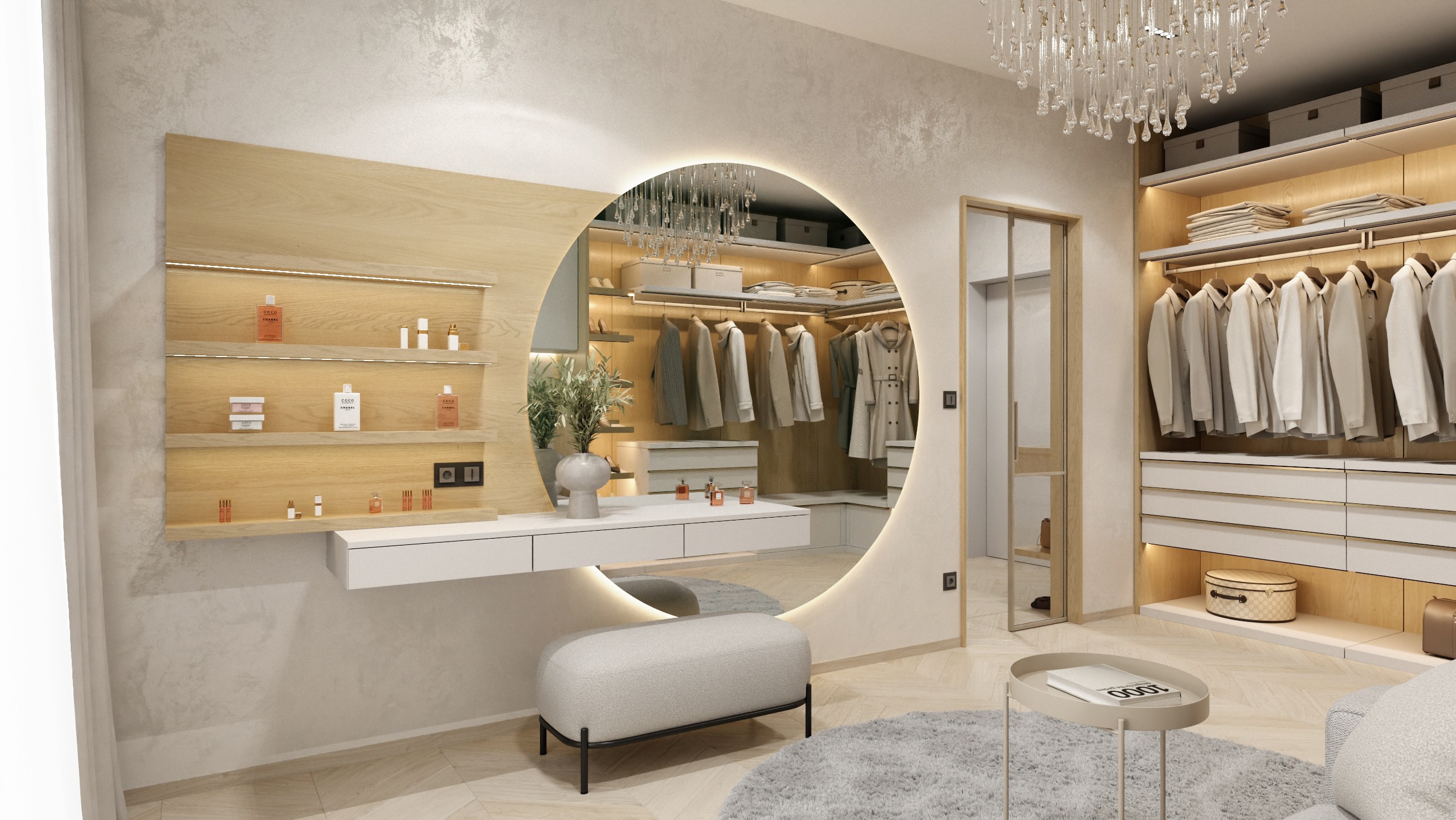 The design is thought out down to the last detail - from the backlit bookcase under the wardrobe to the organically shaped mirror and the subtle floral motif on the wall. Natural light streaming in from the large-format window highlights the soft shades and creates an elegant and harmonious environment.