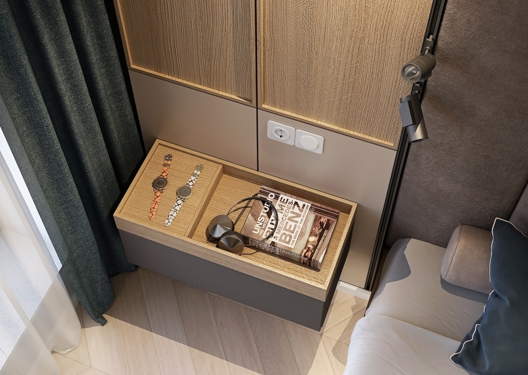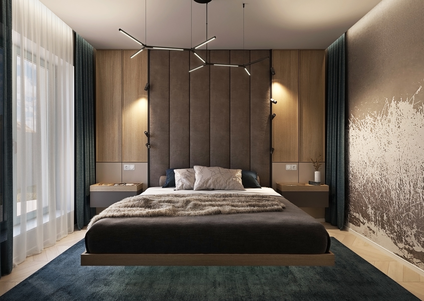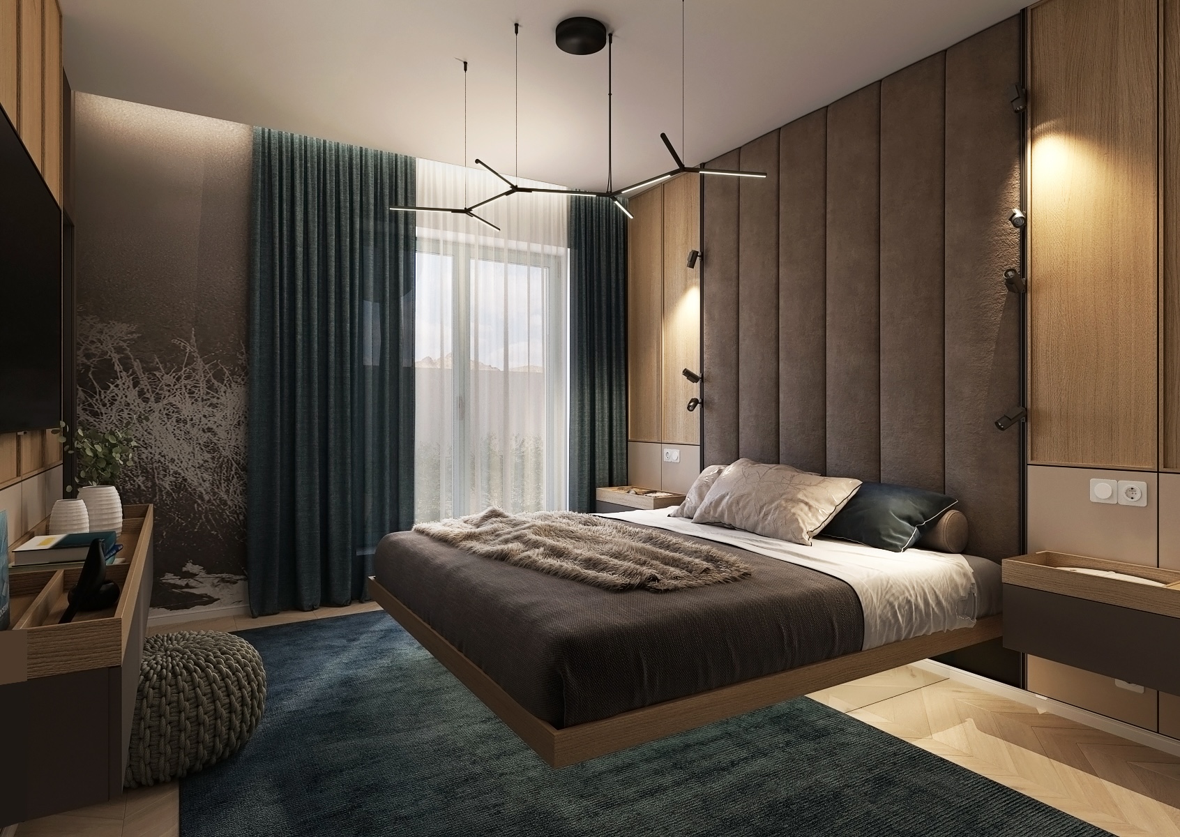 The dominant feature is the large headboard upholstered in dark fabric, which gives the space a feeling of coziness and sophistication. The lighting installations are geometrically designed, creating an interesting contrast with the simple and calm rest of the room. Textile accessories such as a leather blanket and cushioned cushions add to the overall sense of elegance.