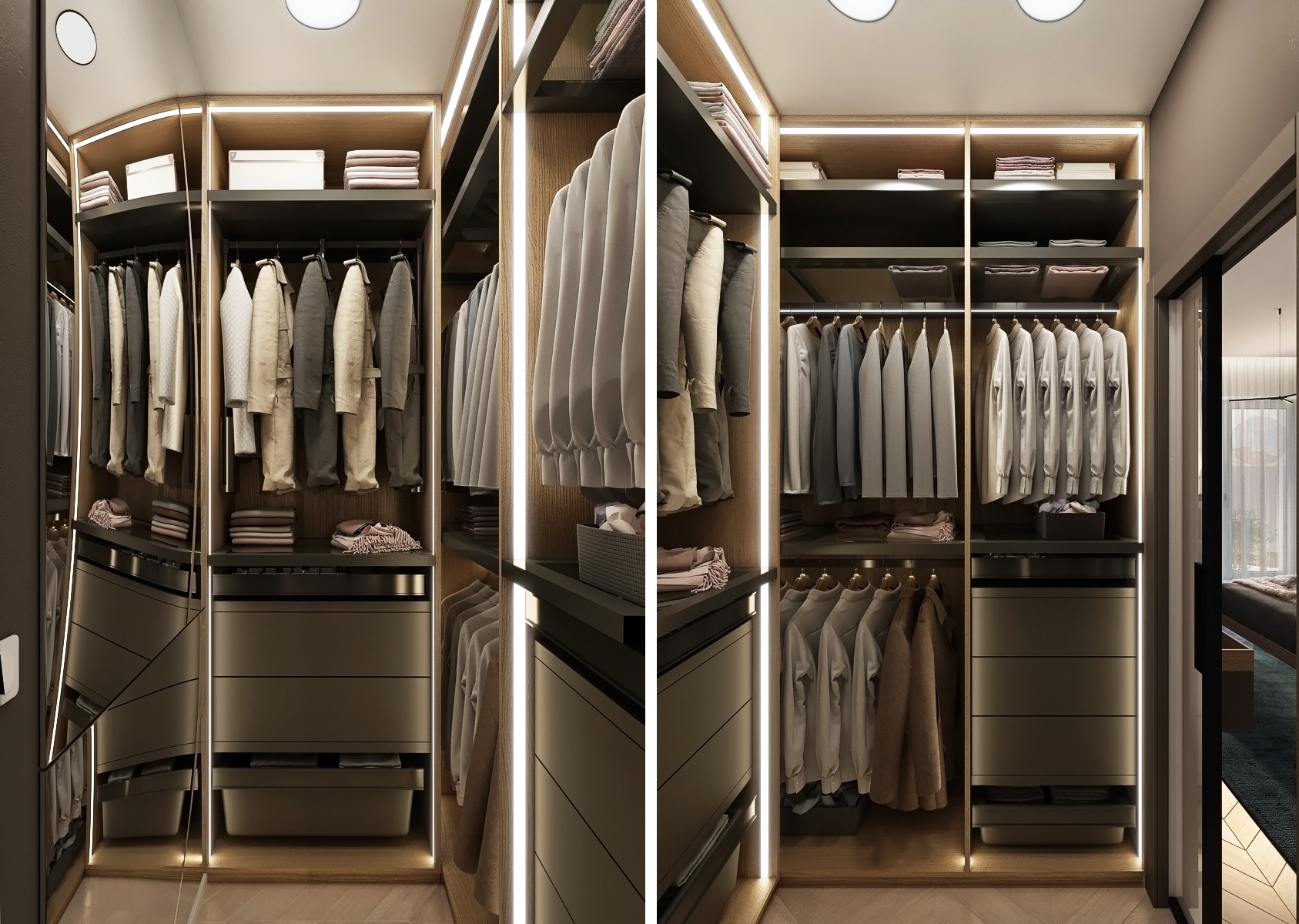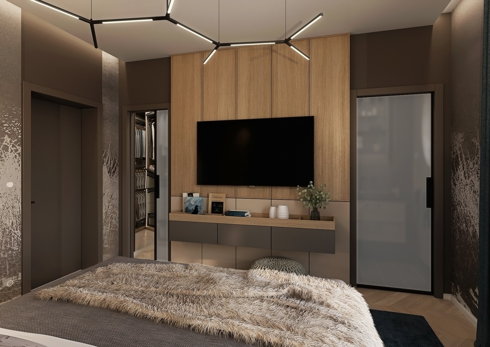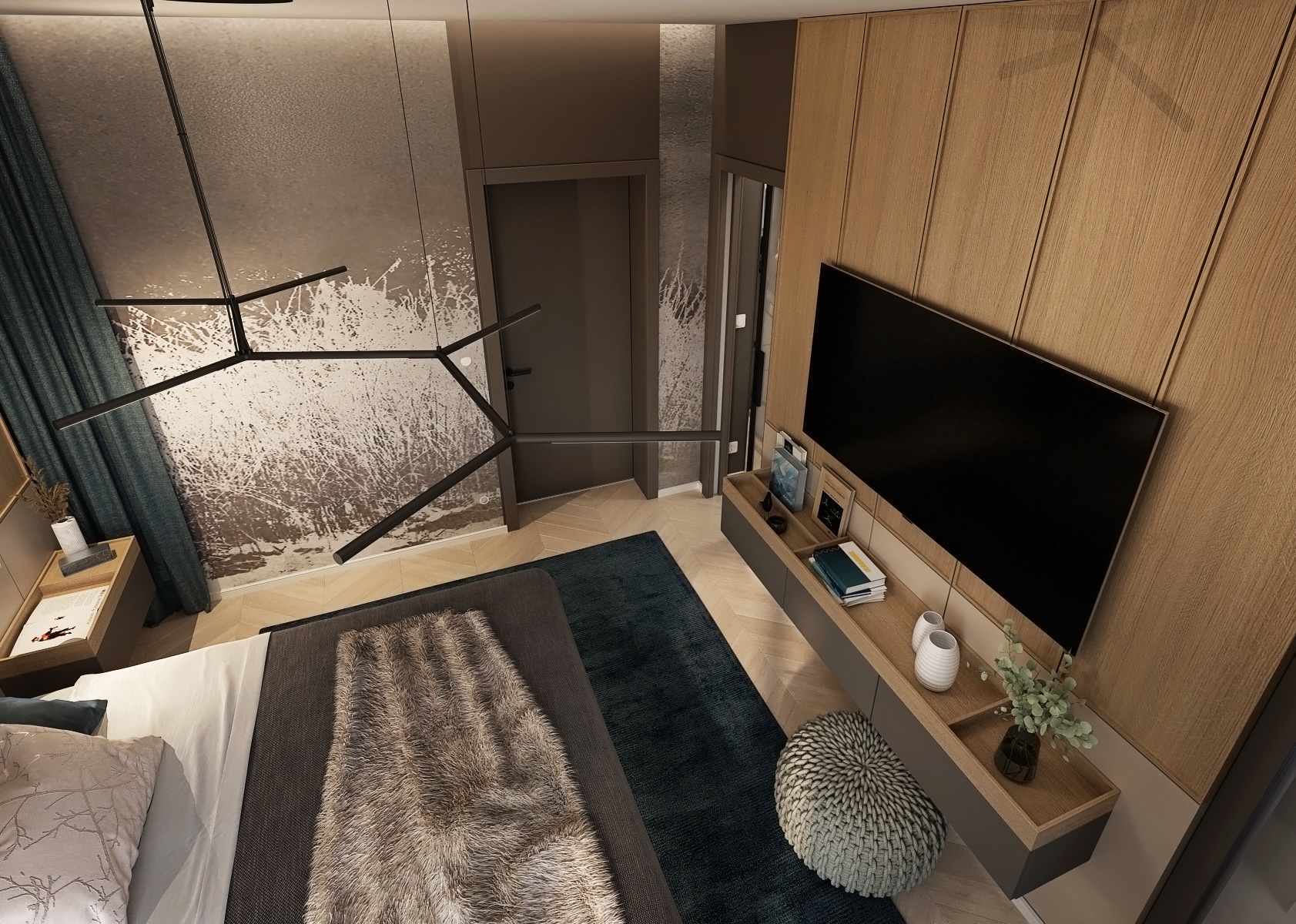 The bedroom stands out for its clean, modern design with an emphasis on natural materials and subtle color combinations.