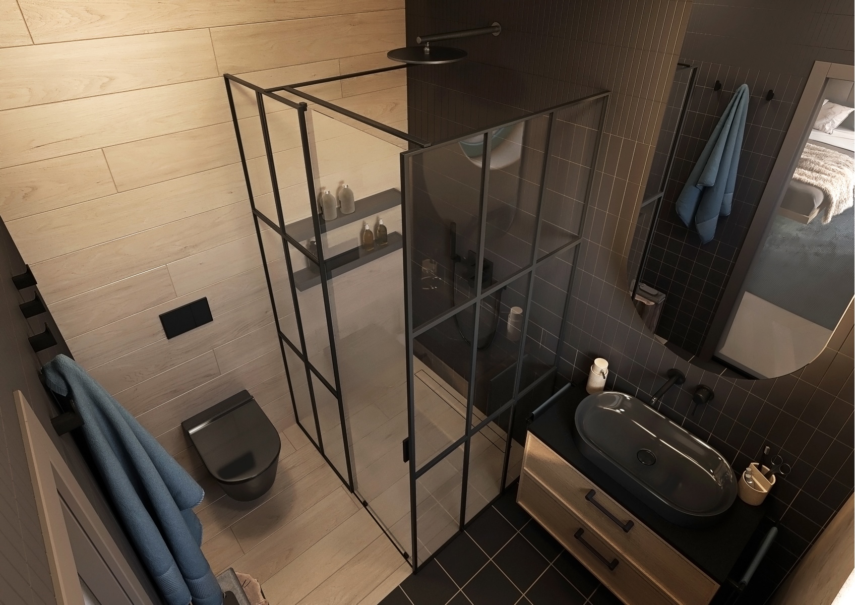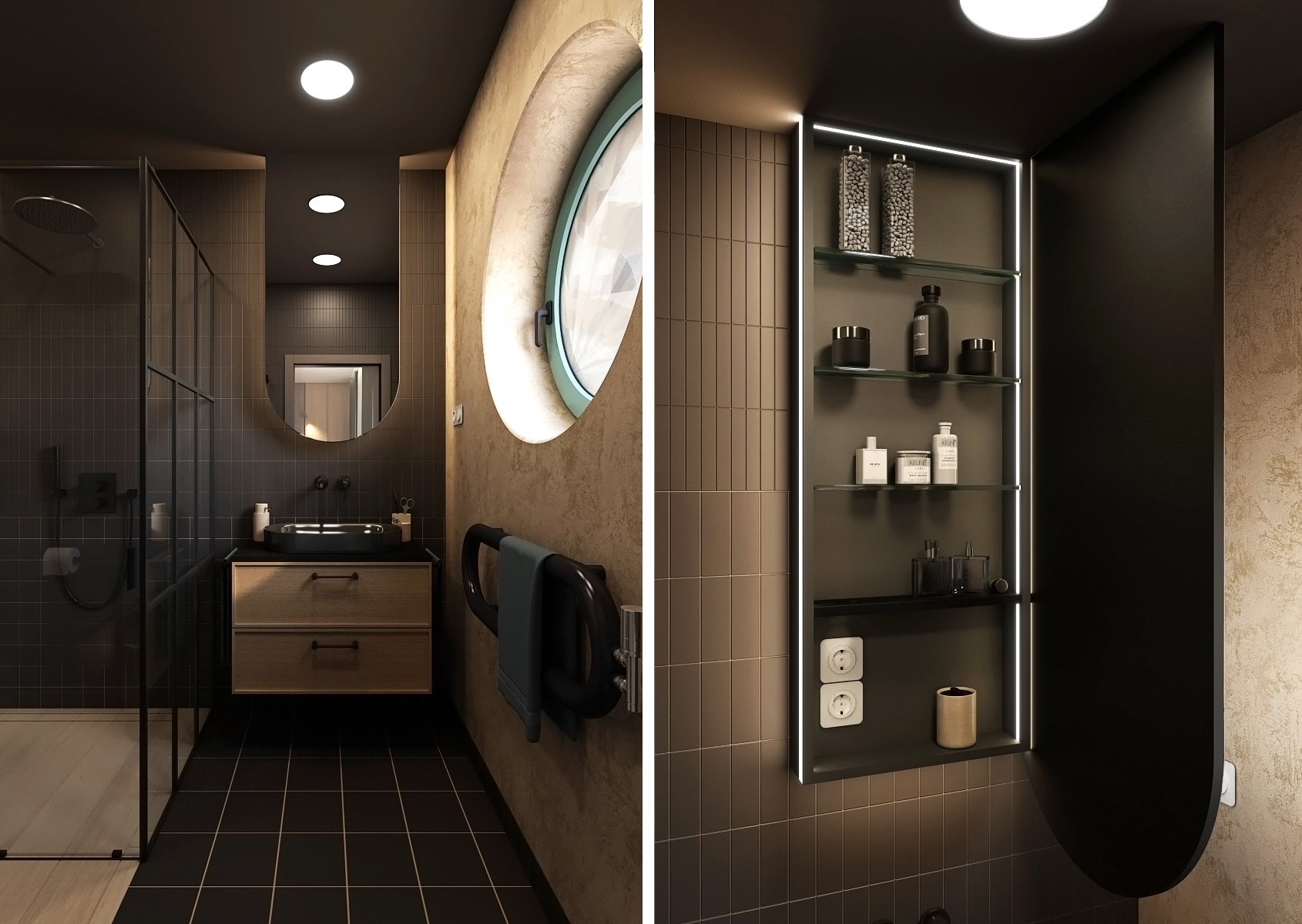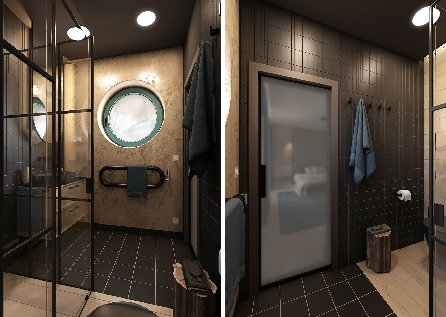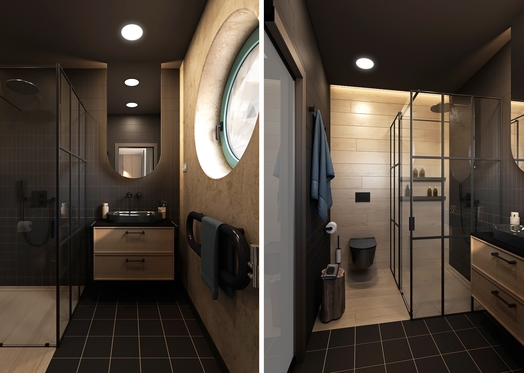 The bathroom is in the spirit of modern minimalism with dominant black elements. A glass shower screen with a black frame underlines the industrial style of the room, while the rest of the space in wood and stone tones adds coziness. An elegant round window brings natural light into the bathroom and creates a space full of peace and cleanliness.