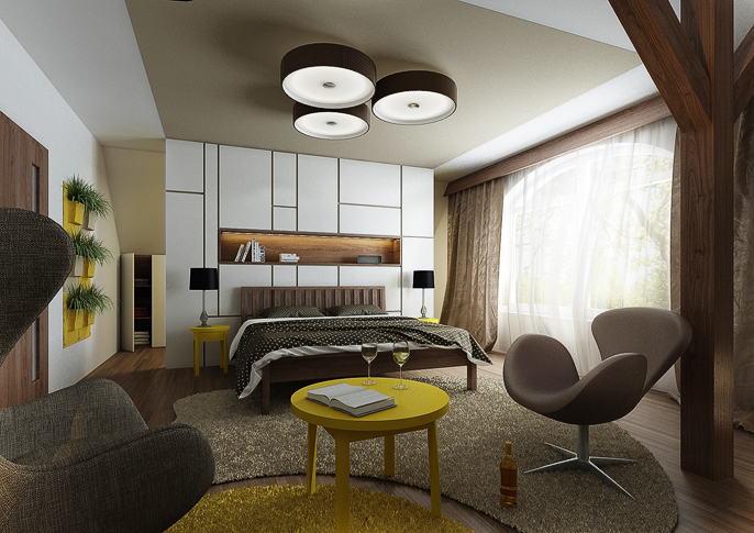 Stylish attic bedroom in earthy colors in Scandinavian style. Design icons from Danish designer Arne Jacobsen - The Egg and The Swan armchairs, are used as seatings. Shades of brown are combined with white and the whole interior is enhanced by yellow accessories. The space is brightened by a light floor, on which tere are interestingly shaped rugs in various shades. The room is sufficiently illuminated by large windows along the lenght of the wall and thus allow a view of the garden. An interesting feature are the wooden support columns.