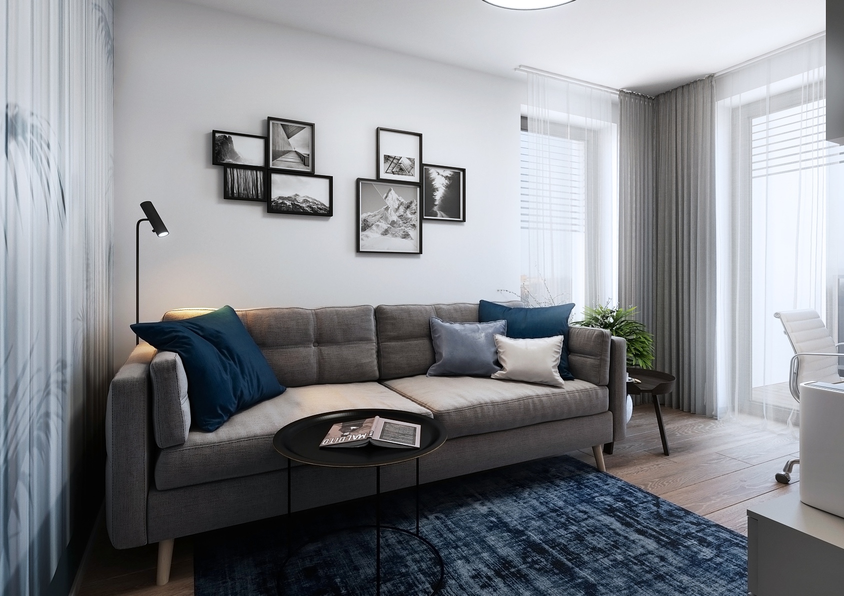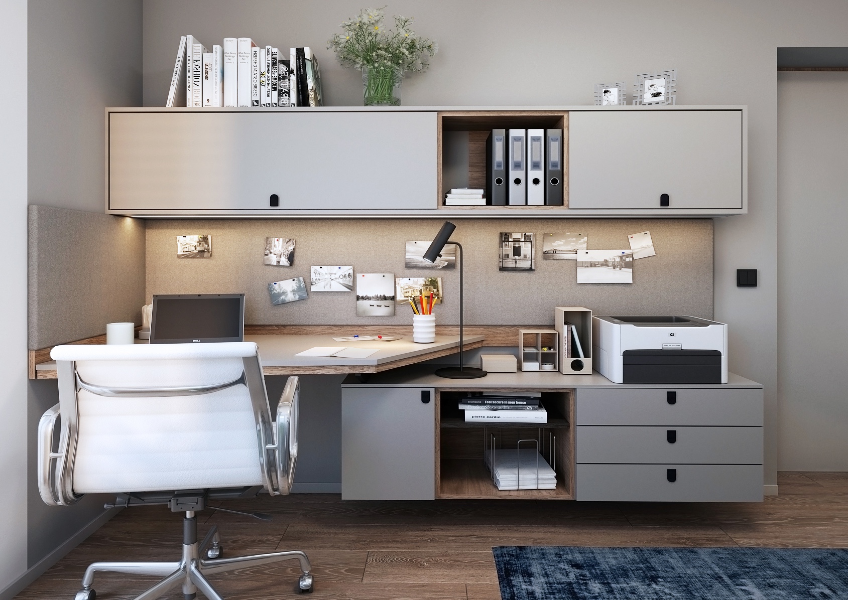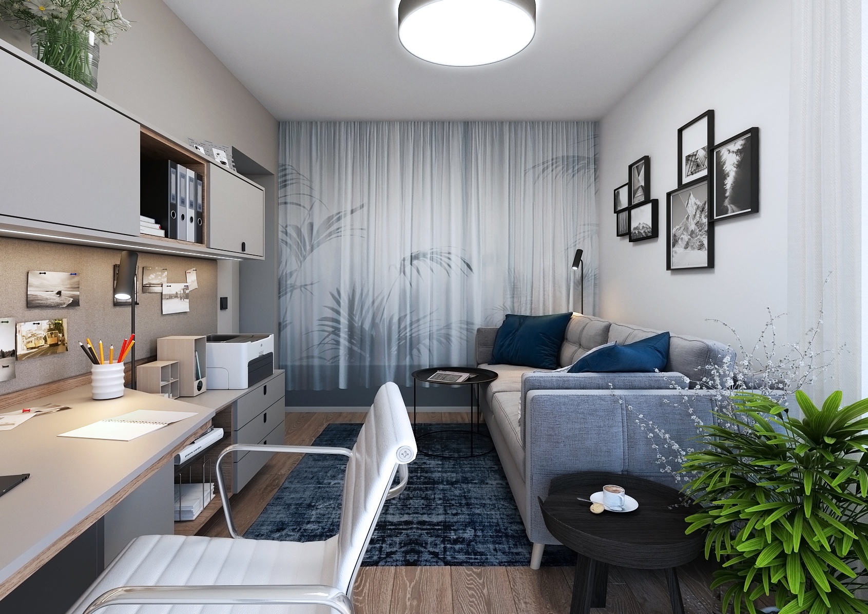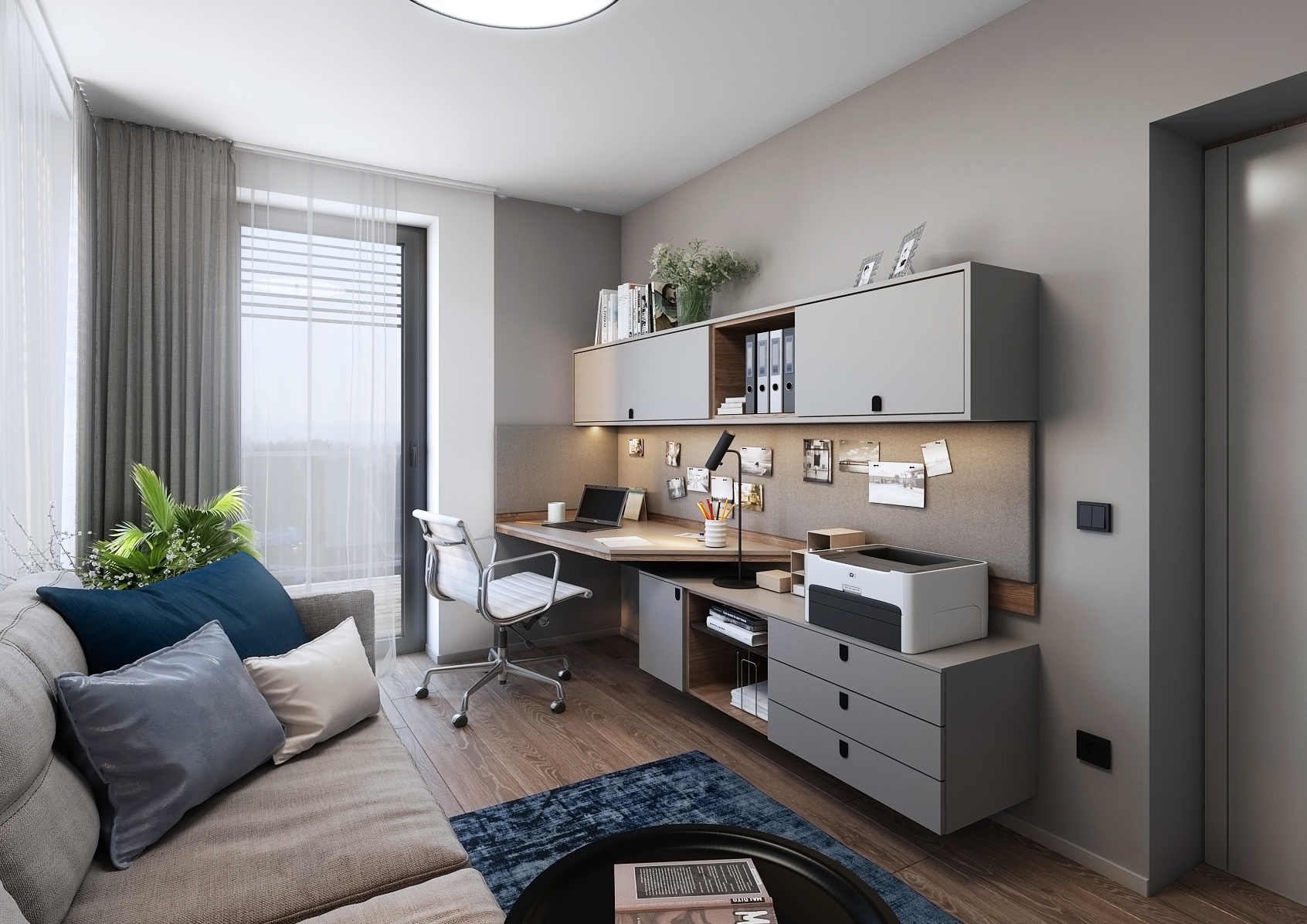 Soft shades of gray and beige dominate here, creating a calm atmosphere ideal for focused work. A spacious work desk with enough storage space is complemented by modern furniture and decorative elements that give the room a special charm. Inspirational photos and pictures hang on the wall above the table, adding to the creative environment. High windows with soft curtains let in plenty of natural light, improving working conditions.