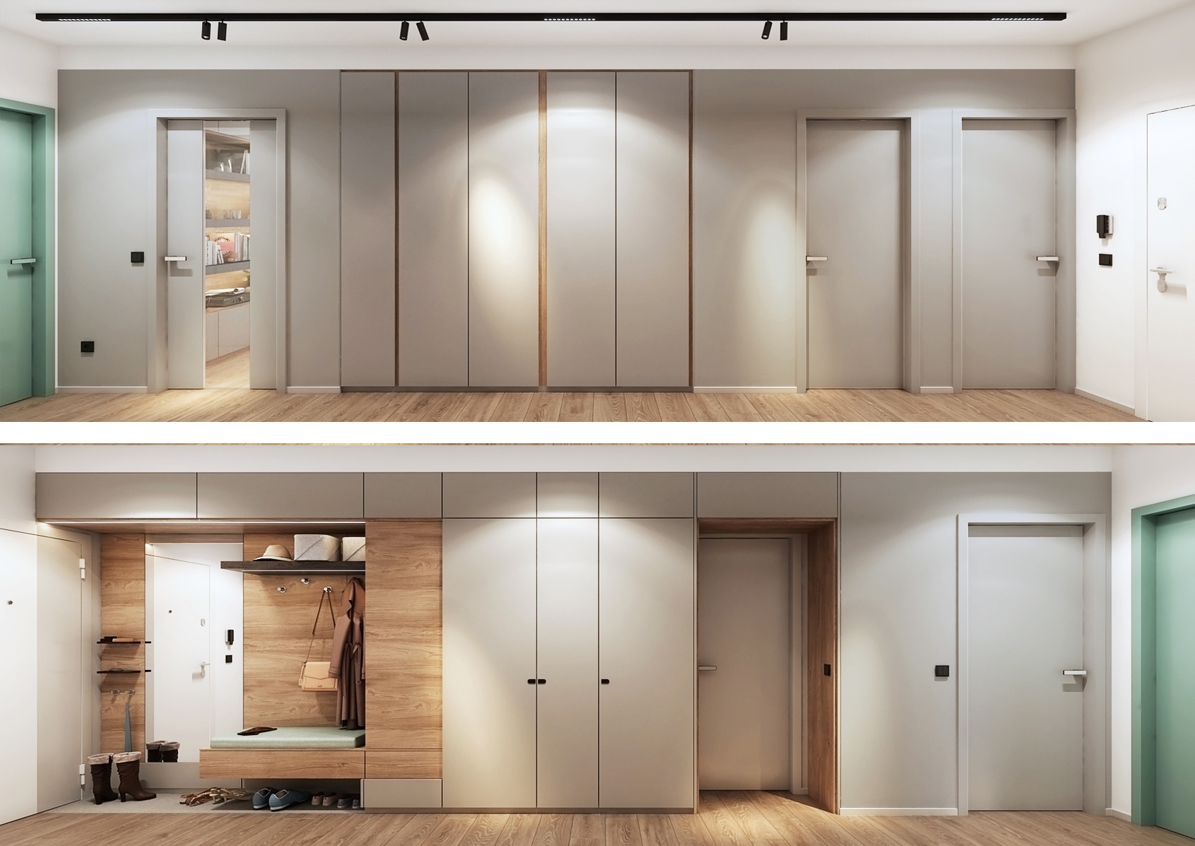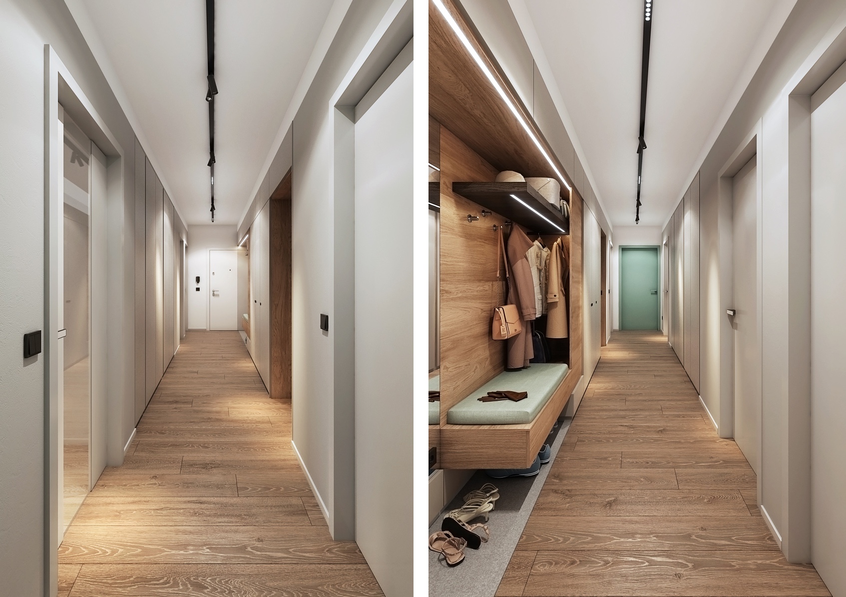 The corridor is long and spacious, with a modern and clean design. The warm-toned wooden floor contrasts with the white walls and built-in furniture, which provides plenty of storage space for coats and shoes. Recessed lighting along the ceiling and built-in furniture give the hallway a sophisticated look while providing sufficient lighting. At the end of the corridor there is a door in a soft pastel color that pleasantly complements the overall appearance of the space. Wooden elements and modern design create a harmonious and welcoming atmosphere that welcomes visitors and residents of the house.