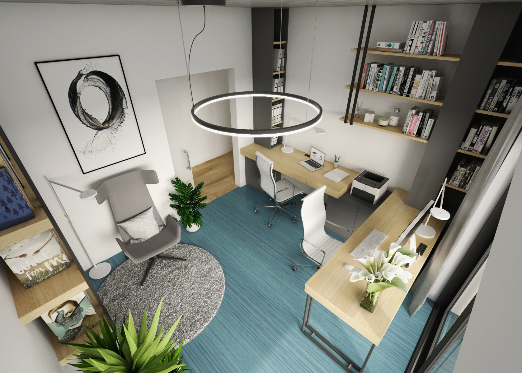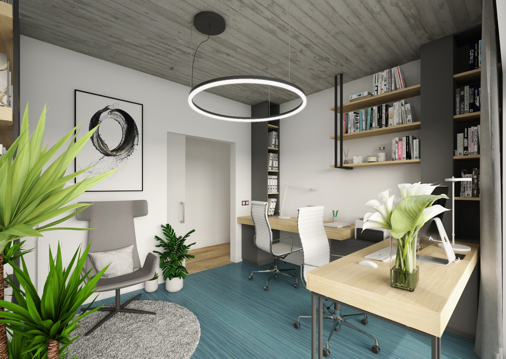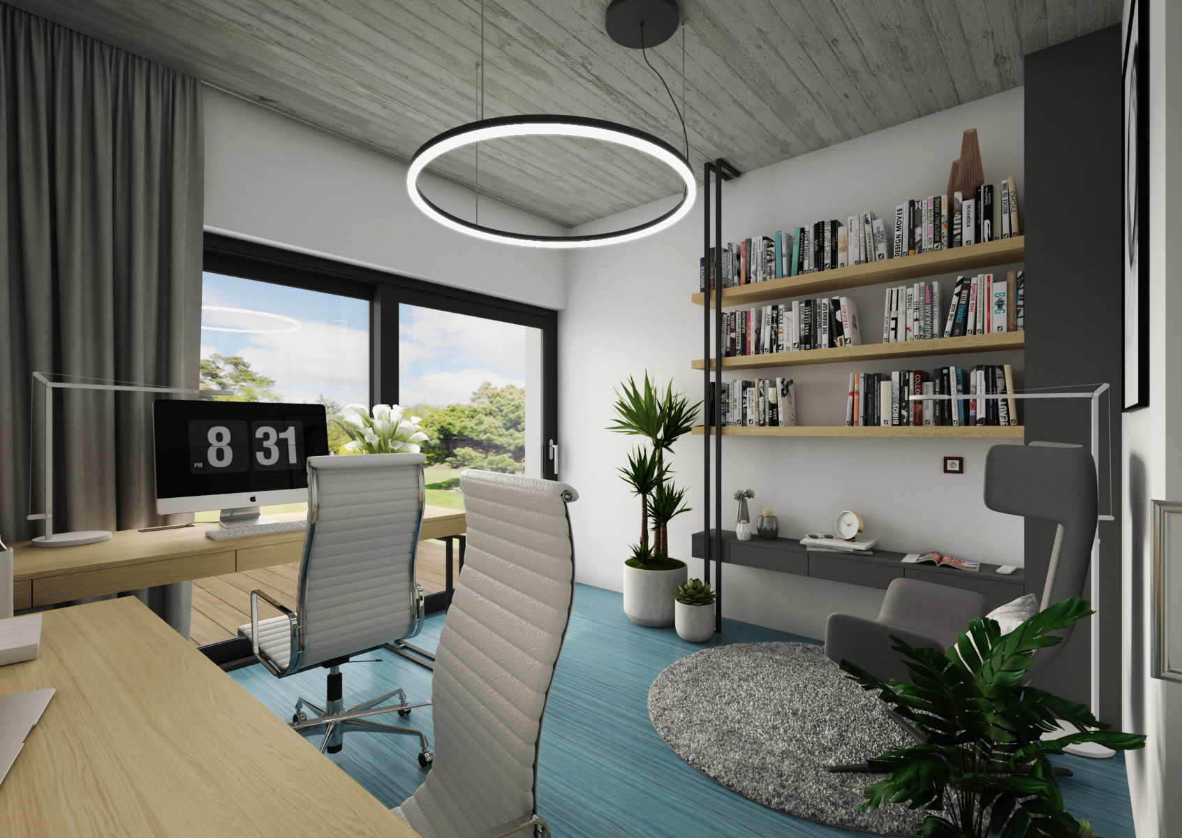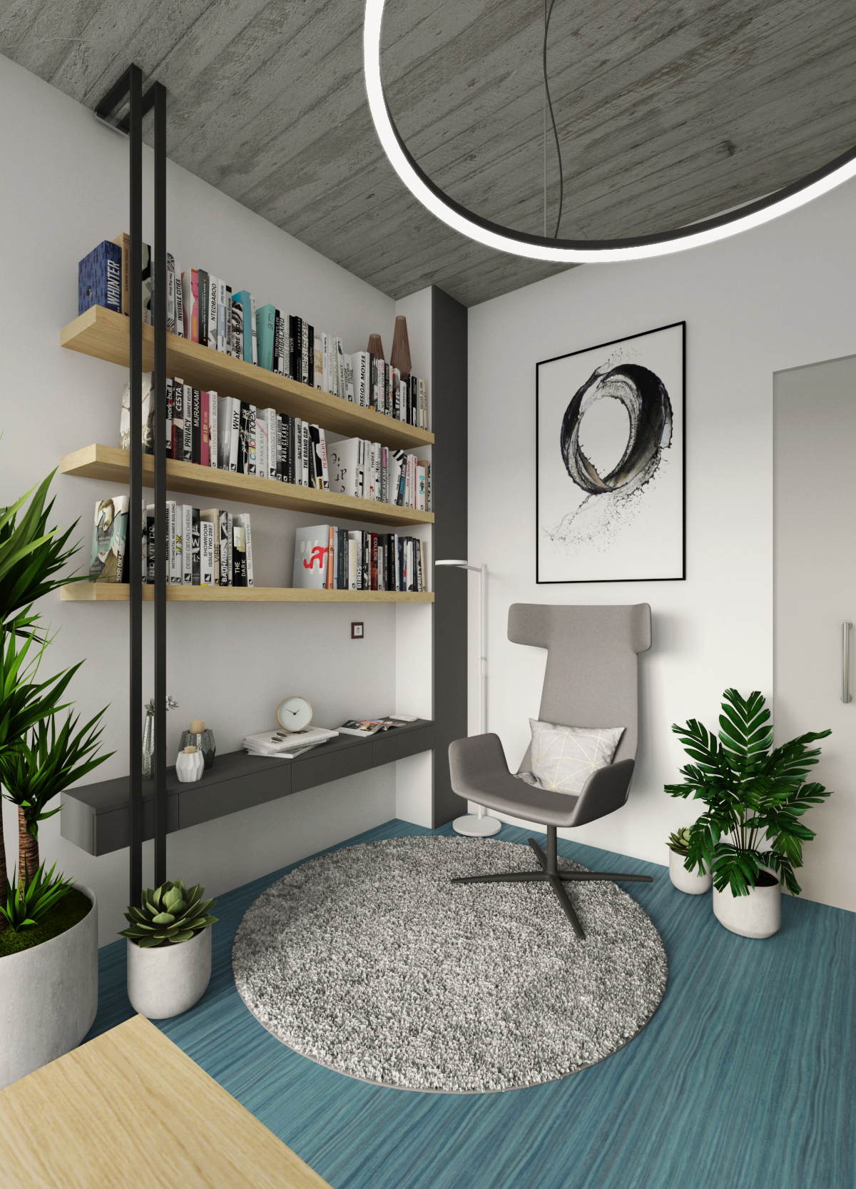 A very interesting element in the room is the concrete ceiling. The selected furniture elements are matched to it. The entrance to the study is solved by a sliding door leading from the corridor. Two desks are placed perpendicular to each other – the first one is located by the window, followed by an open bookcase and storage space for the printer separating the two desks from each other.