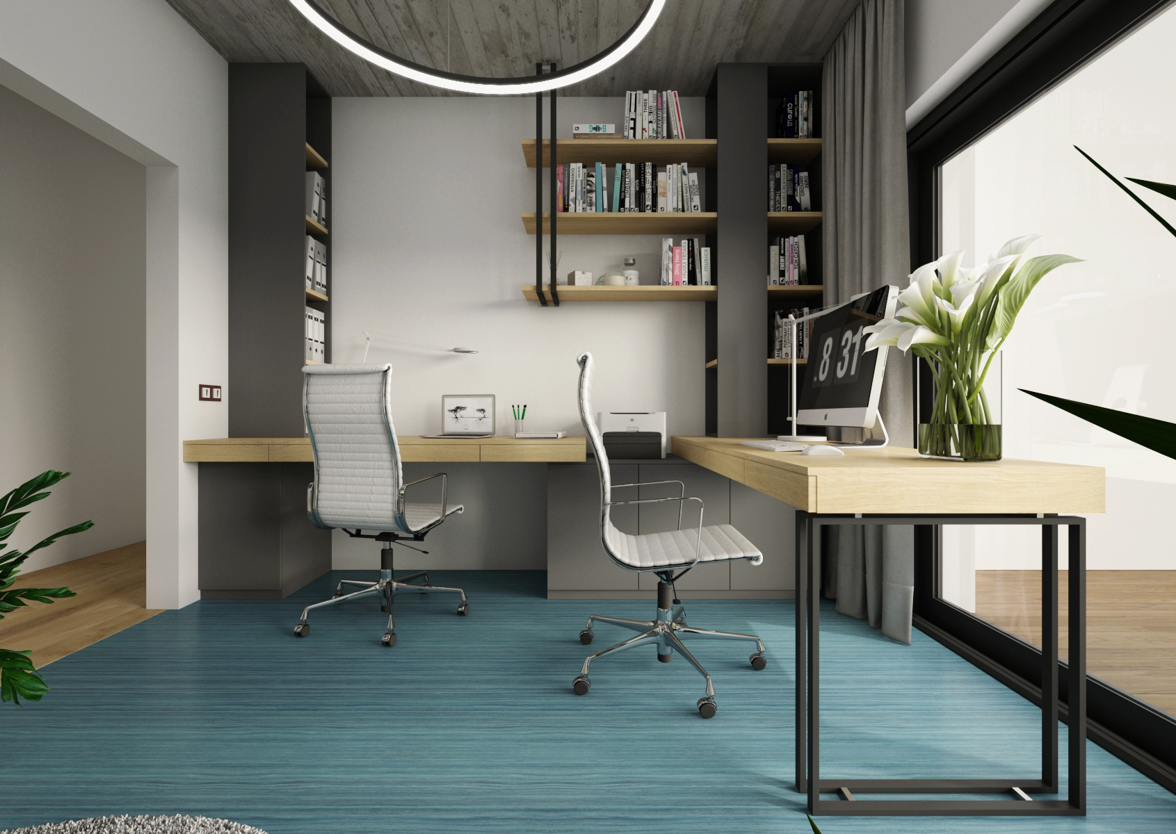 A home office in a family home is designed in an industrial style using gray tones combined with a turquoise herringbone floor.