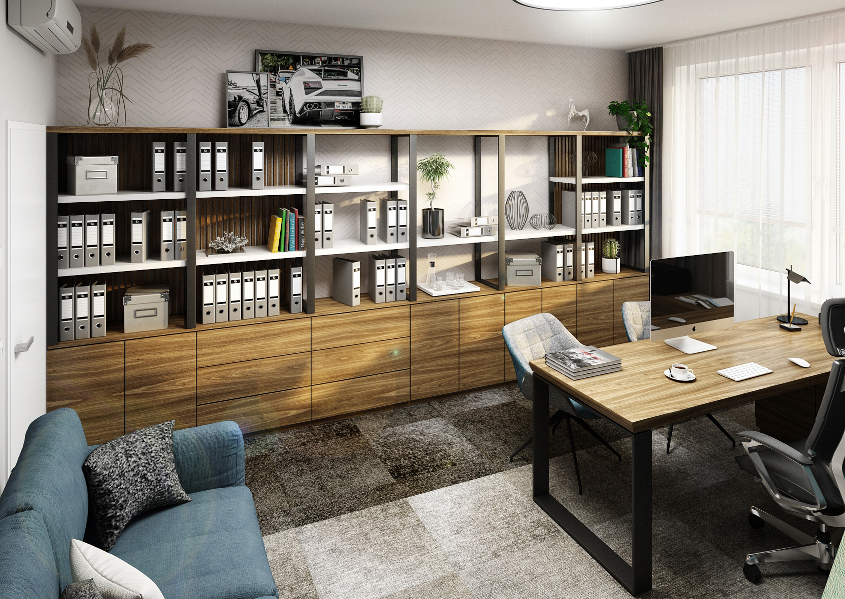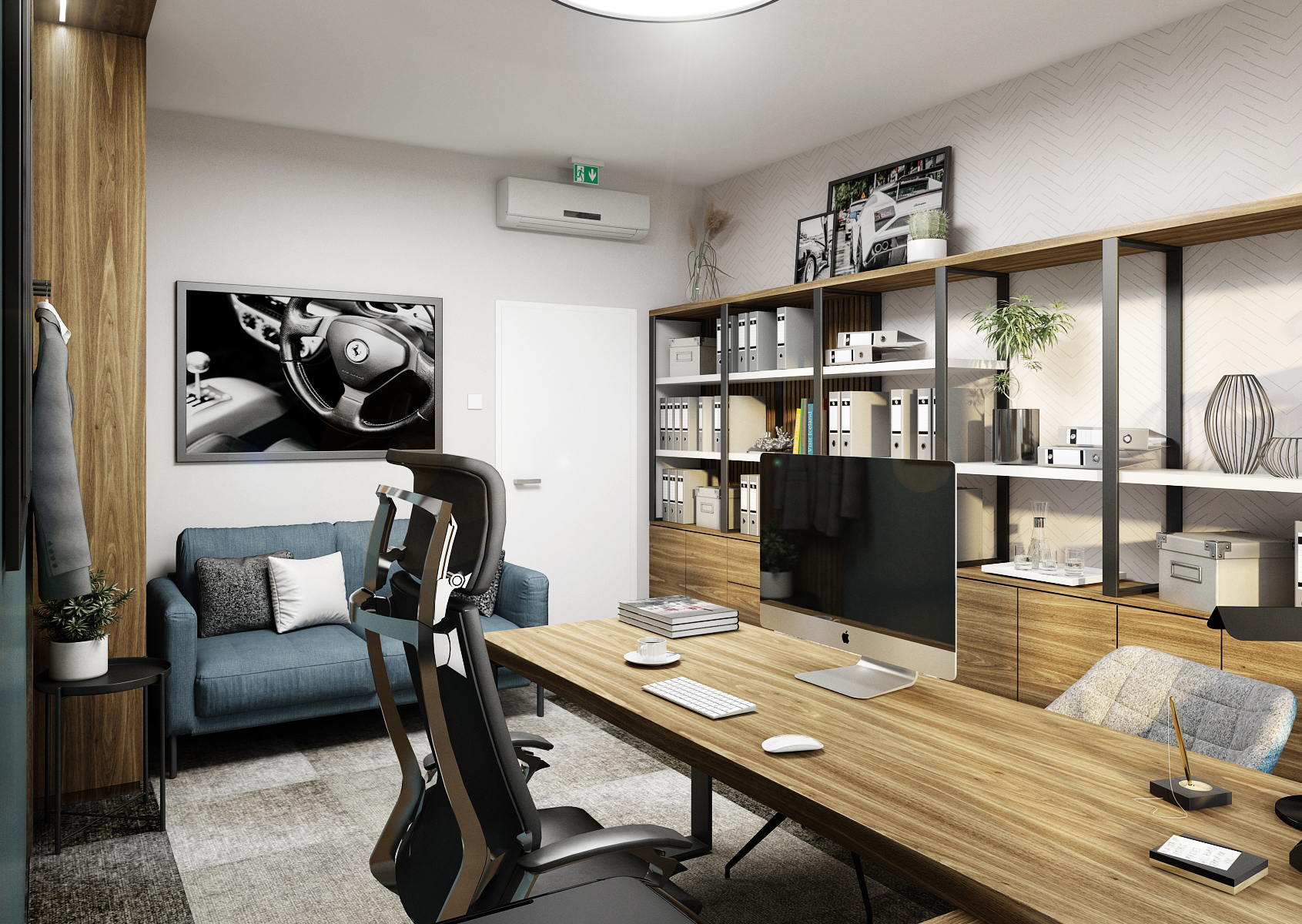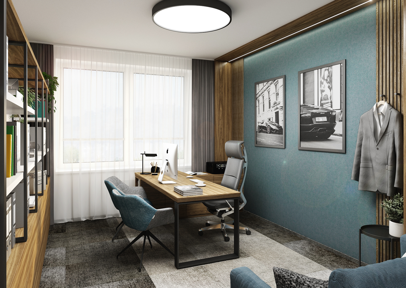 A work desk must not be missing in any study, it is also located with two armchairs for clients by the kerosene wall with a backlit panel, thus emphasizing the color itself and the decorations on the wall. The chosen dark color contrasts with the light part of the carpet, on which the sofa is placed next to the built-in wardrobe and clothes hooks.