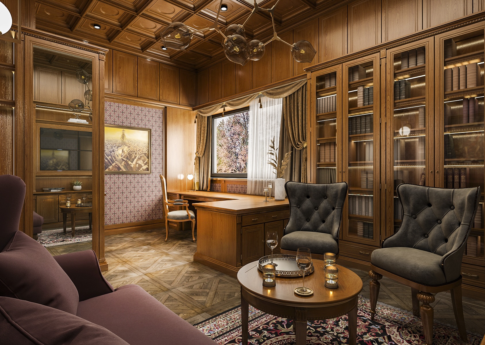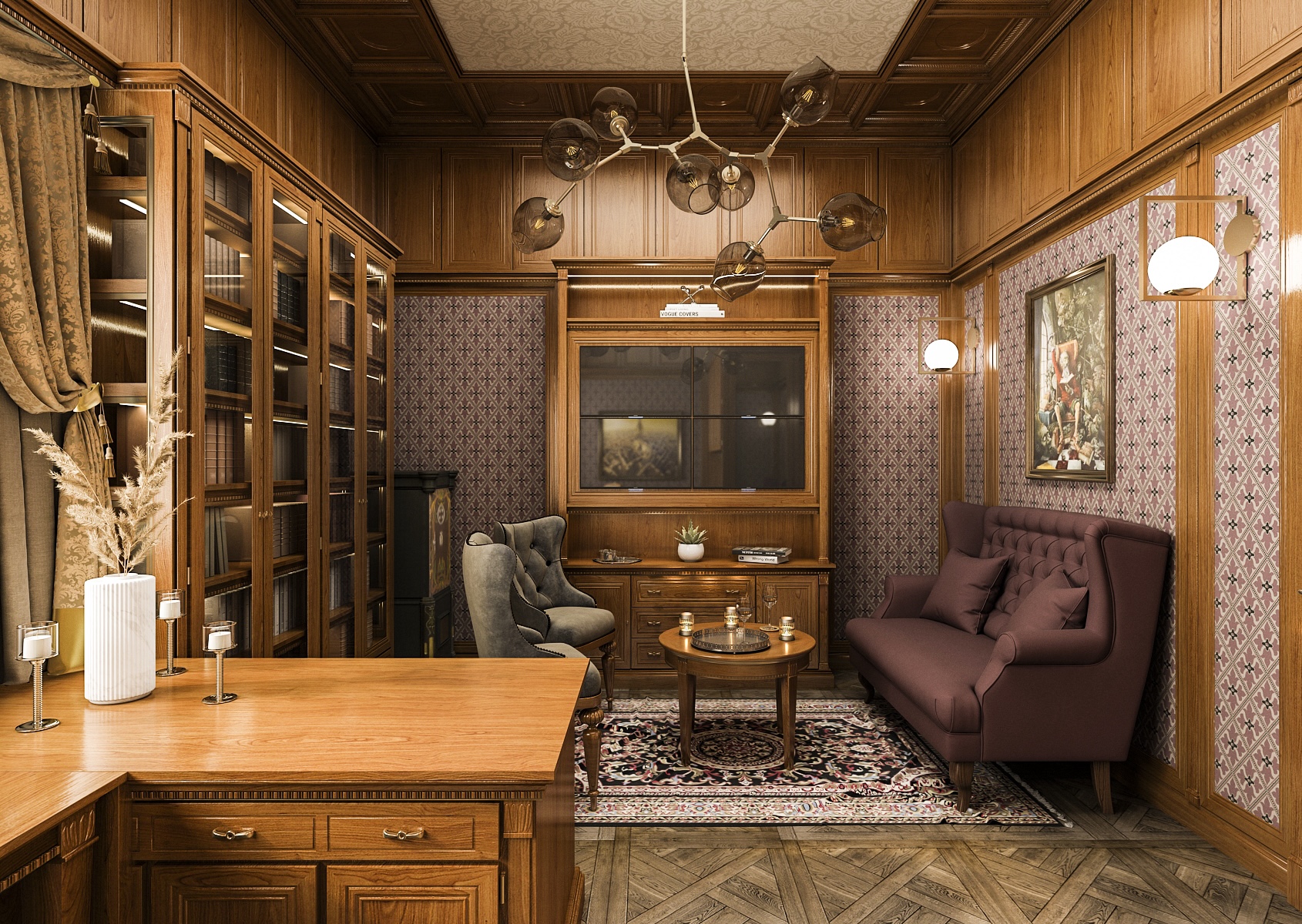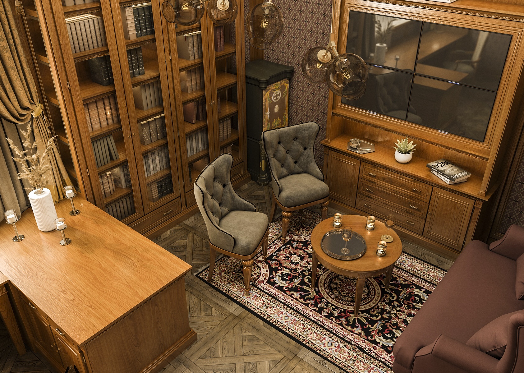 Overall, the interior creates a harmonious harmony between functionality and aesthetics, which is ideal for anyone looking for a place to work productively or study quietly. The parquet floor adds to the complexity of the design and, together with the richly patterned carpet, completes the luxurious look of the room. This study is suitable for those who appreciate craftsmanship and classic style.