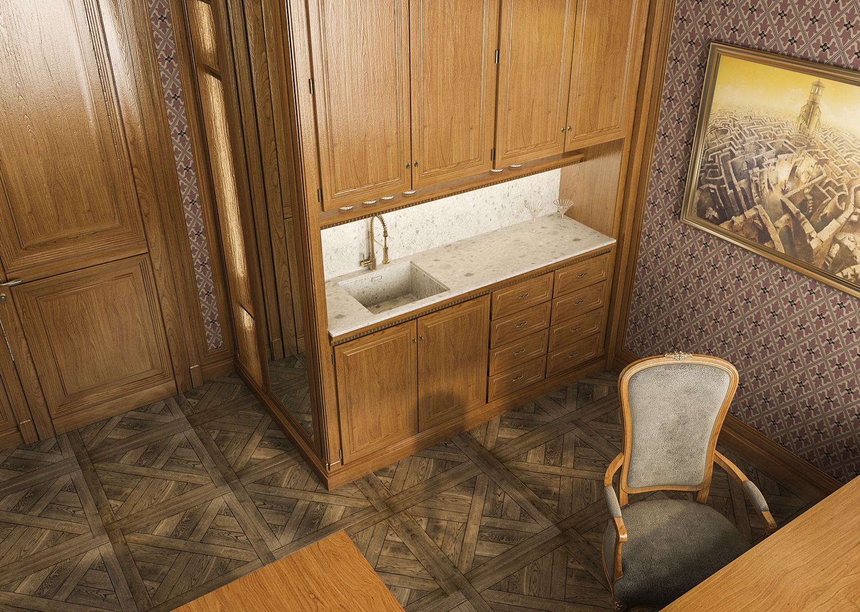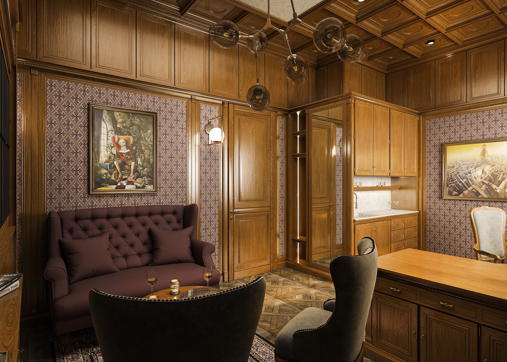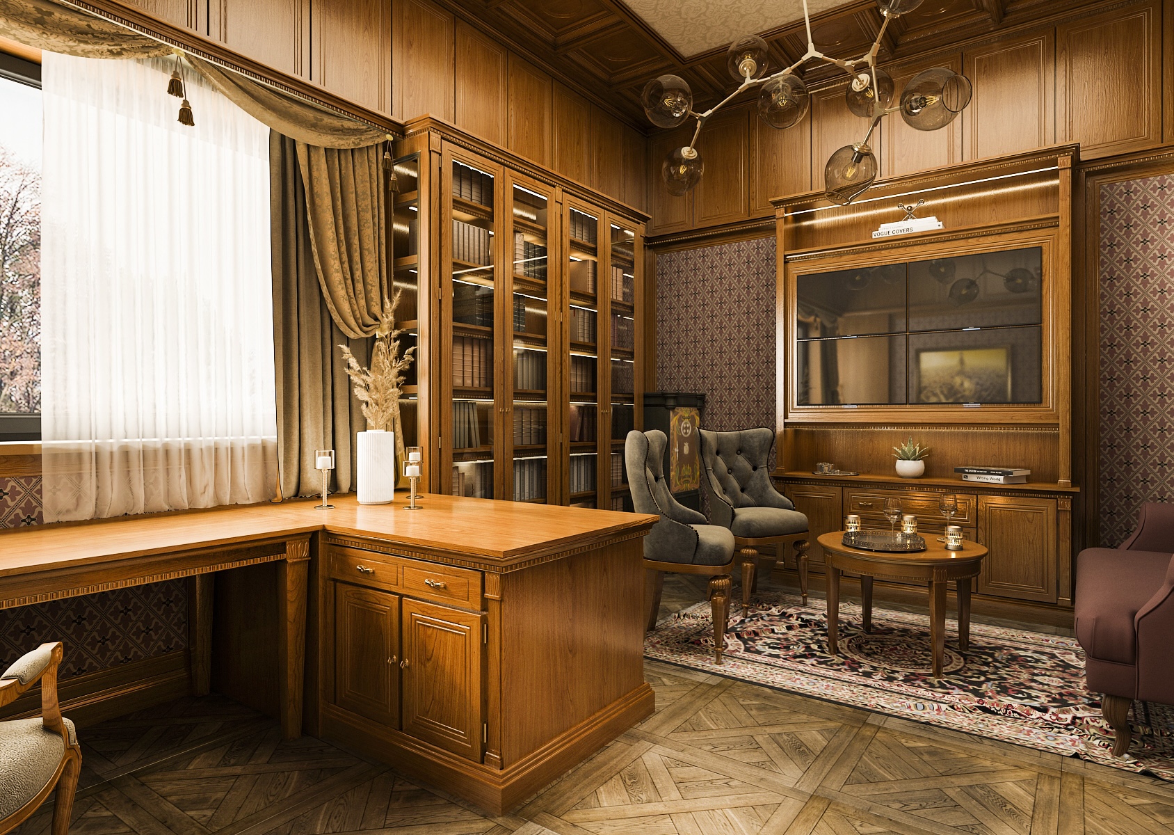 Overall, the interior creates a harmonious harmony between functionality and aesthetics, which is ideal for anyone looking for a place to work productively or study quietly. The parquet floor adds to the complexity of the design and, together with the richly patterned carpet, completes the luxurious look of the room. This study is suitable for those who appreciate craftsmanship and classic style.