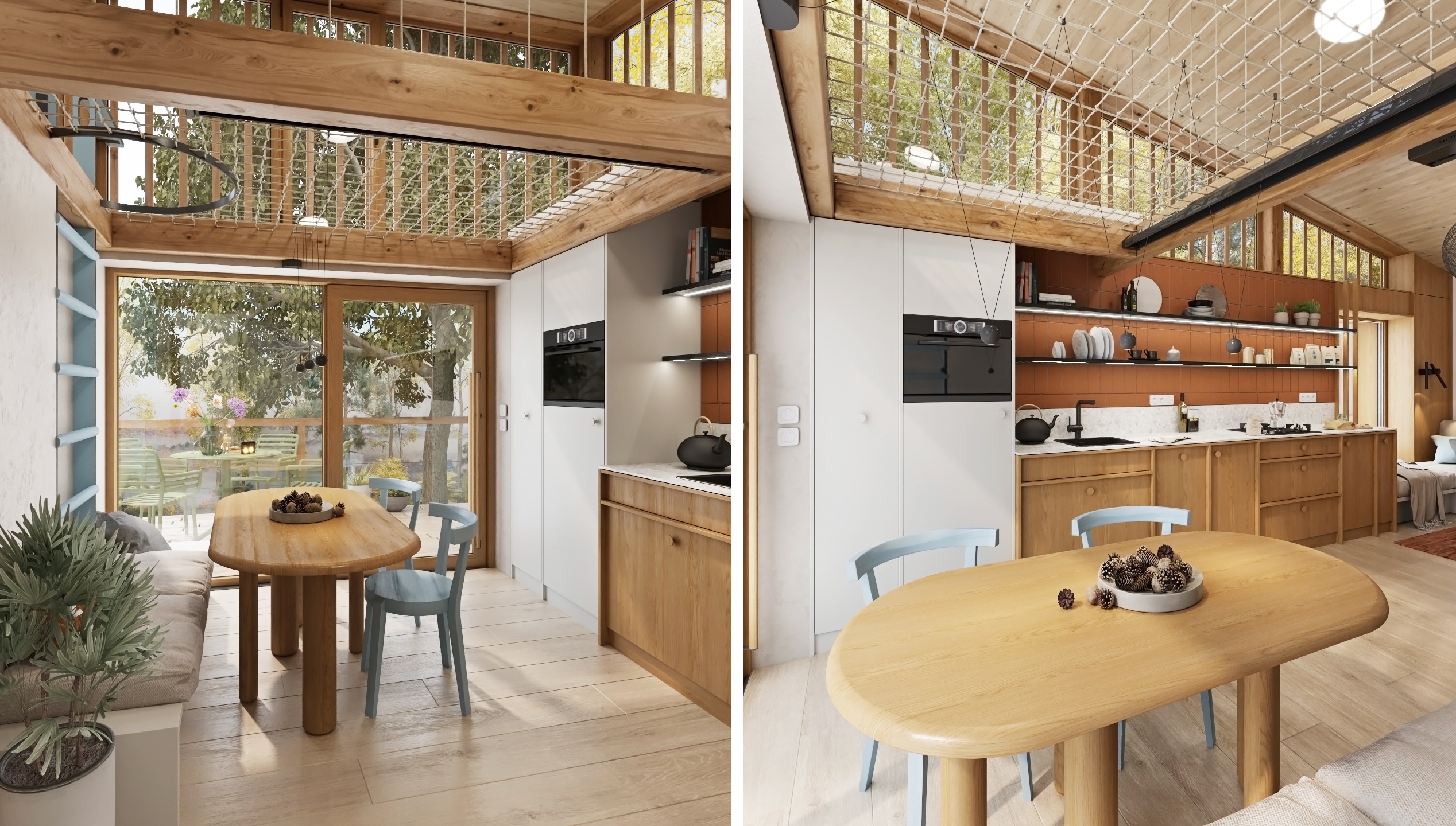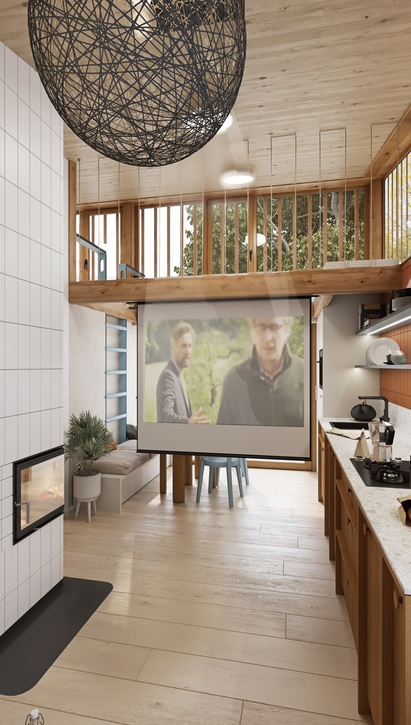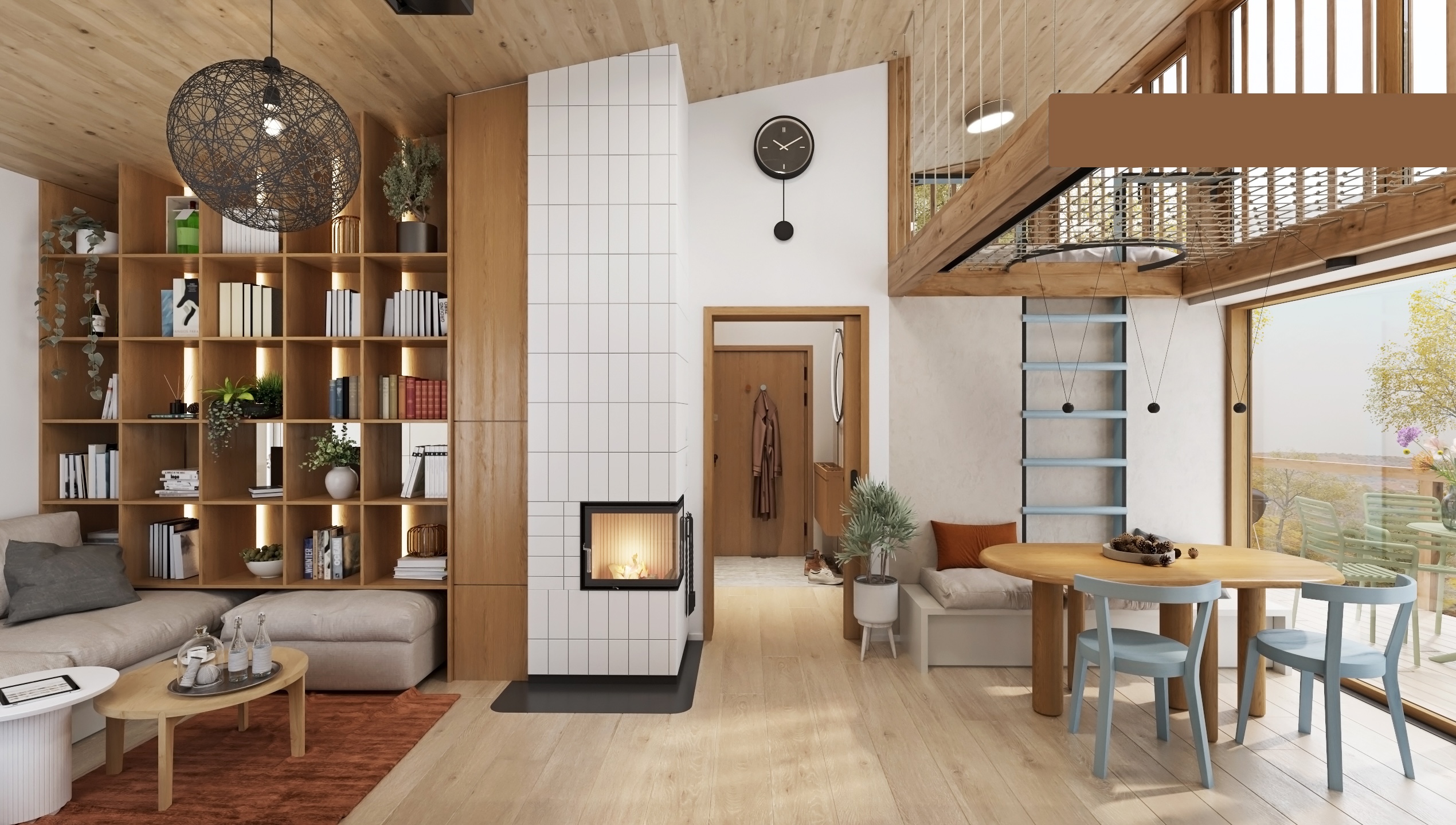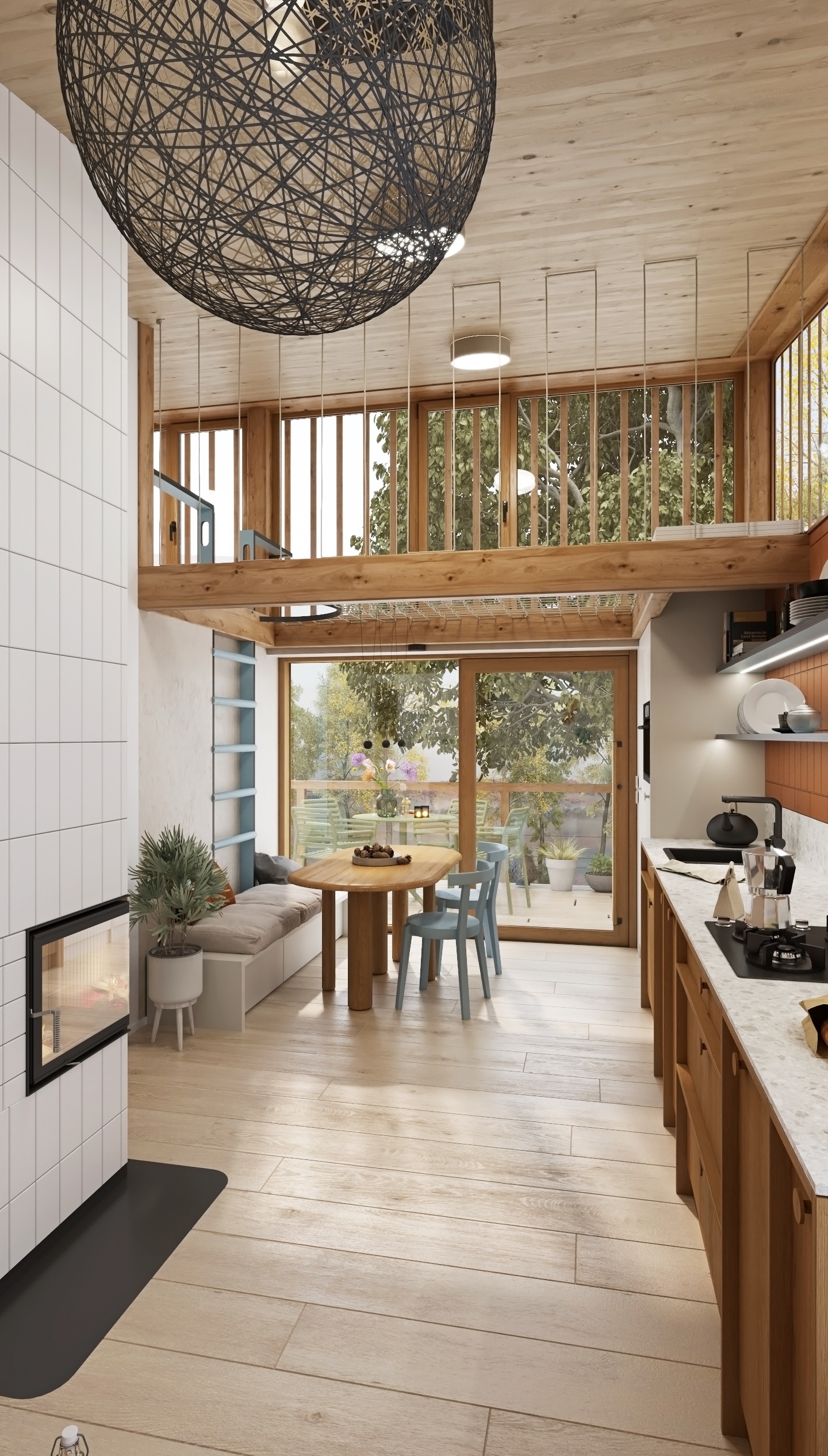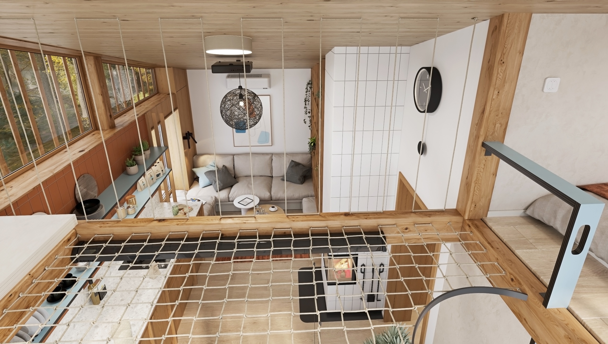 The layout is designed with an emphasis on fluidity and functionality. The open kitchen flows into the living area with a comfortable couch, while the fireplace gently separates the individual zones and becomes the central element of the space. A net extends above the dining area, which not only brings visual playfulness, but also additional space for relaxation.