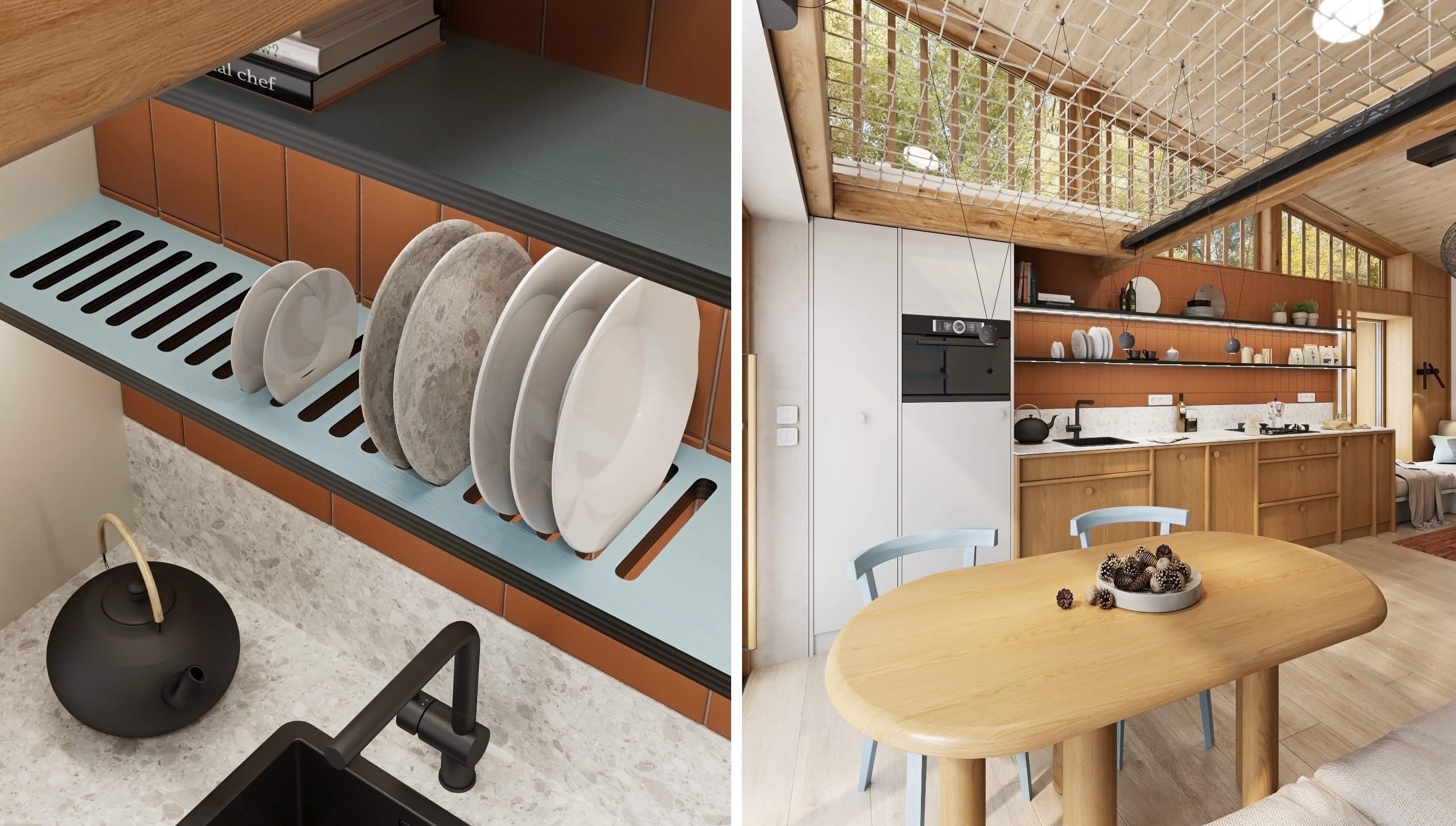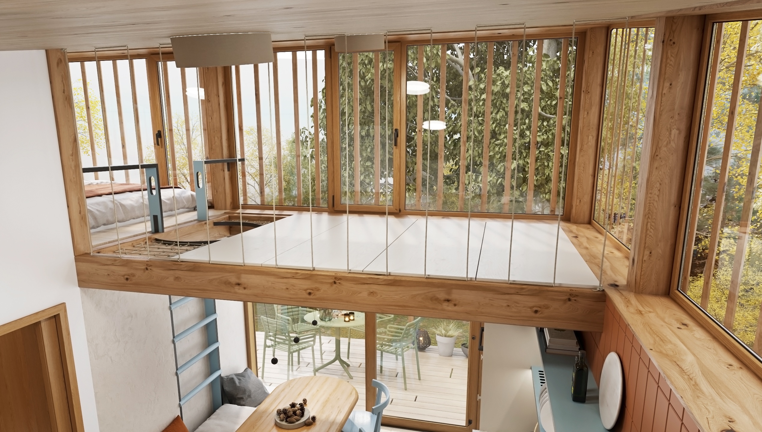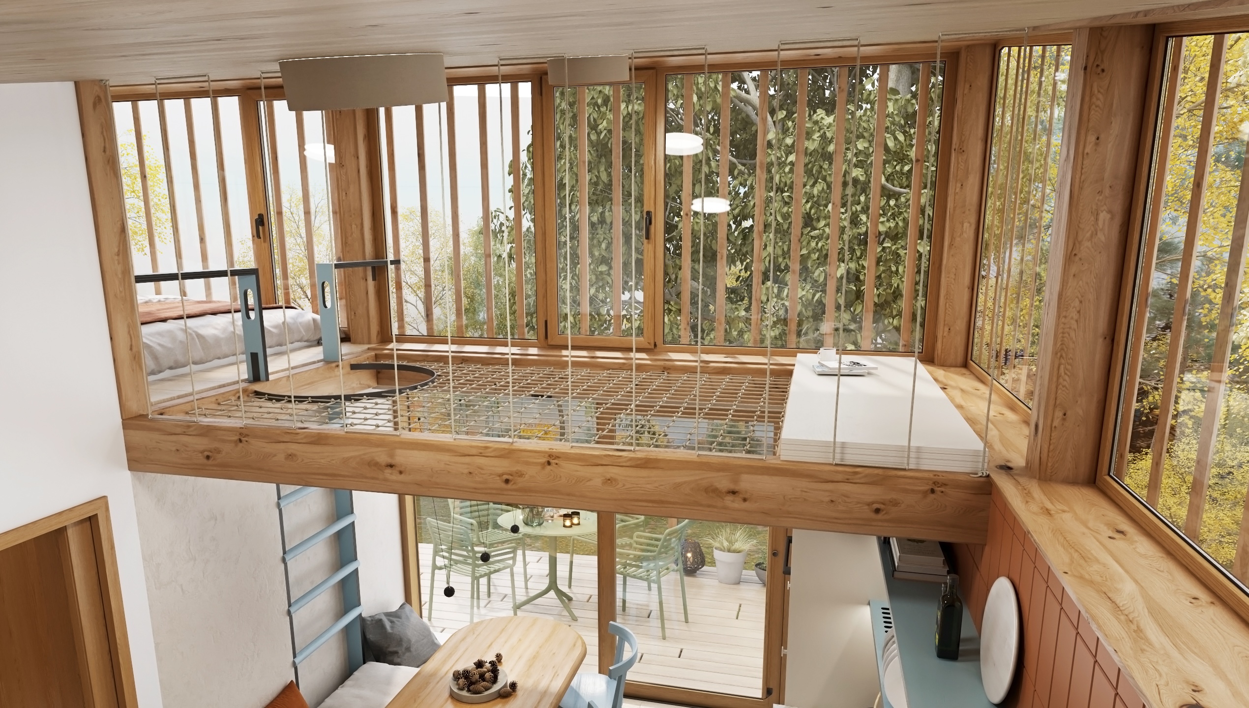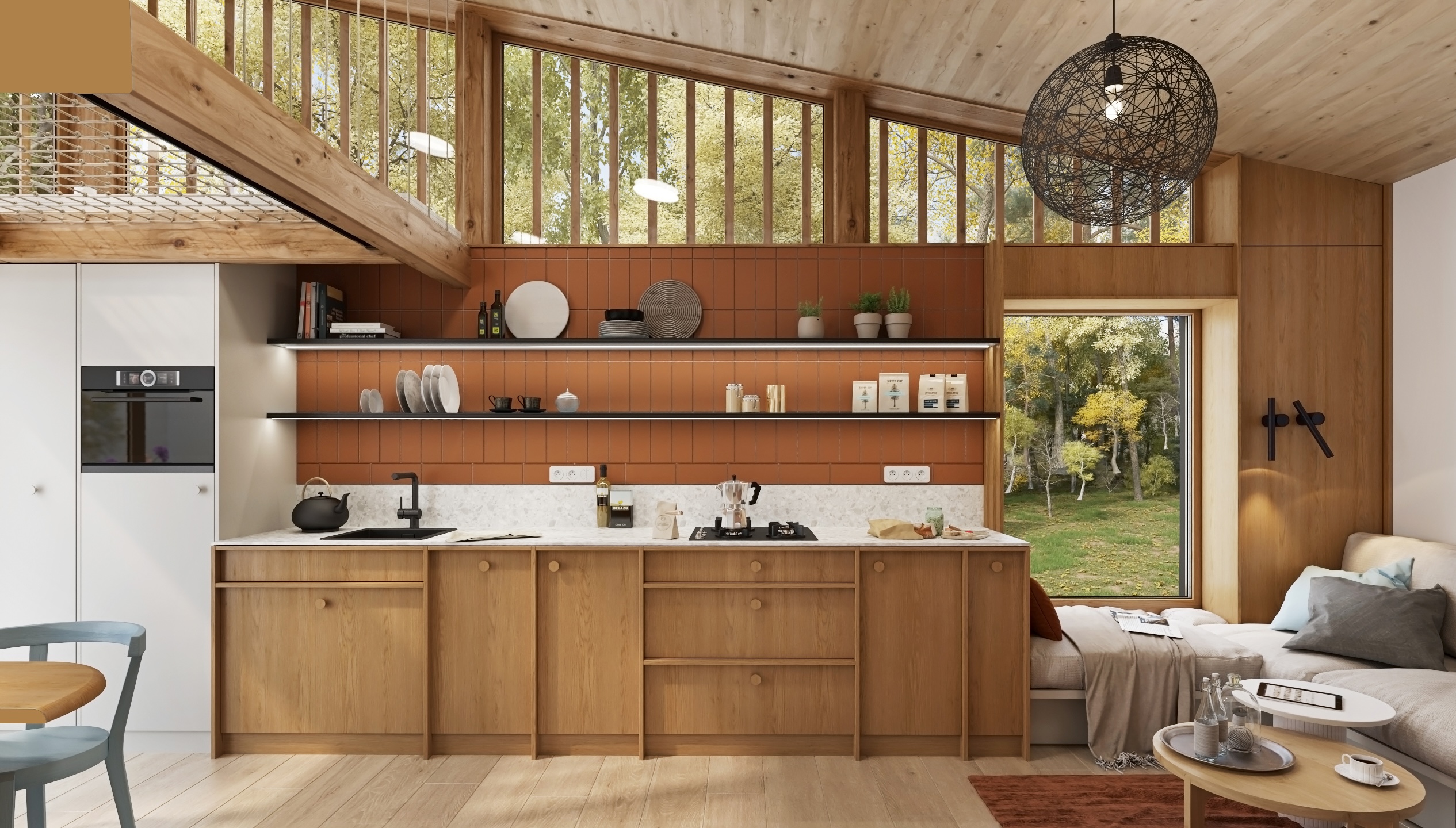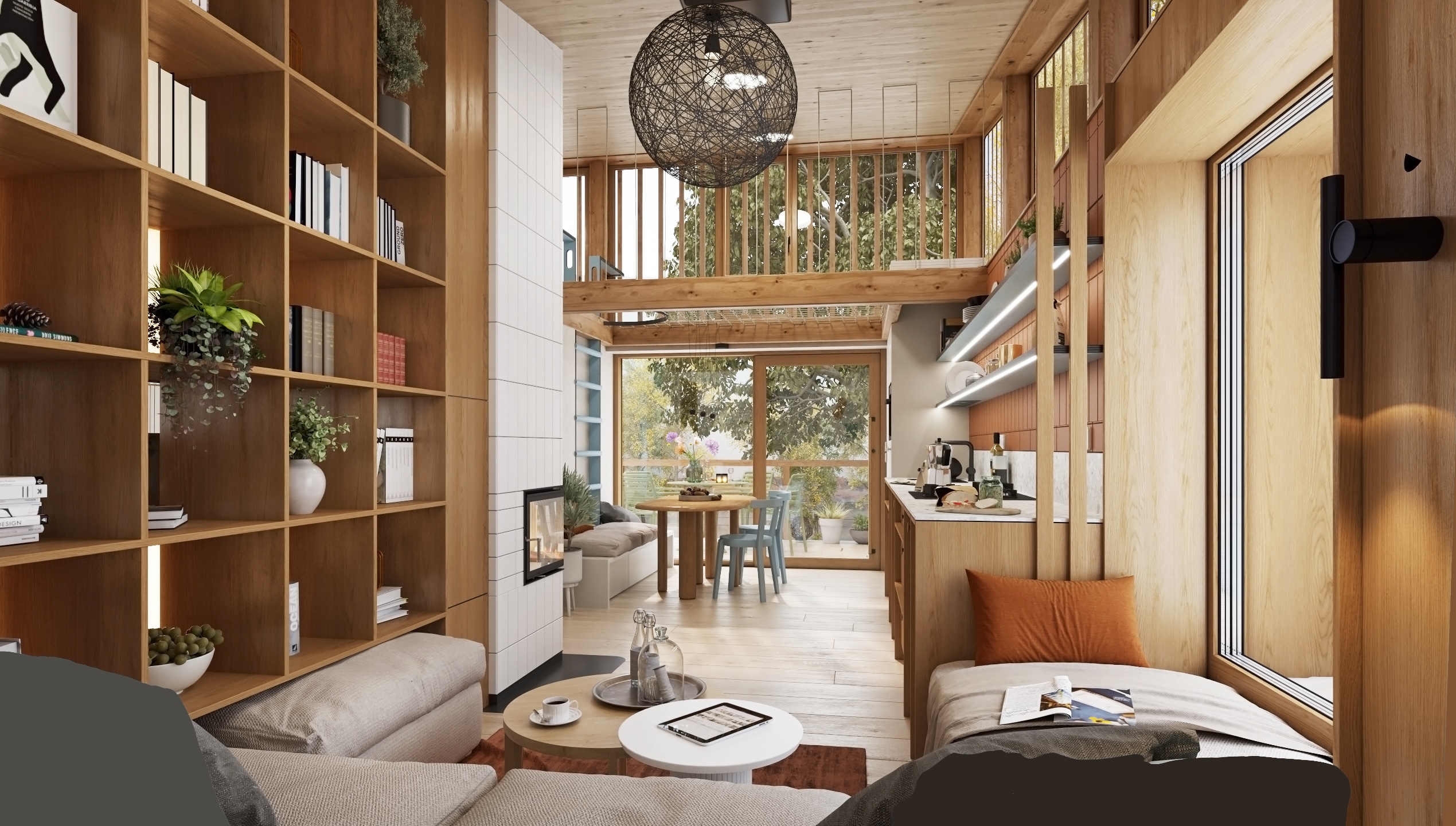 The layout is designed with an emphasis on fluidity and functionality. The open kitchen flows into the living area with a comfortable couch, while the fireplace gently separates the individual zones and becomes the central element of the space. A net extends above the dining area, which not only brings visual playfulness, but also additional space for relaxation.
