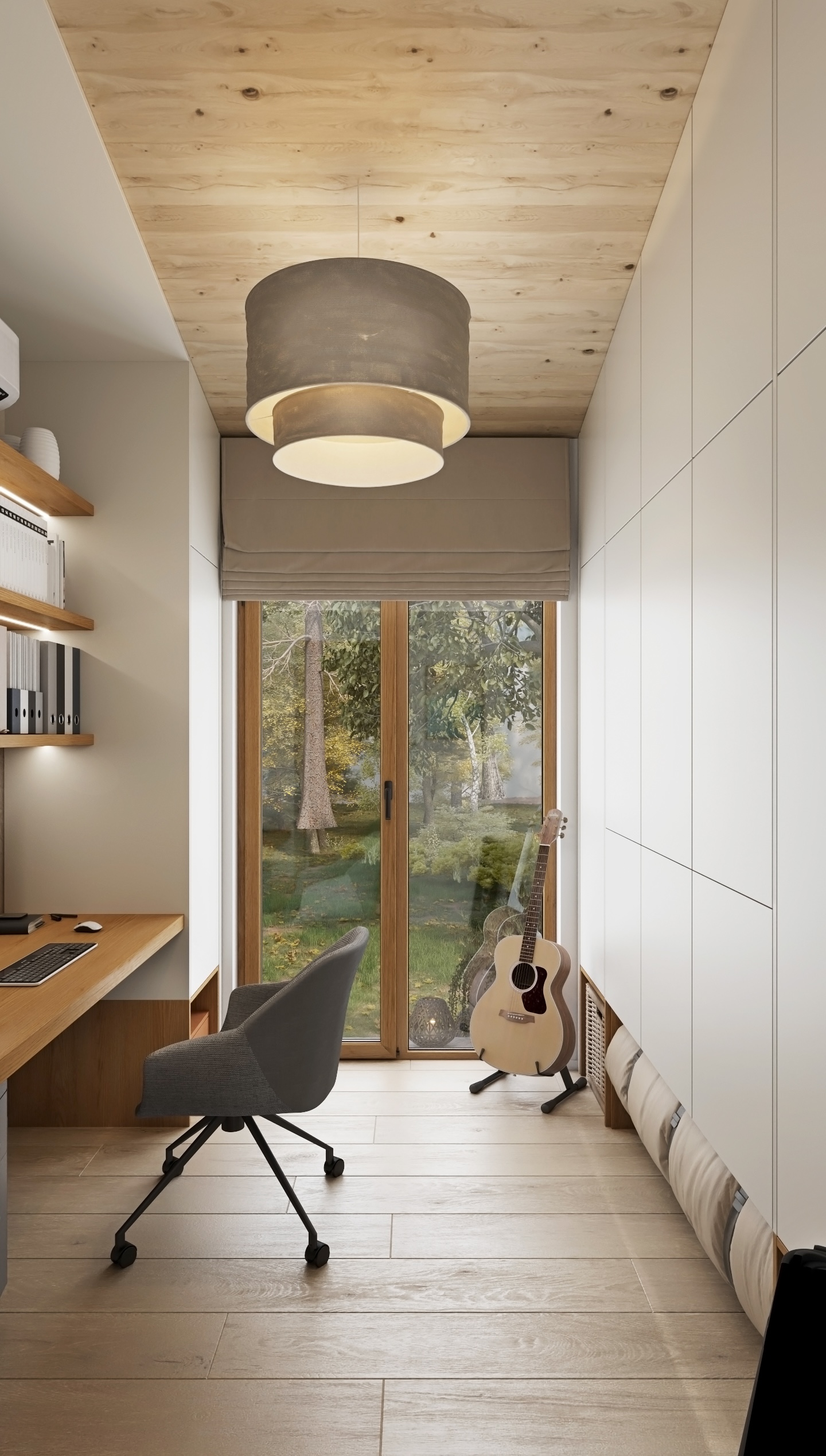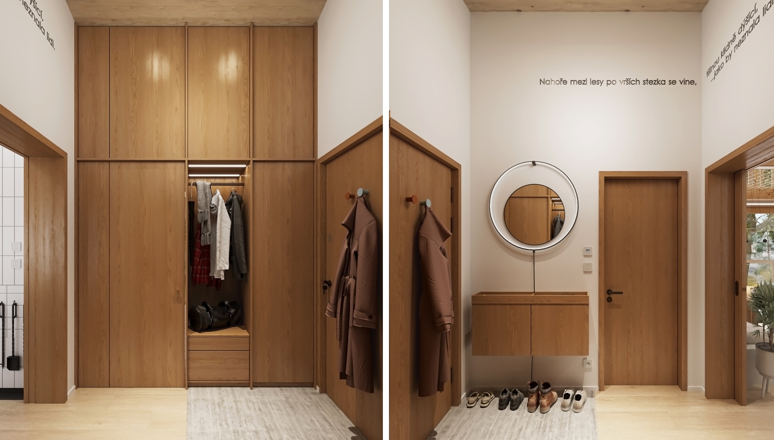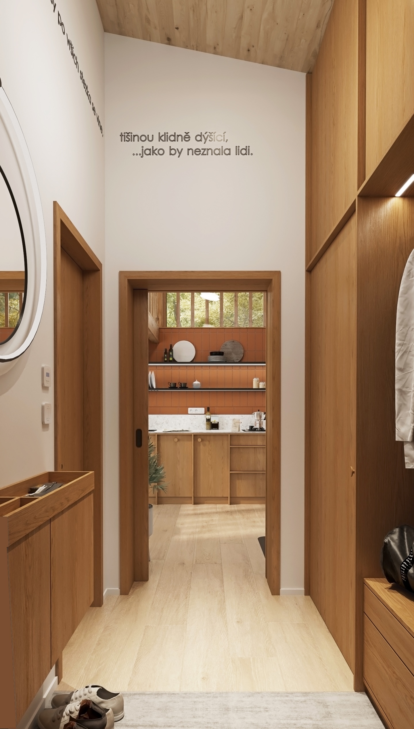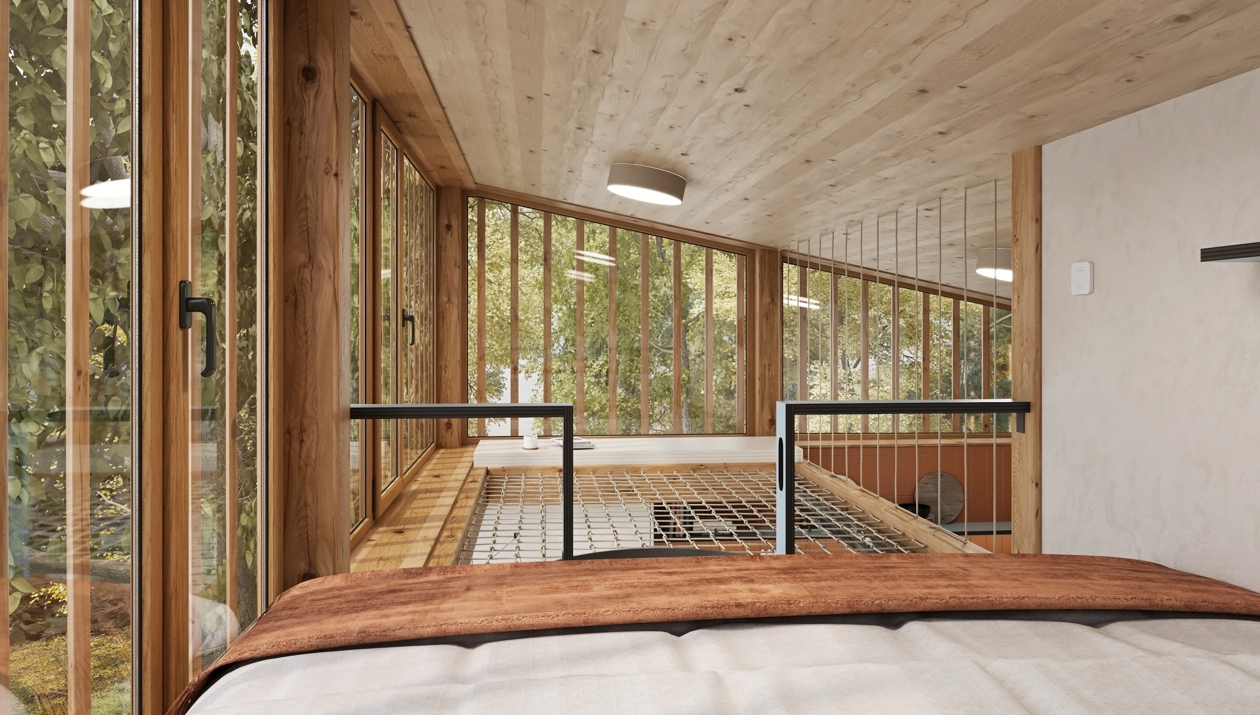Thanks to the large glass surfaces, plenty of daylight flows inside and the views of the greenery open up, which have a calming effect. The dominant material is light wood, which permeates the entire space – from floor to ceiling – and gives the interior a natural warmth and visual purity.