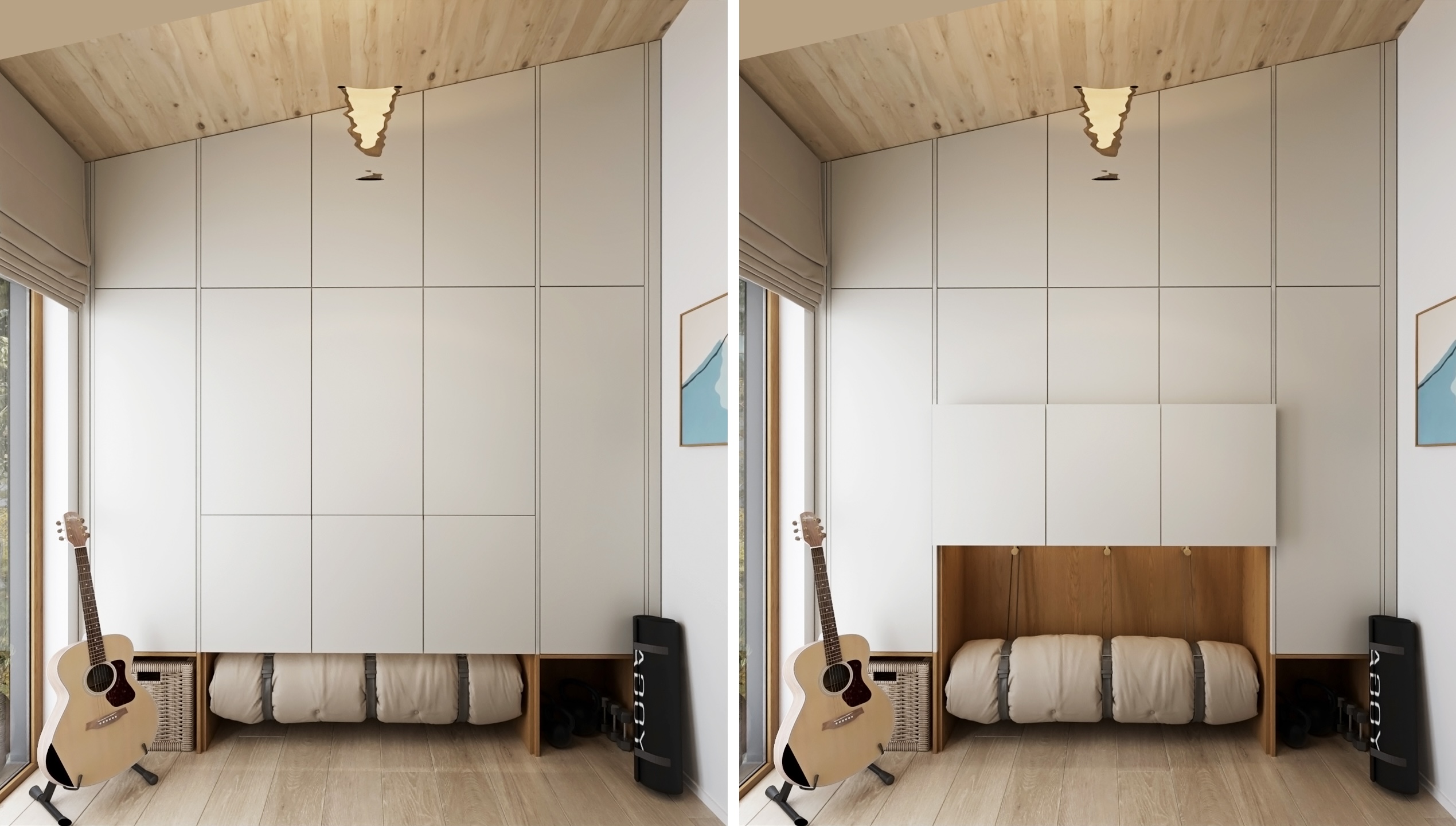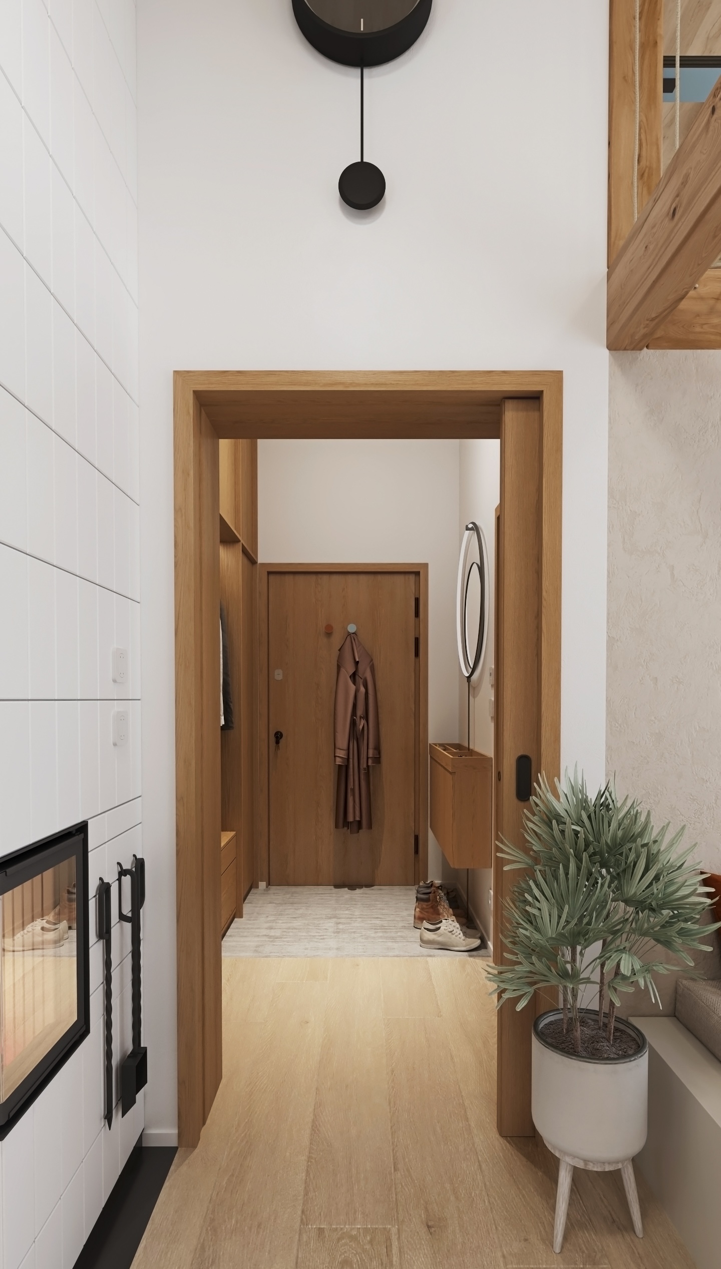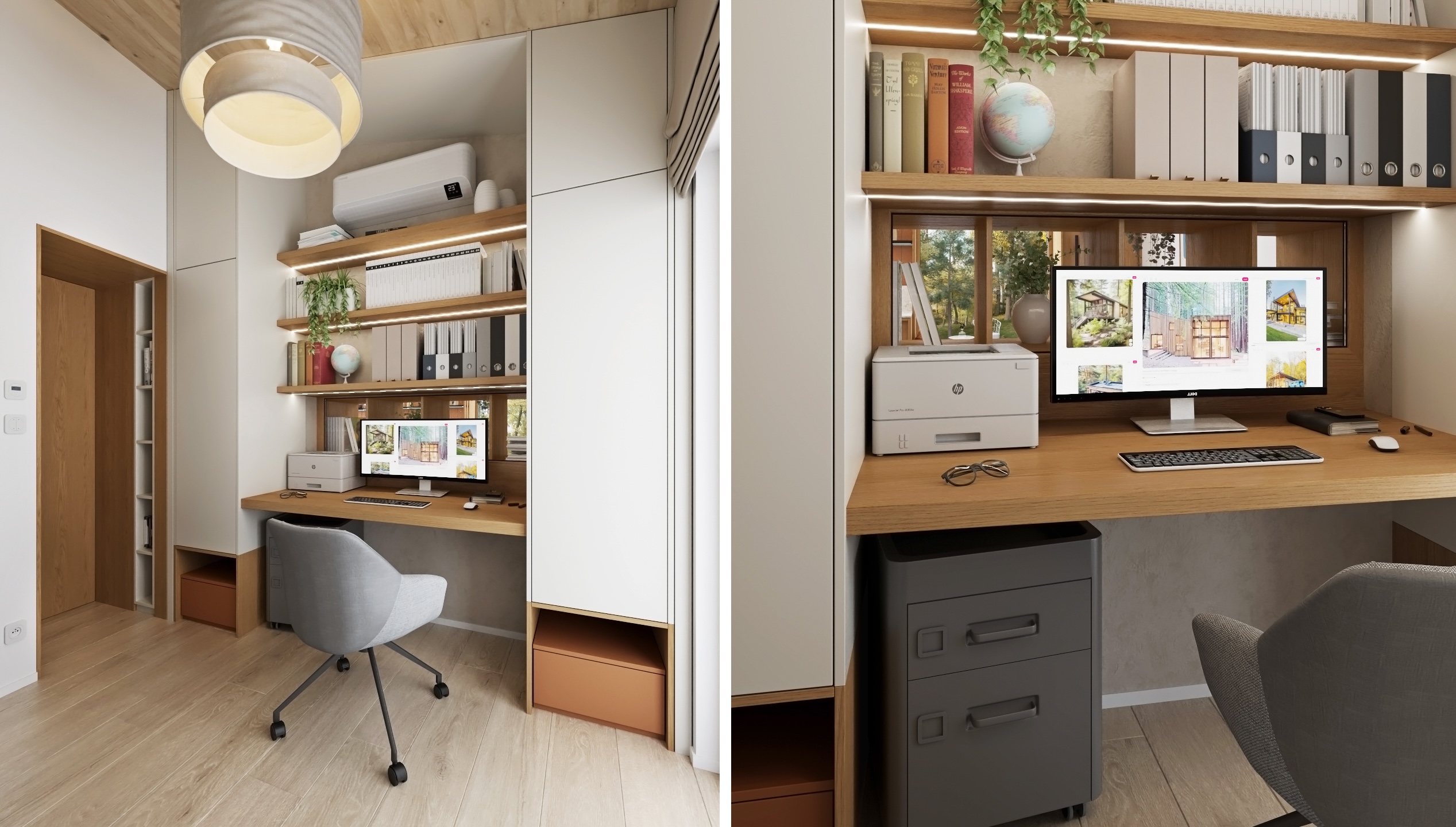 The whole is completed by subtle but striking details - an open library full of books and plants, graphic paintings, discreet textiles in earthy tones and ingenious lighting. The result is an interior that feels cozy, homely, yet modern and airy.