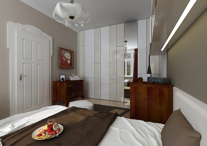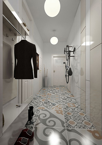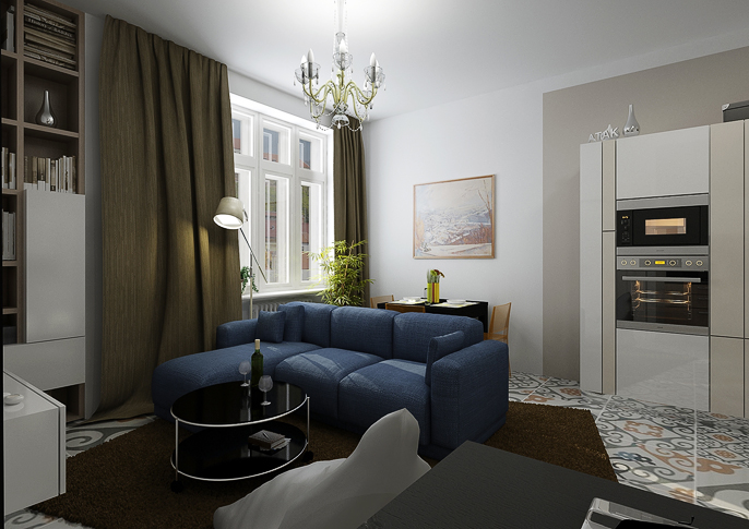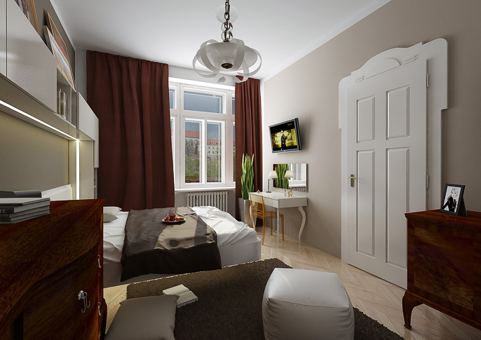 Reconstruction of a spacious apartment with high ceilings in an old building is solved in a traditional style variation, with the use of combination of modern materials and the original furniture in colors of white, creme and brown. There's a large formate tile with historic pattern of various scale on the flooring. The new furniture is made of glossy laminate.