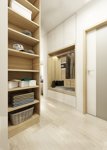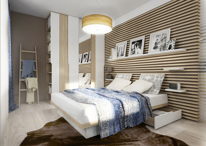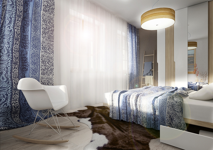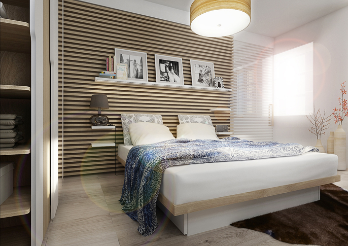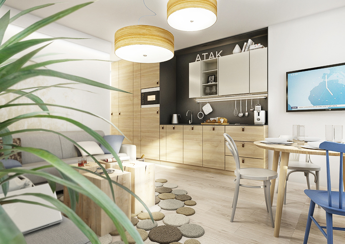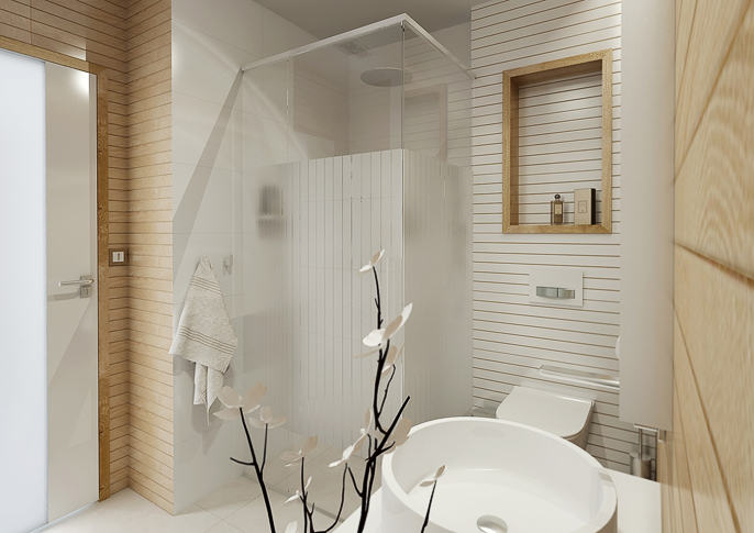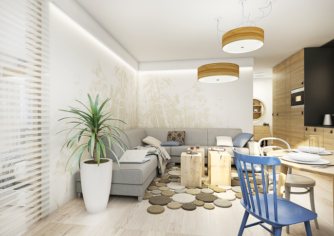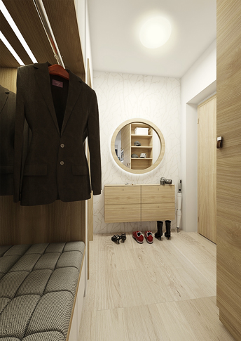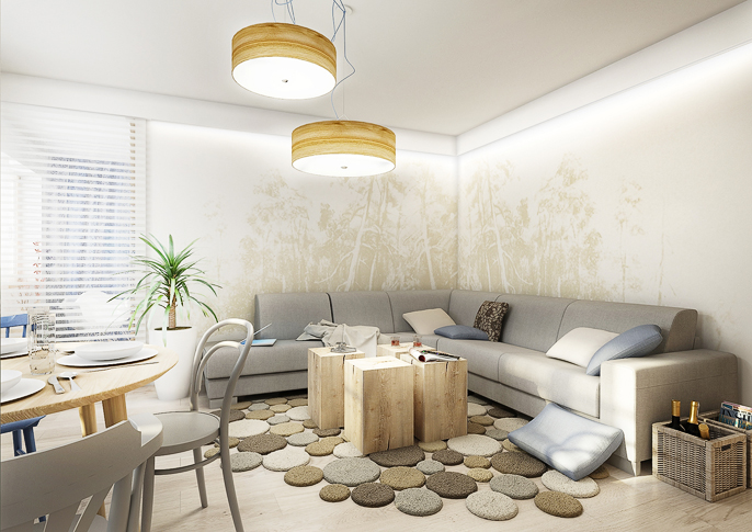 Interior design of a ski apartment in northern Moravia. The interior is decorated in light color of white, beige and light oak wood decor, which is complemented by an accent of anthracite and blue. The living room is enhanced with a carpet formed by circles in earthy colors. The tiles in the bathroom give the impression of a modern interior, yet comfortable.