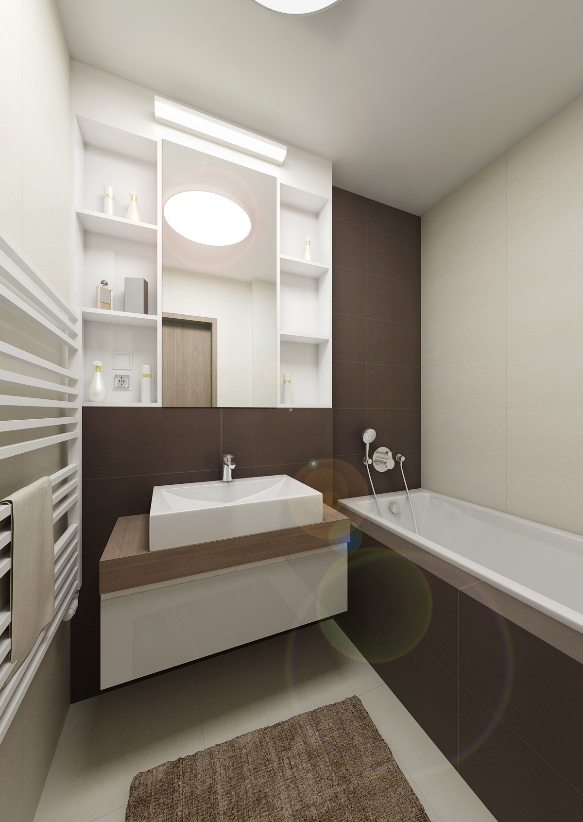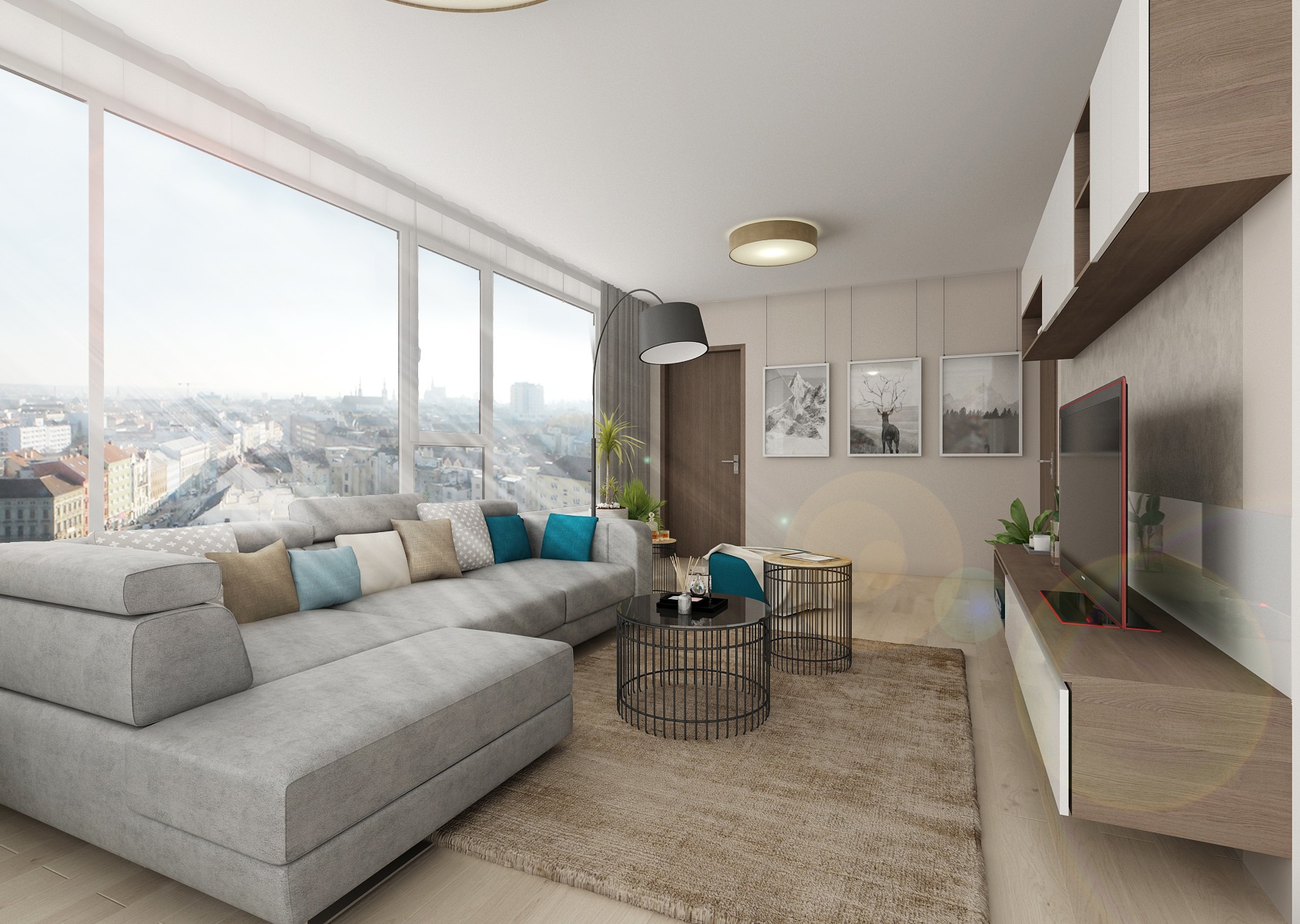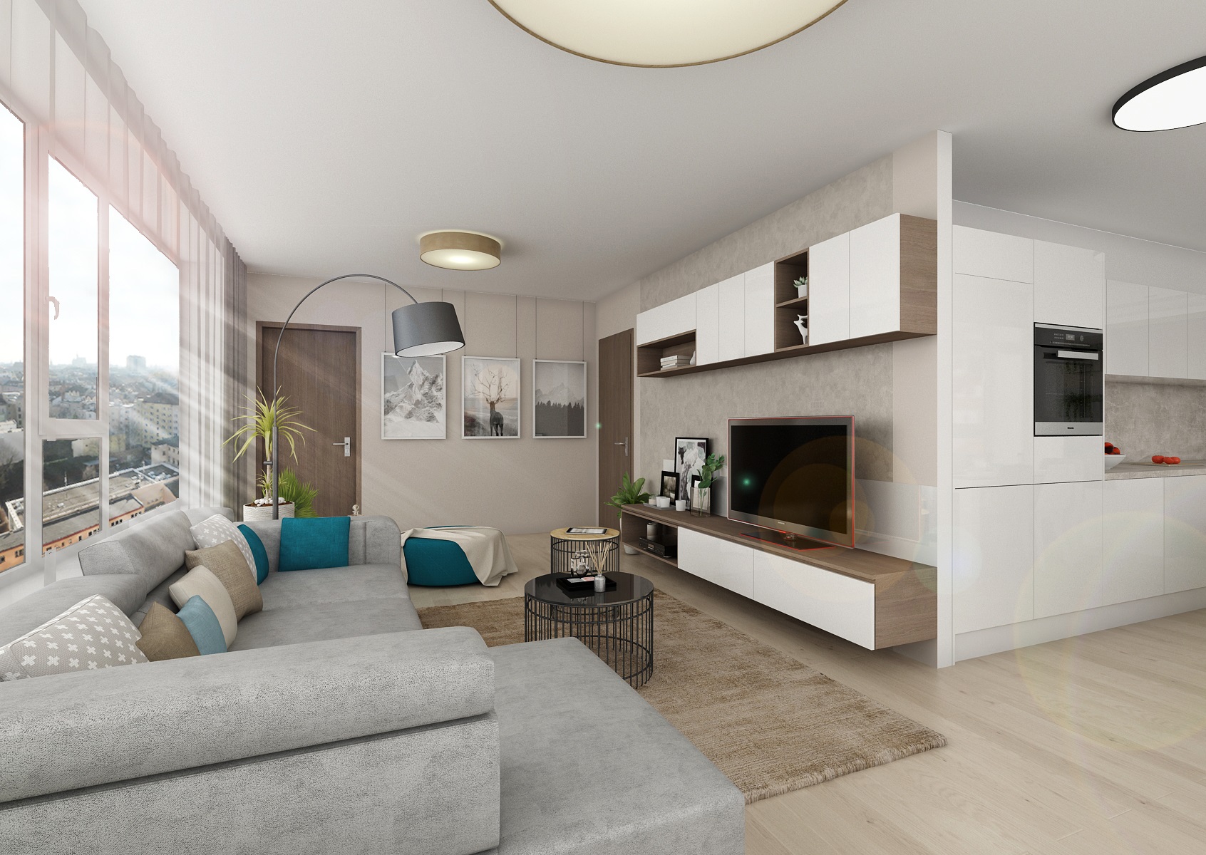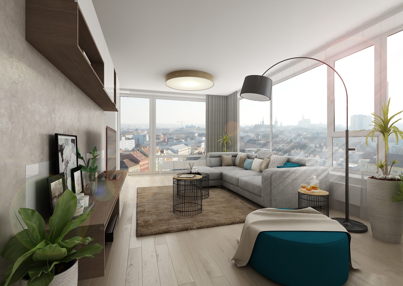 Rental apartment with a view of the city is near the center and near Lužánecký park. The people of no certainly know. The layout of the apartment is in the shape of the letter L, which allowe a view of the surroundings from the living room, kitchenette and bedroom. The apartment will be used for rent, and therefore the neutral color scheme was chosen. Only to reviev with a few turquoise contrasts. The furniture is made to measure from melamine boards with an ABS edge.
