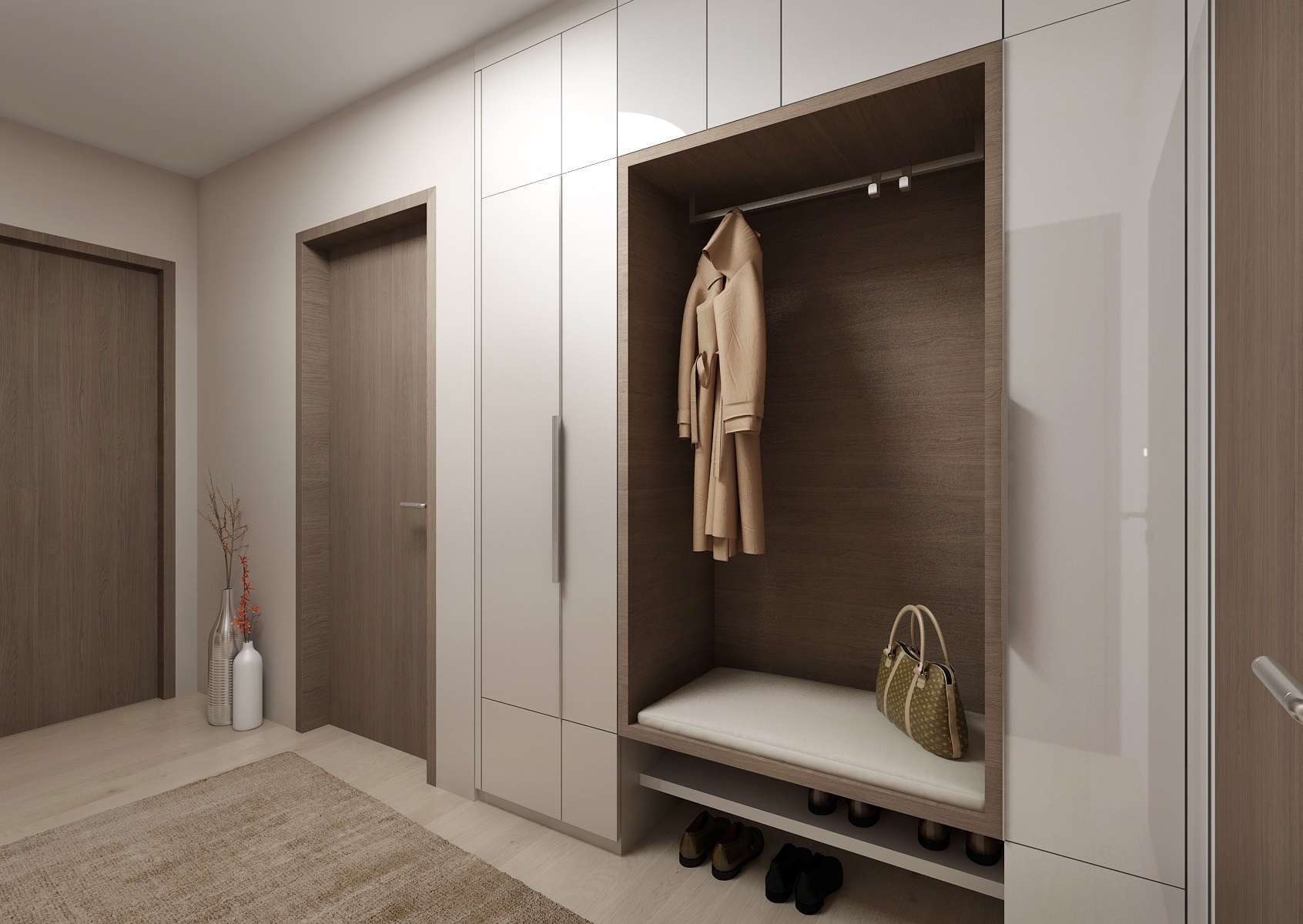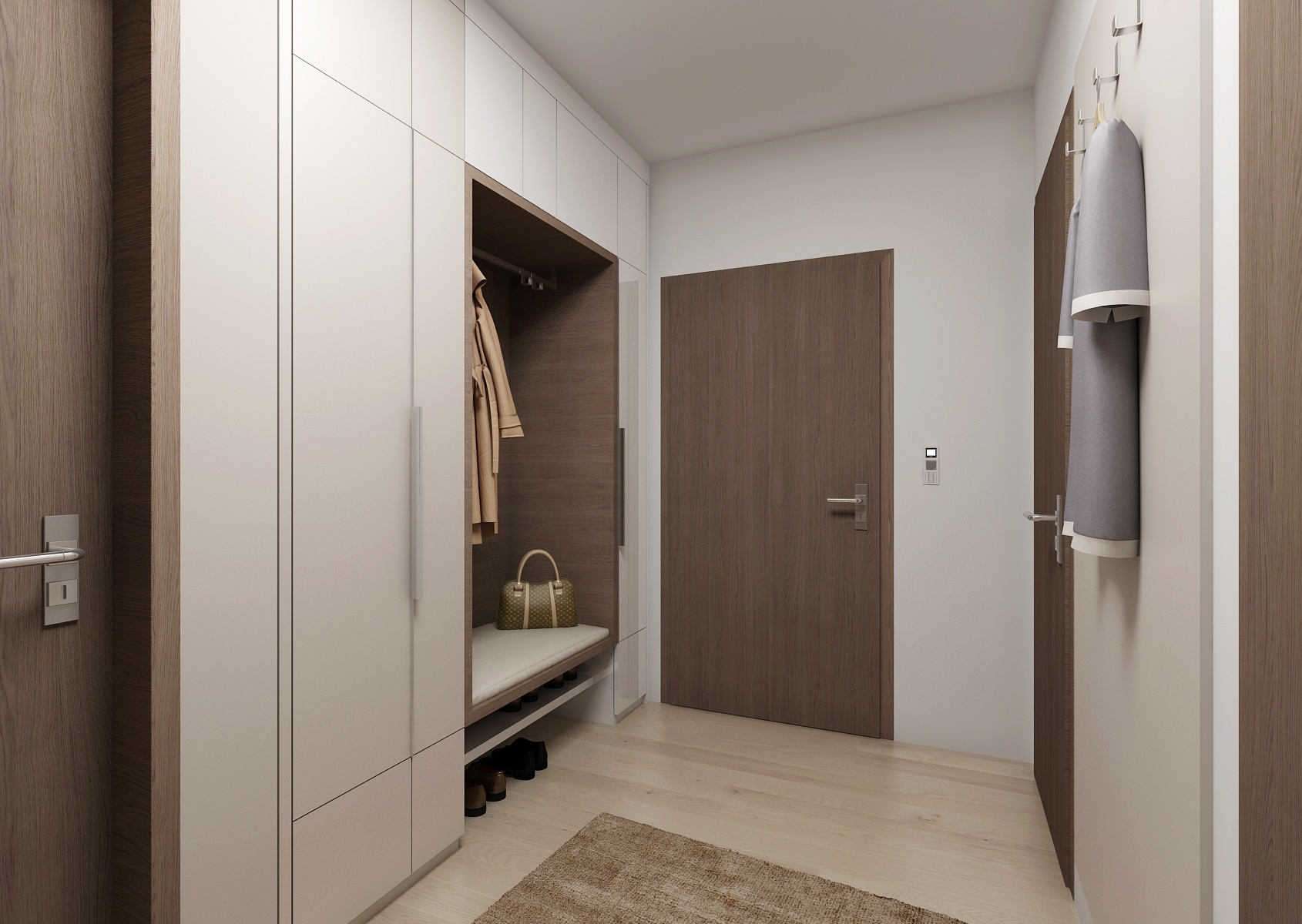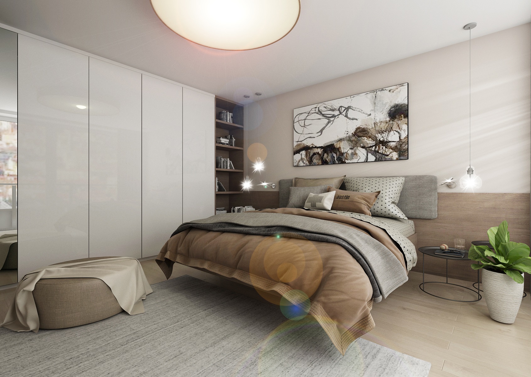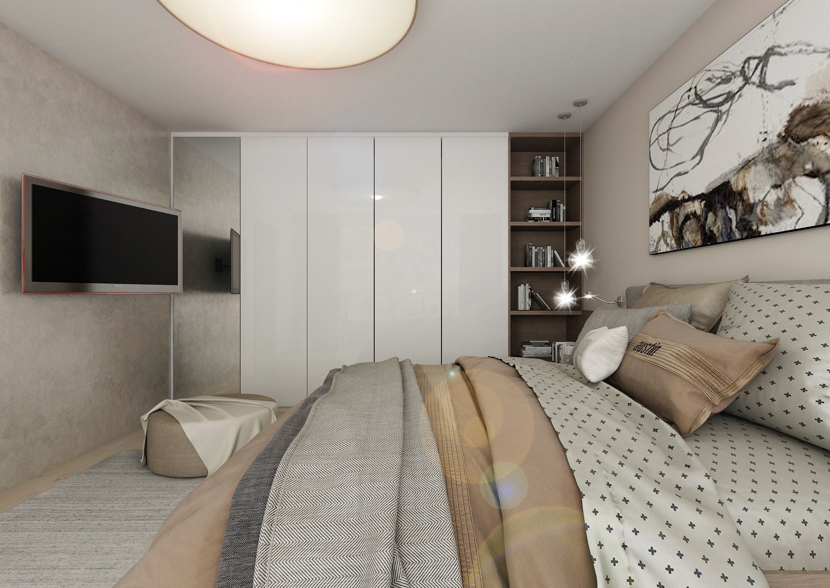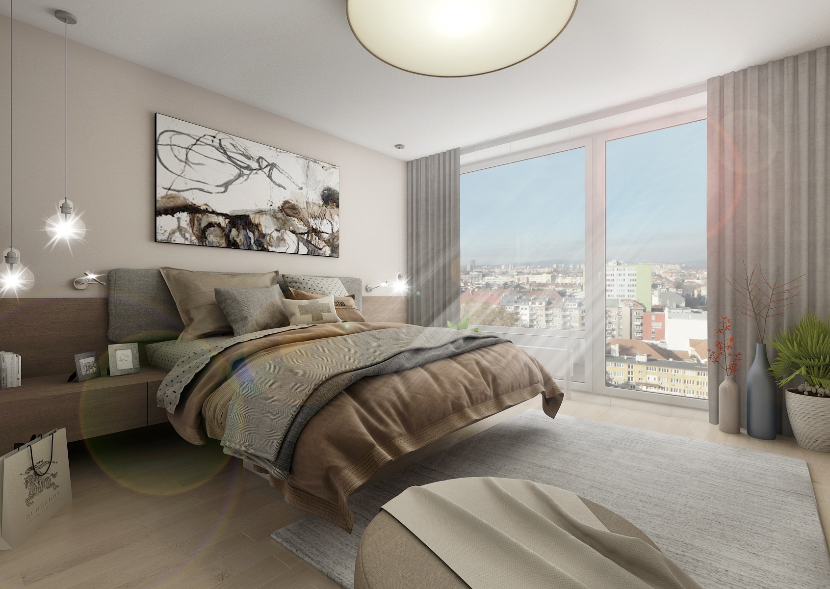 Rental apartment with a view of the city is near the center and near Lužánecký park. The people of no certainly know. The layout of the apartment is in the shape of the letter L, which allowe a view of the surroundings from the living room, kitchenette and bedroom. The apartment will be used for rent, and therefore the neutral color scheme was chosen. Only to reviev with a few turquoise contrasts. The furniture is made to measure from melamine boards with an ABS edge.