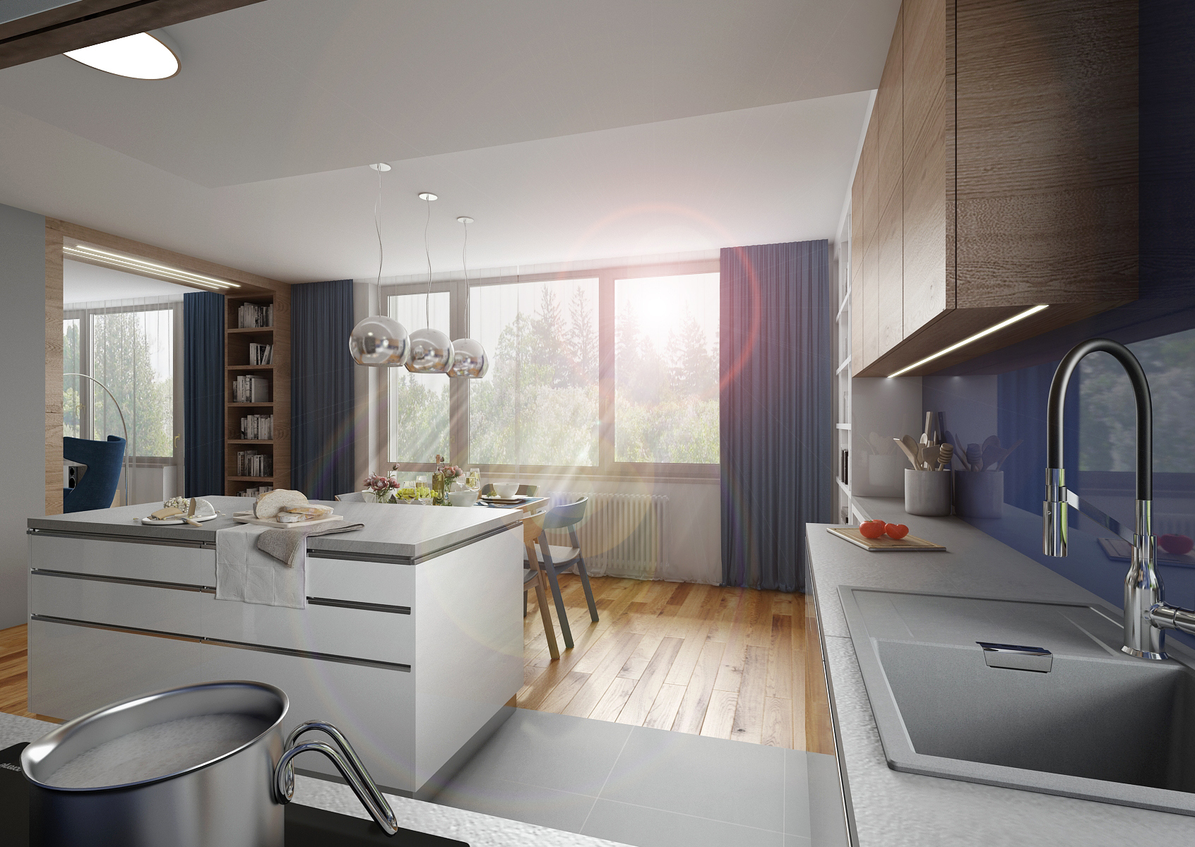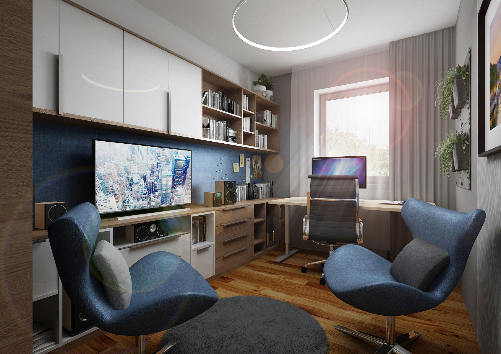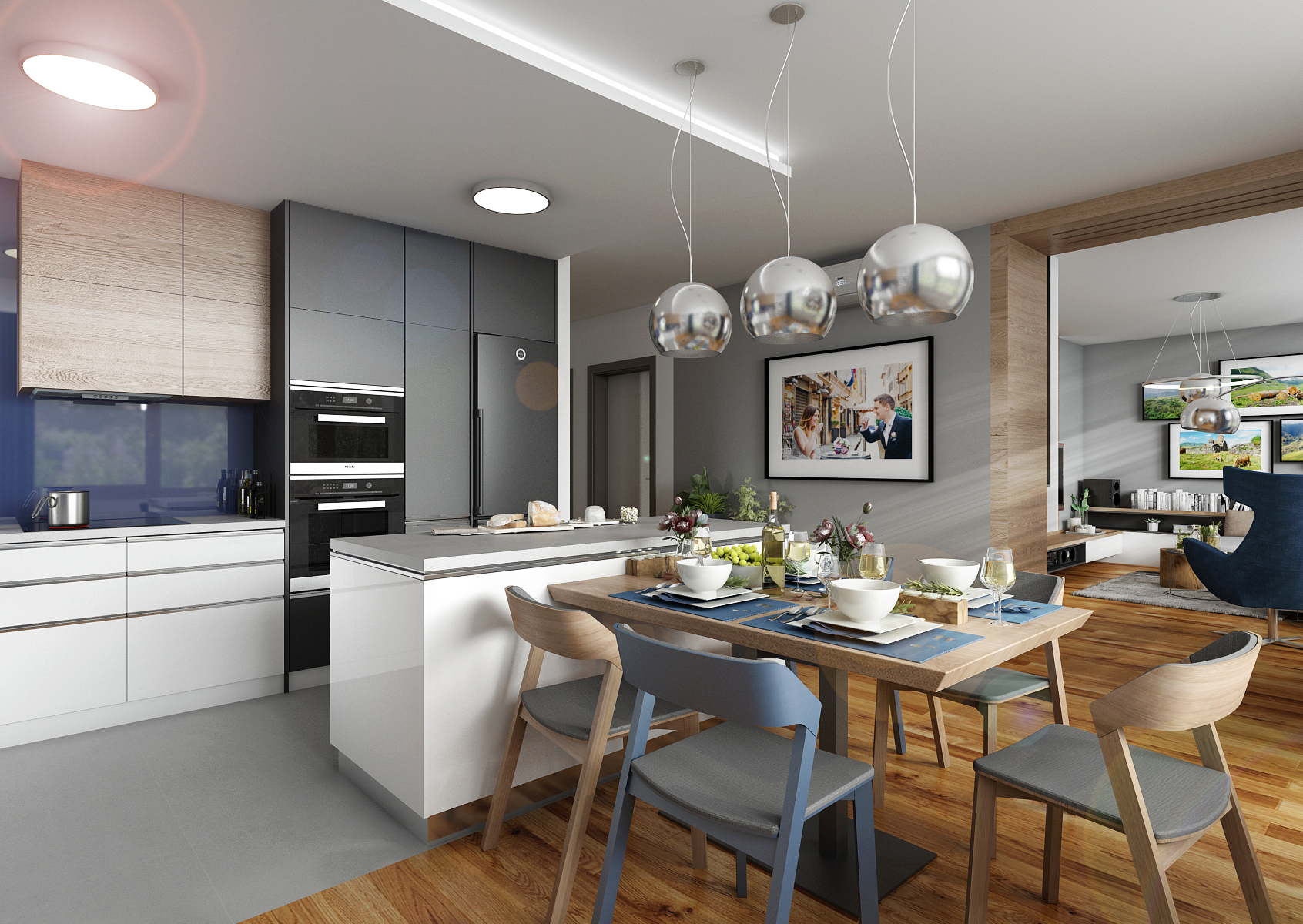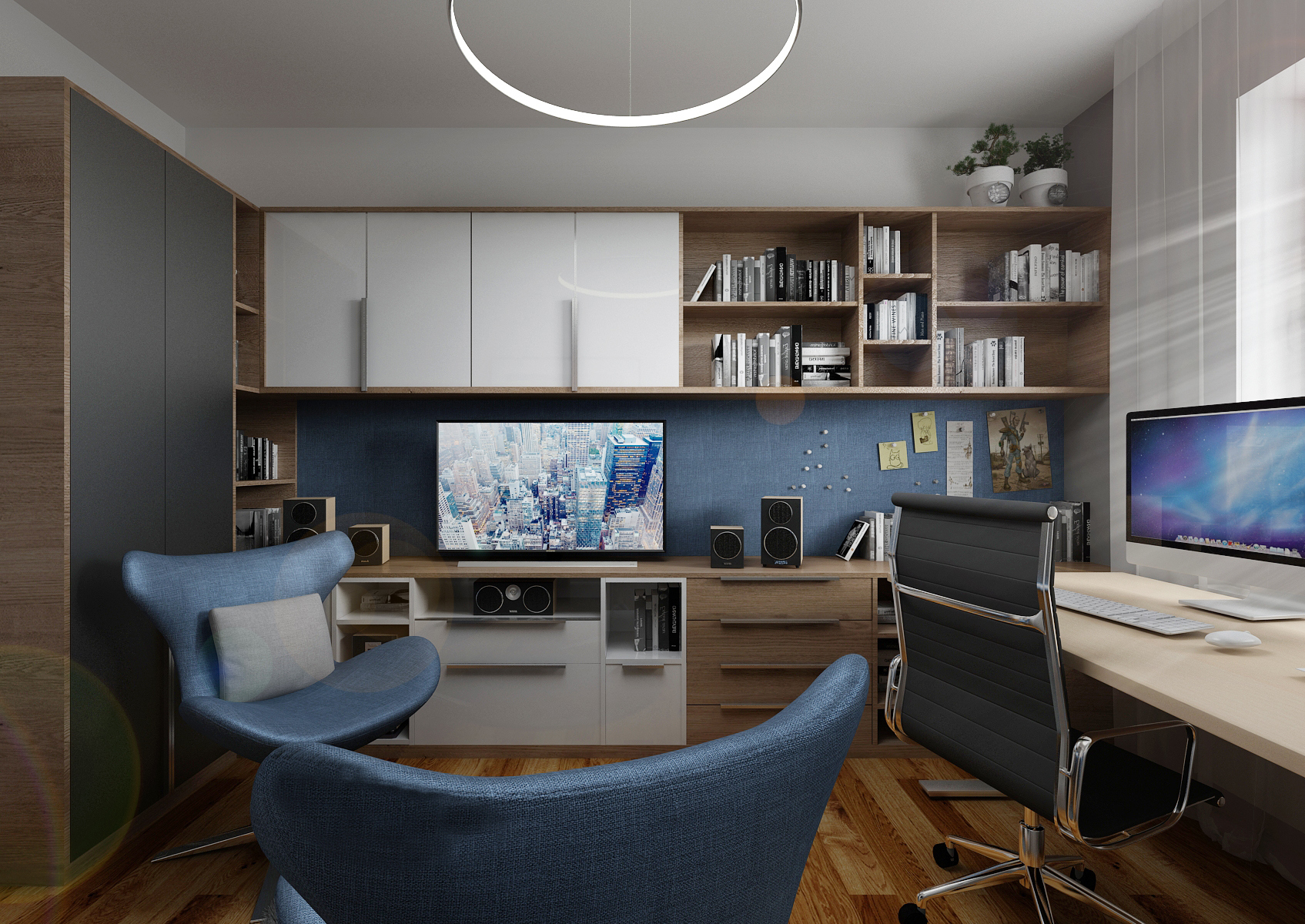 The blue Lacobel glass was used not only as a lining behind the kitchen unit, but also in the background of the office. The glass surface is magnetic and can be used as a notice-board. Together with the brown-stained oak wood decor, repeating on the kitchen cabinets, wall paneling, TV set and storage furniture in the office, bedroom and hallway, it adds togetherness to the entire apartment. It is completed by other materials such as white and gray tone matt lacquer and a uniform vinyl floor in natural oak decor.